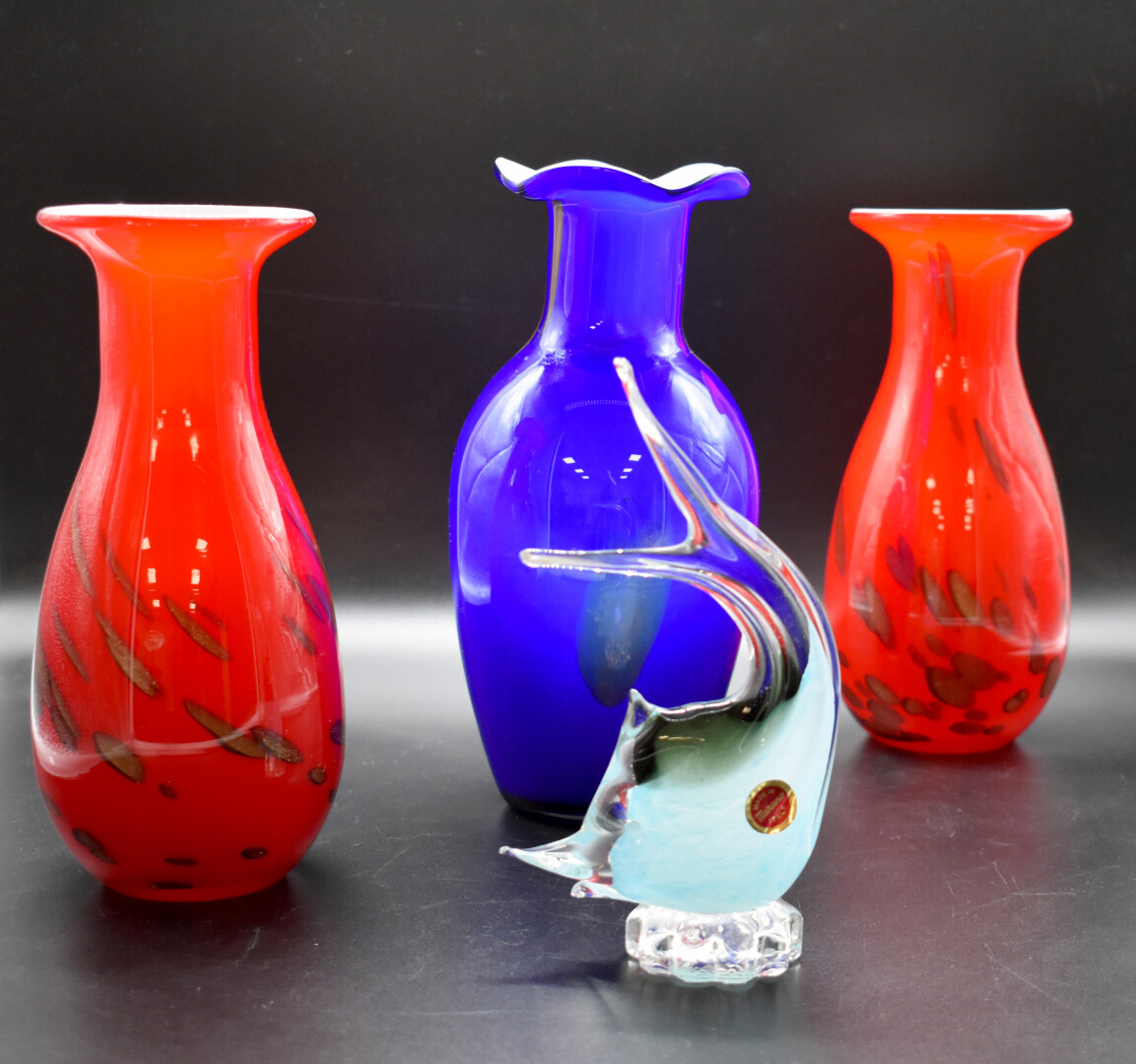Ensemble en verre de Murano soit un espadon, un vase balustre bleu et une paire de vaises ovoïdes rouge à paillons bronze. XXe siècle. Haut. du vase bleu : 24,5 cm.