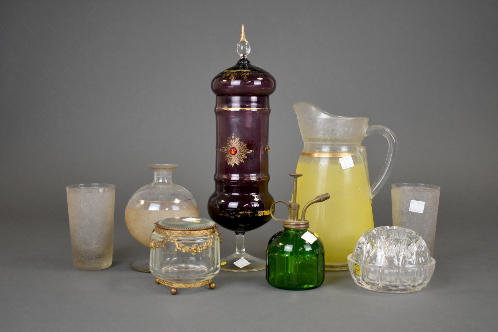 Ensemble en verre dont carafe en verre à cristalisations jaune, pot couvert en verre mauve à décor appliqué de verroterie, pot couvert à monture de laiton, vers 1900.