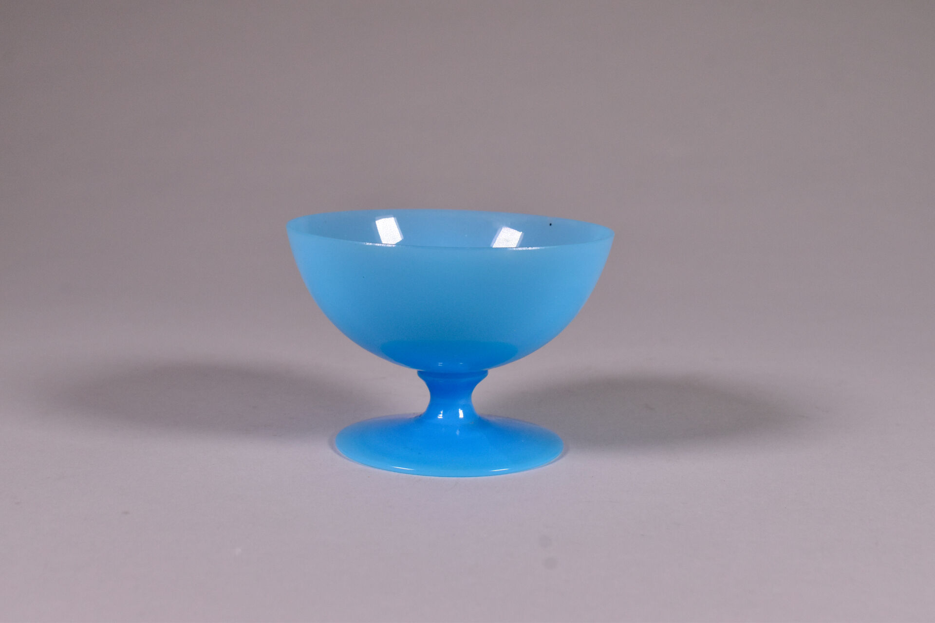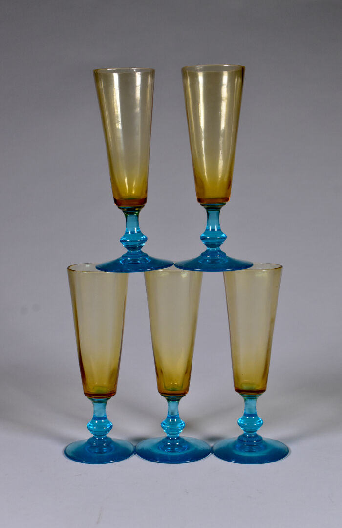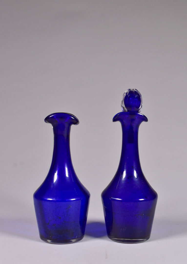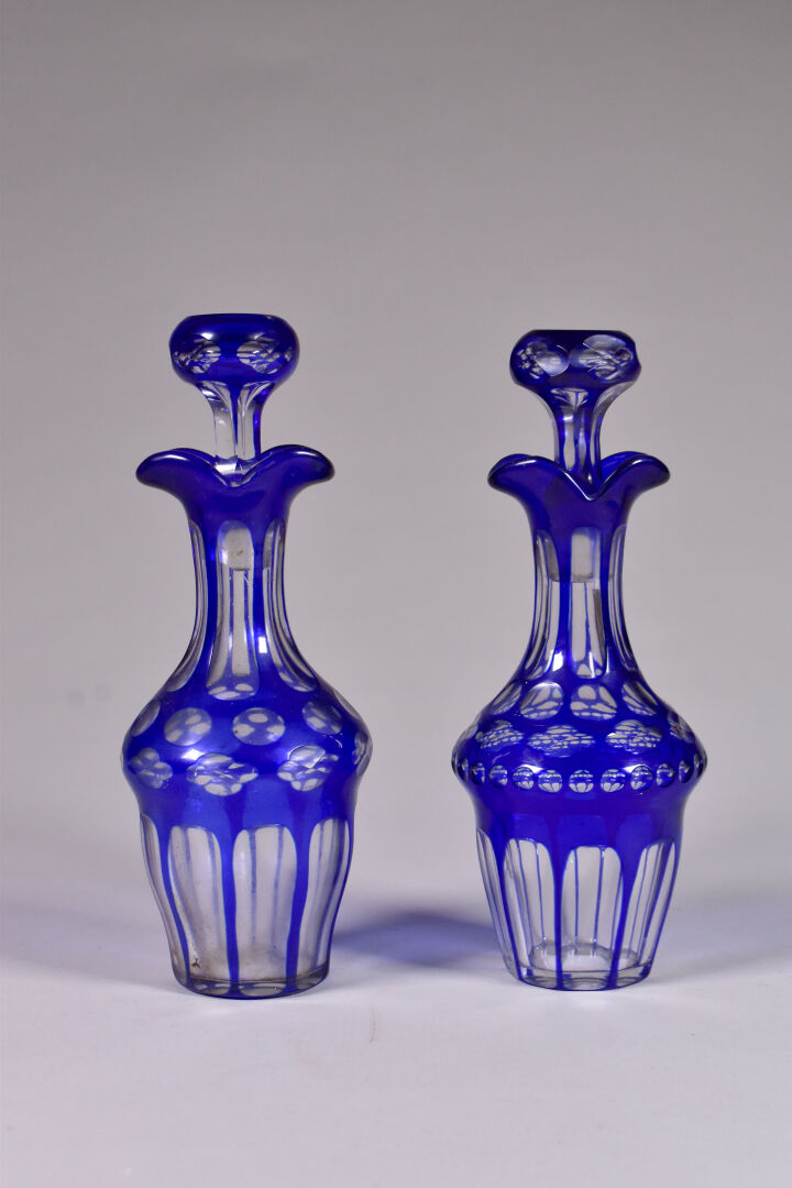 Ensemble en verre et cristal soit une paire de petites carafes en cristal taillé overlay bleu, une autre paire en verre bleu cobalt (une sans bouchon), 5 flûtes dans le goût Georges SAND et une coupe en opaline bleu (usures, égrenures et petits éclats). Haut. des carafes overlay : 20,5 cm.