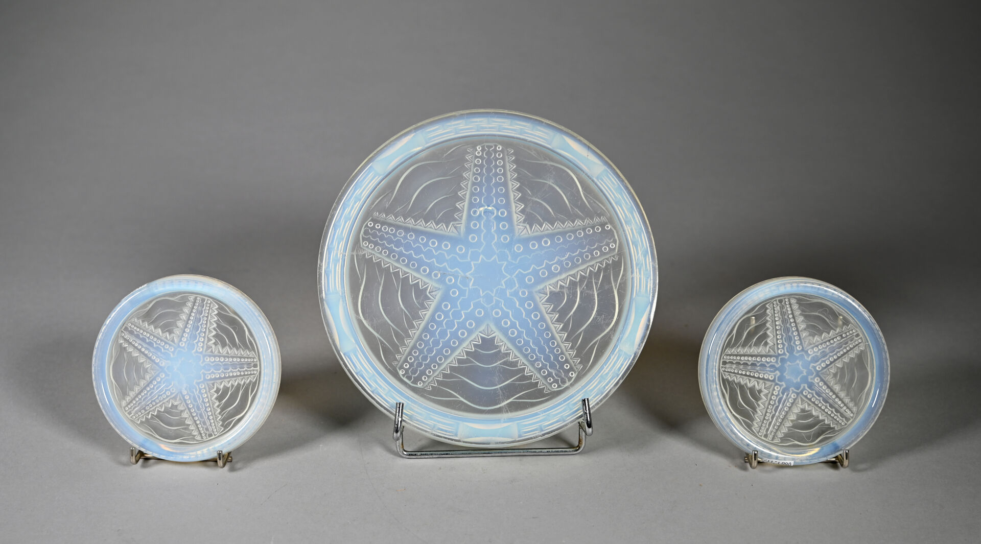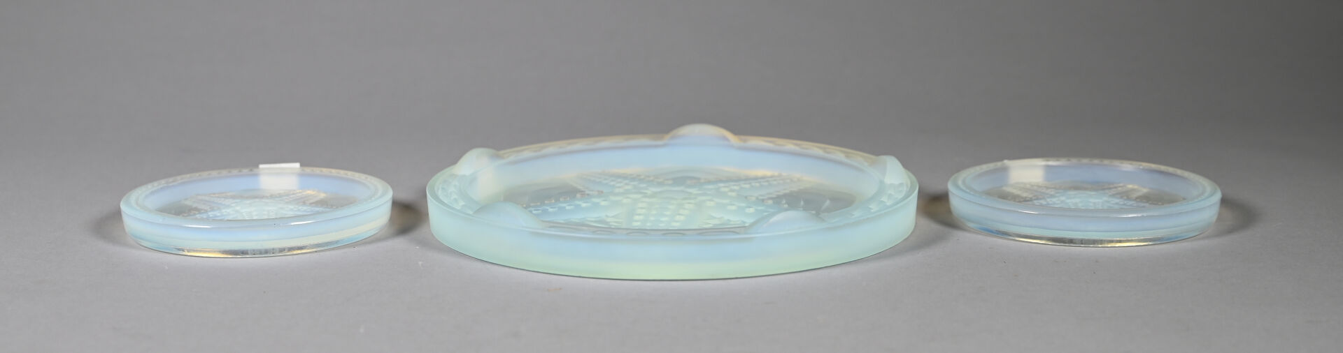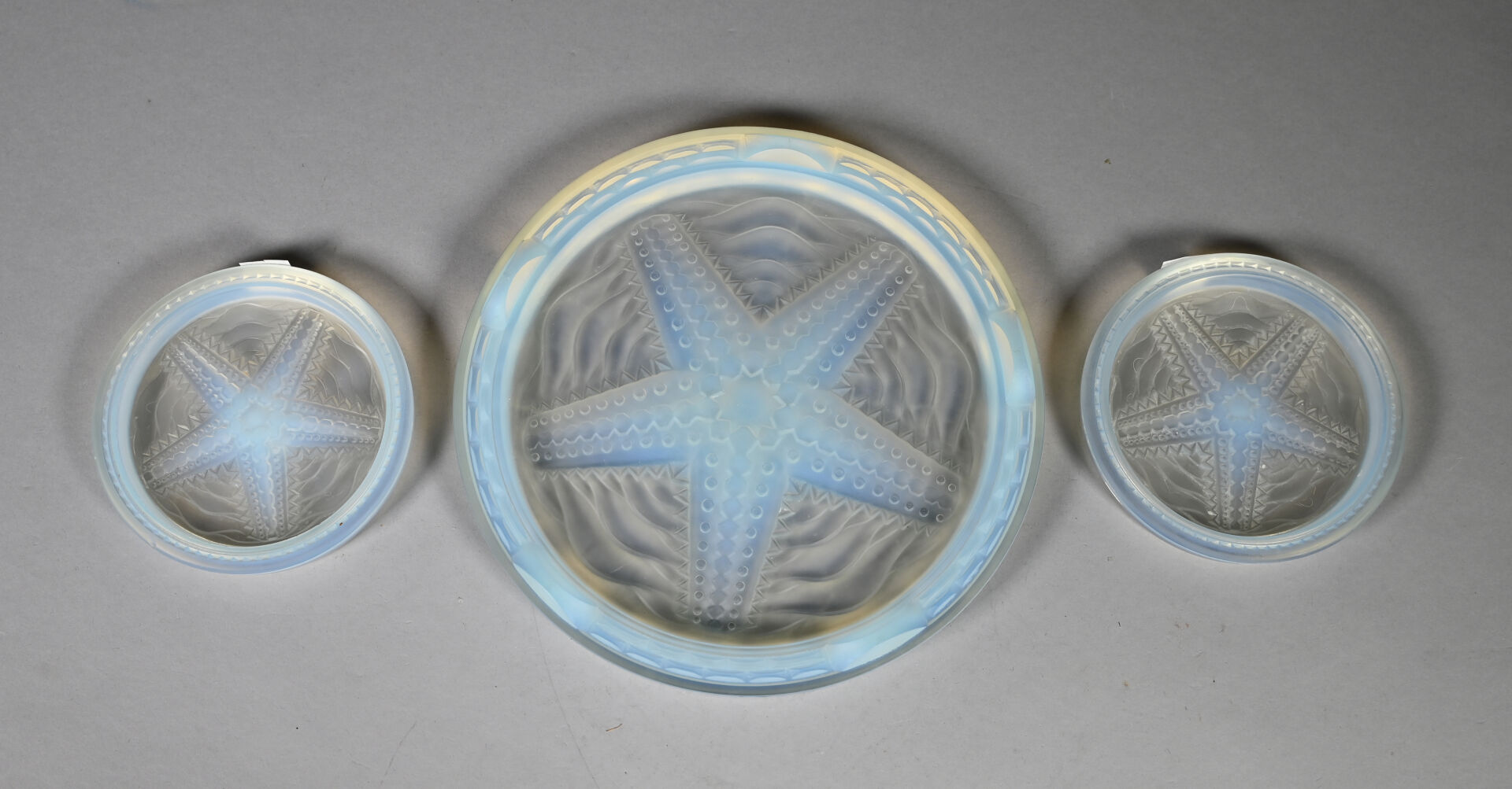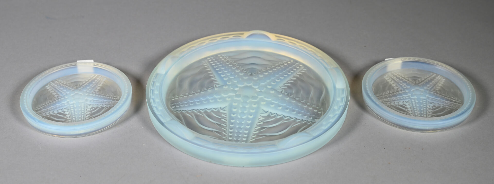Ensemble en verre opalescent à décor centré d’une étoile de mer soit un repose-plat et deux dessous de bouteille (éclats et rayures). Diam. du dessous de plat. : 23 cm.