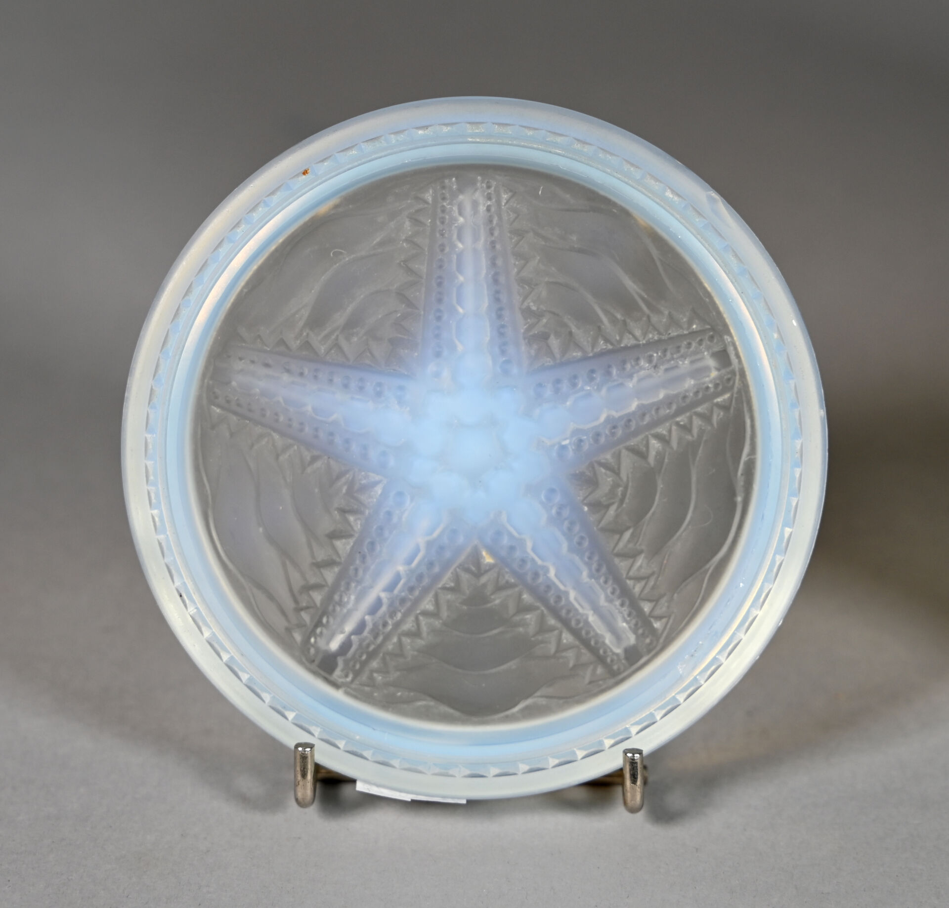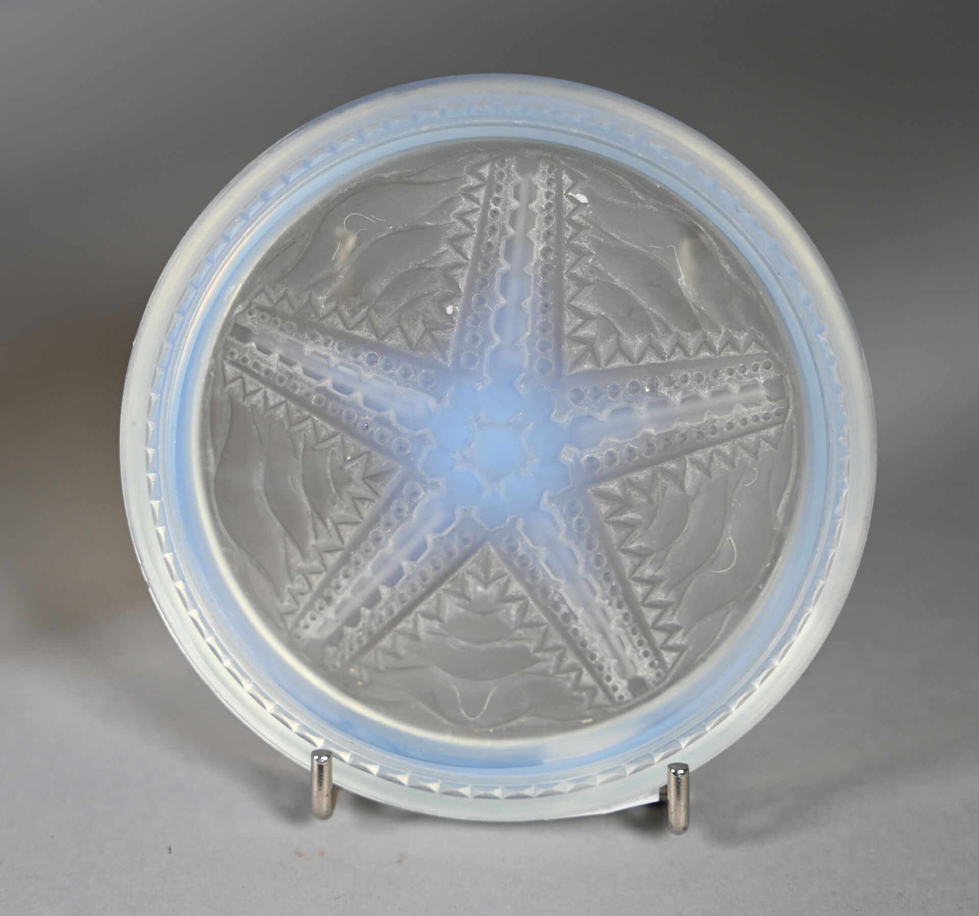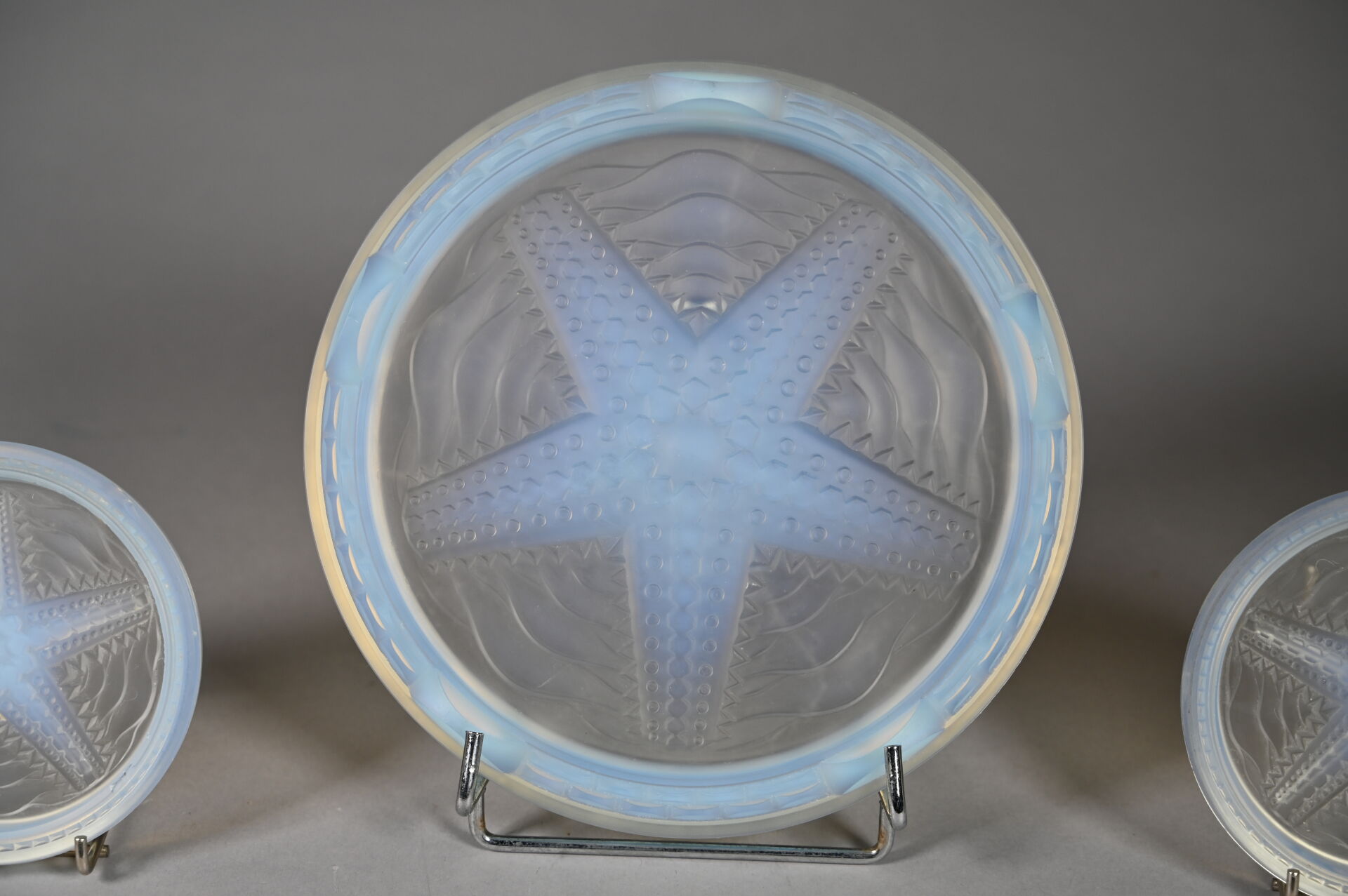 Ensemble en verre opalescent à décor centré d’une étoile de mer soit un repose-plat et deux dessous de bouteille (éclats et rayures). Diam. du dessous de plat. : 23 cm.