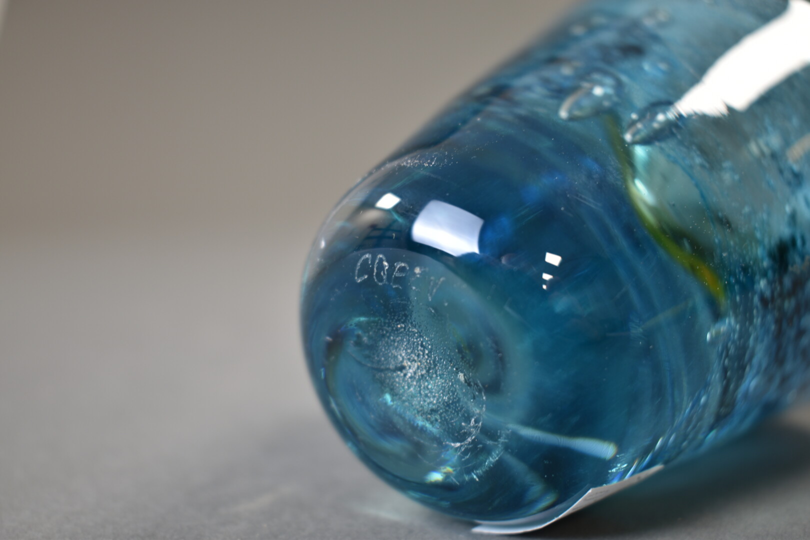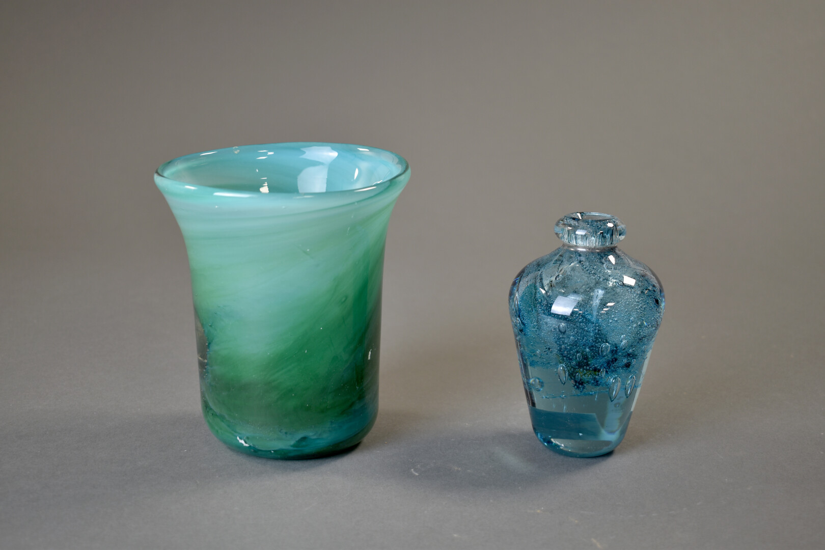Ensemble en verre souflé soit un petit flacon en verre bleu bullé et un vase cornet en verre vert émeraude. Haut. vase : 15 cm.