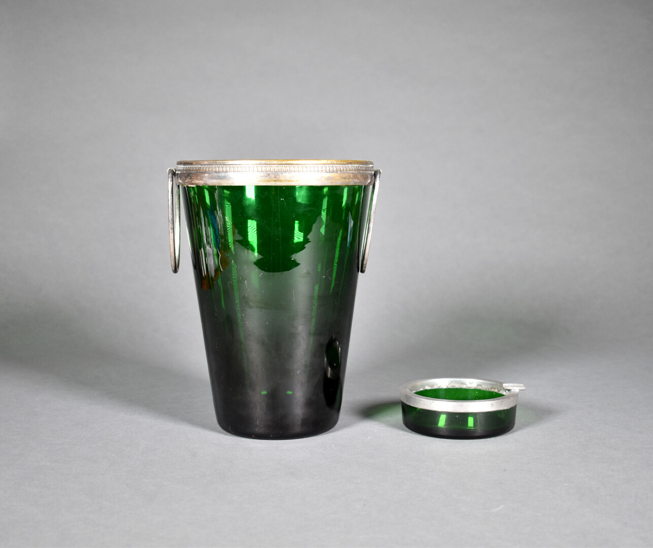 Ensemble en verre vert à monture de métal argenté ornée de frise de feuille d’eau soit un seau à champagne et un cendrier. Haut. du seau : 25 cm.