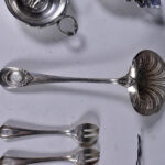 Ensemble hétéroclite en argent 925/1000e et 800/1000e soit 3 tastevins (un au coq), 2 passe-thé, 1 cuillère à soupe, 1 pince à sucre, 1 médaille, 1 cuillère de service à fraises, 2 fourchettes à entremets, 1 petit couteau, une fourchette et une cuillère à entremets, et 8 petites cuillères. Poids total. : 817 g.