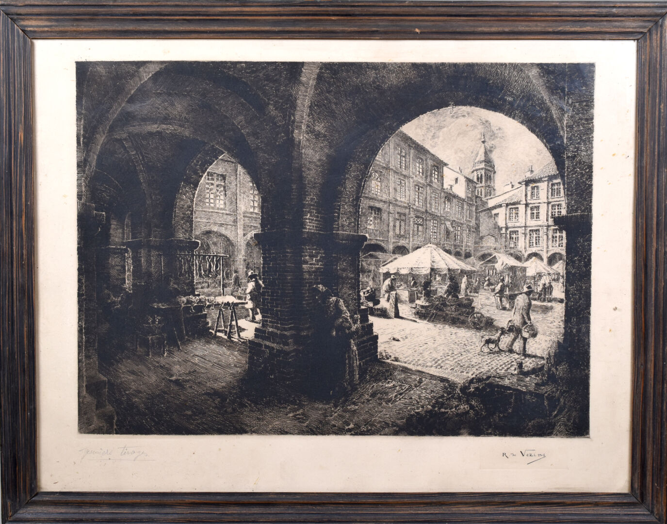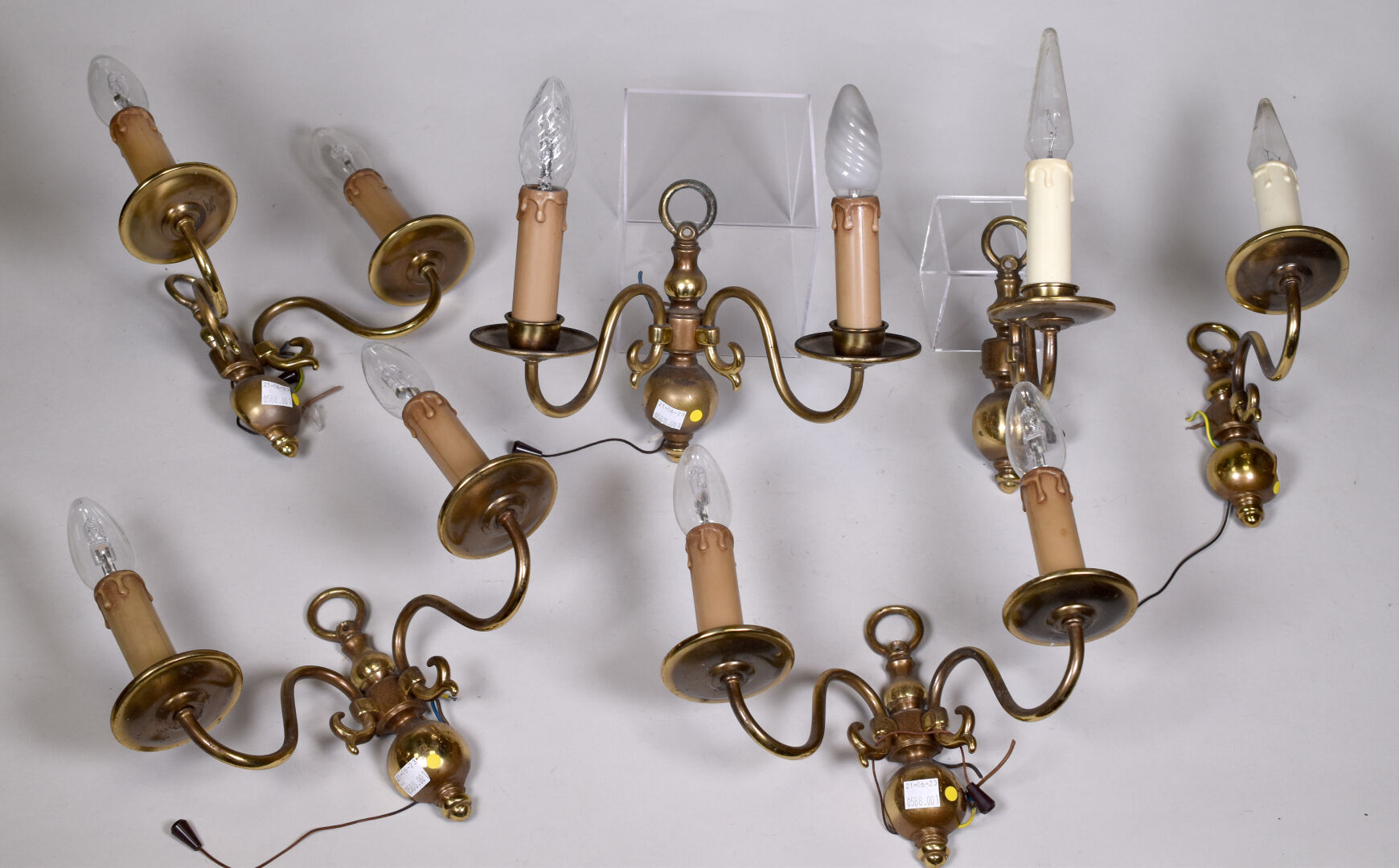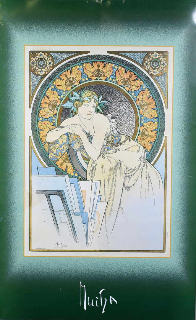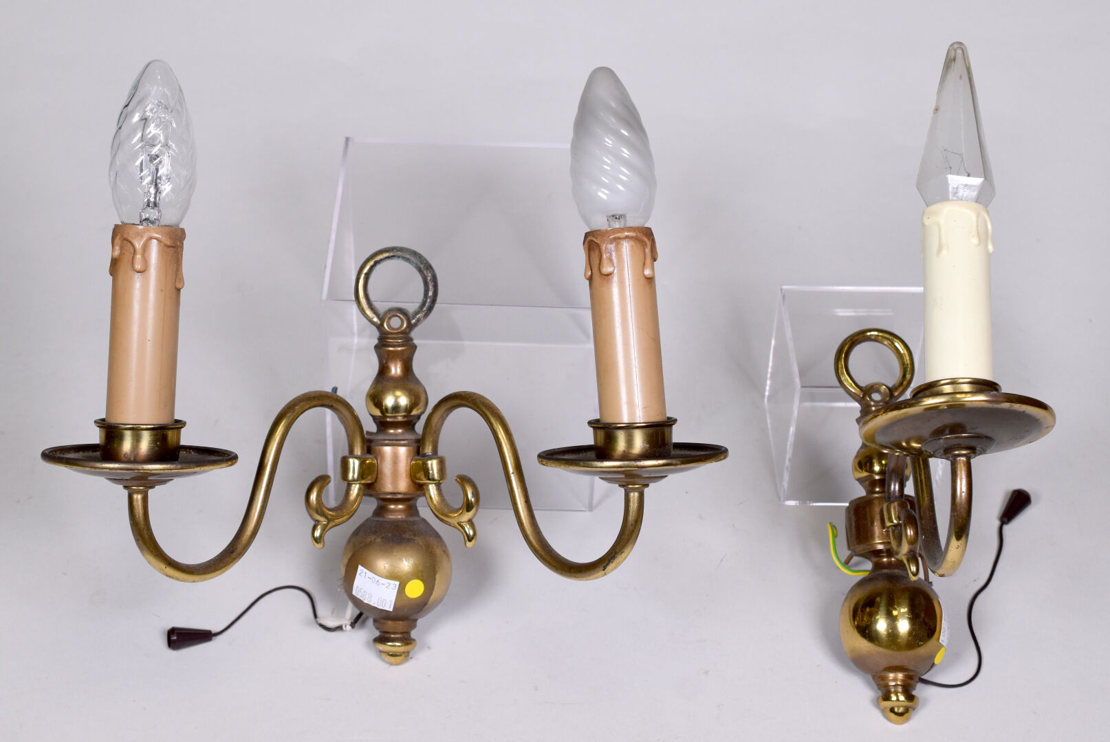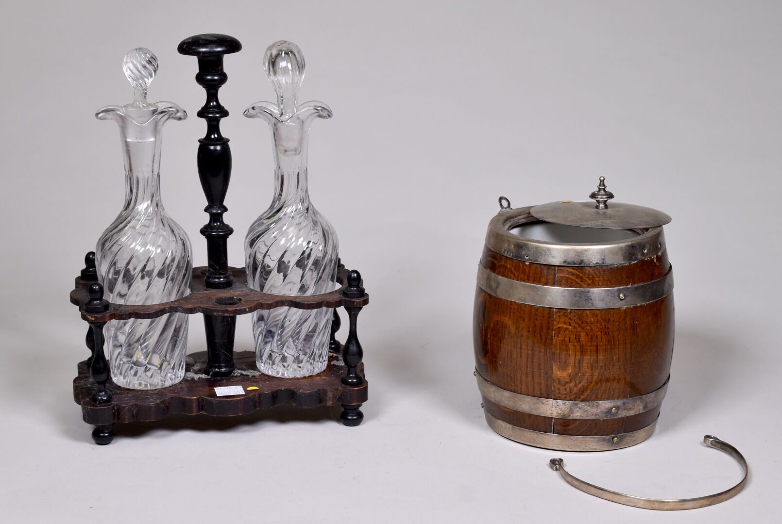 Ensemble hétéroclite soit un huilier-vinaigrier en bois noirci et verre, une suite de 6 appliques en laiton soit 4 à deux bras de lumière et deux à un bras de lumière, un seau à glaçons en forme de tonneau, une gravure de la Place Nationale de Montauban, un panneau en tôle orné d’une reproduction d’après Mucha.