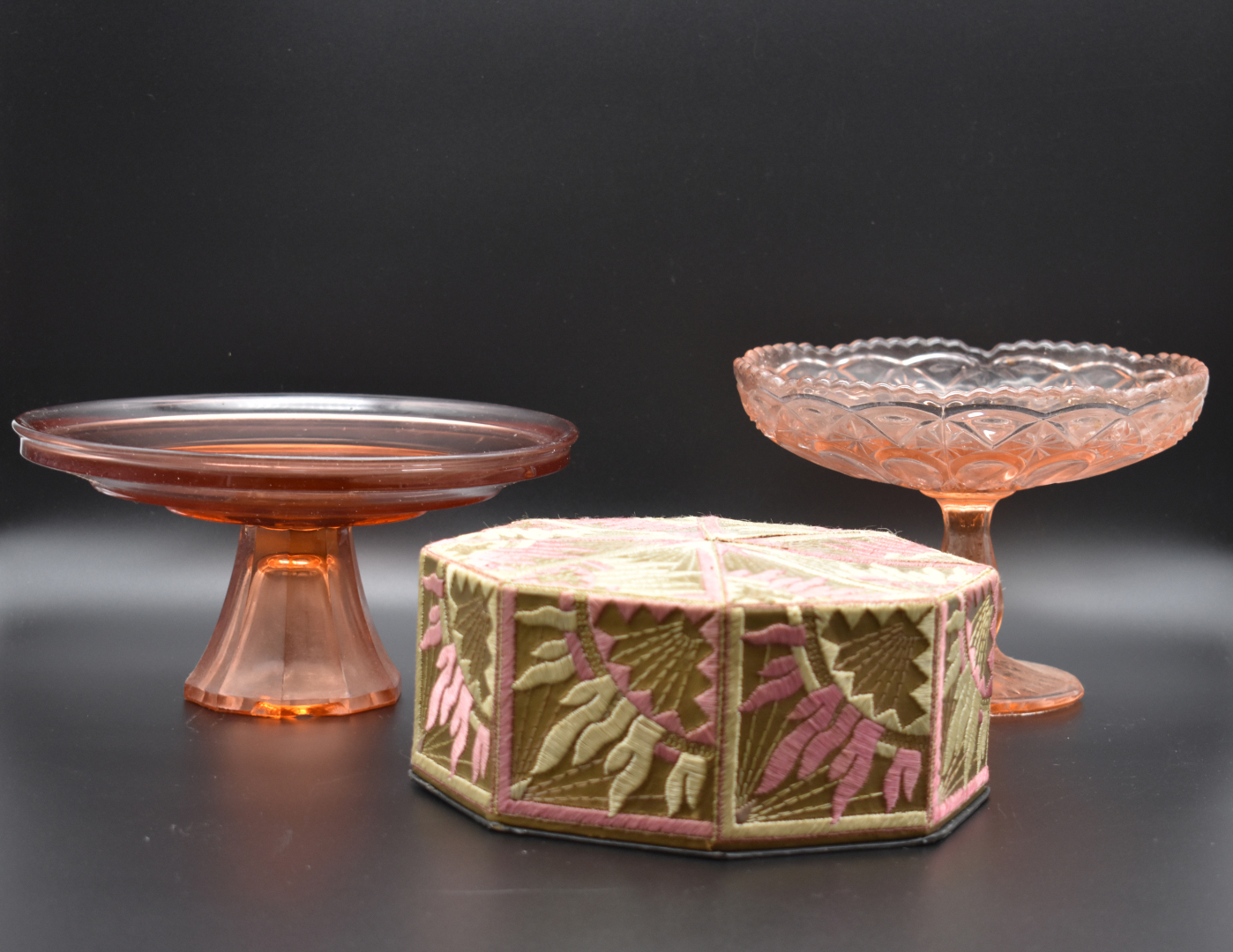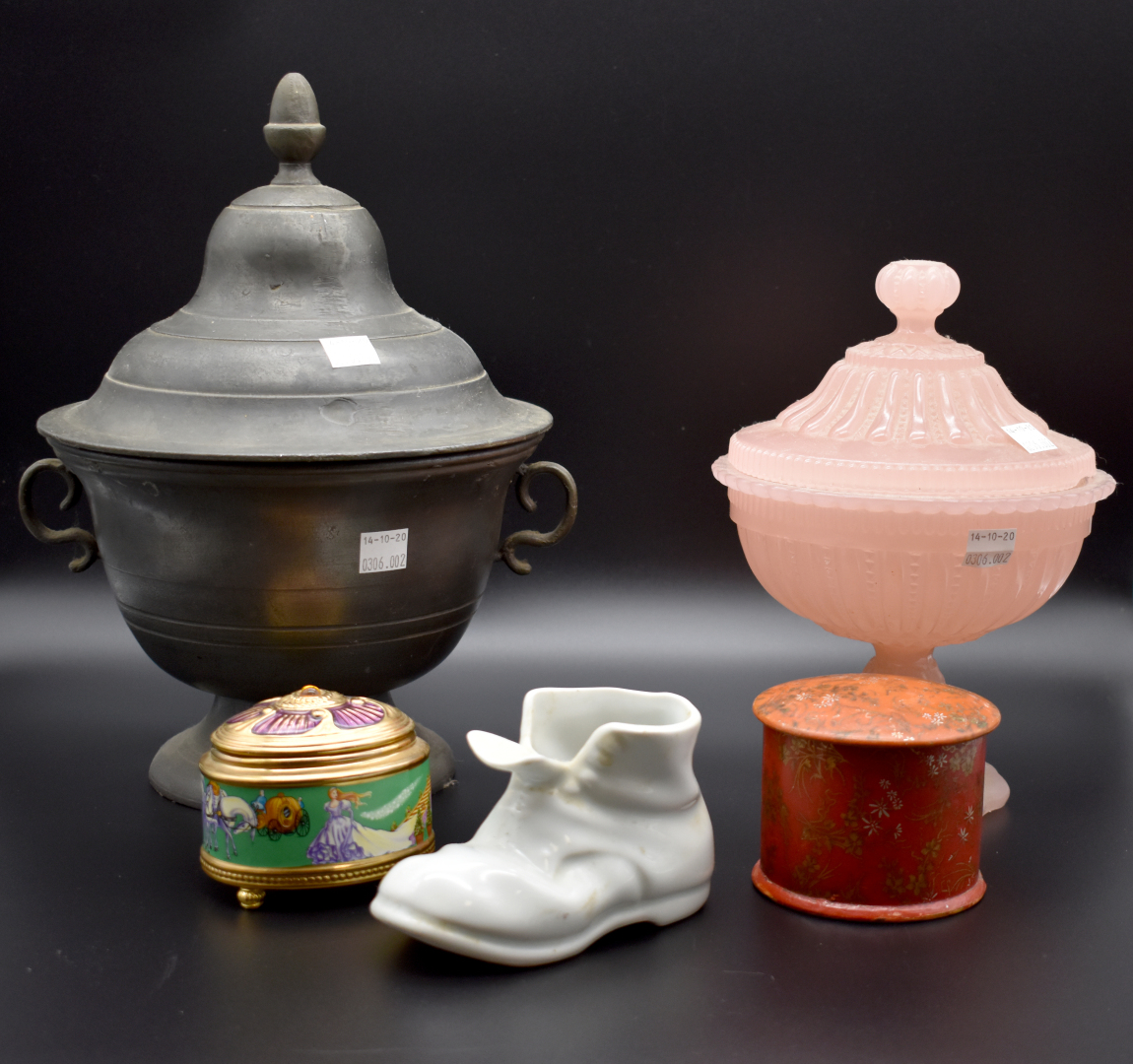 Ensemble hétéroclyte soit lampe à pétrole, verres à pied, bonbonière en opaline rose, compotier en verre rose, pot couvert en étain, soupière en porcelaine. Deux cartons.