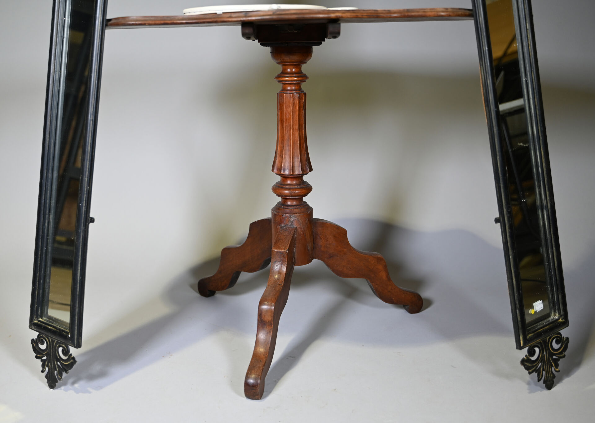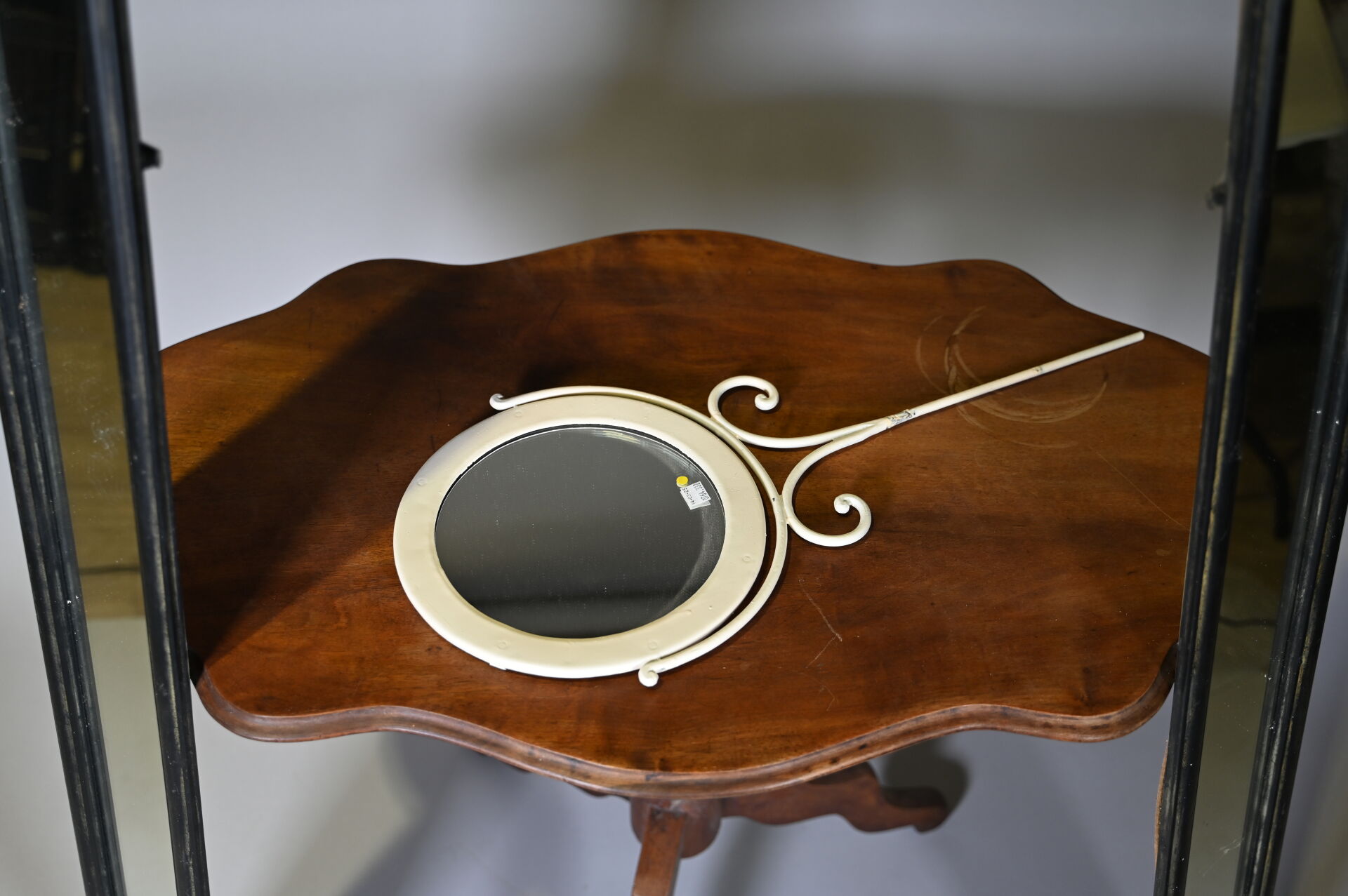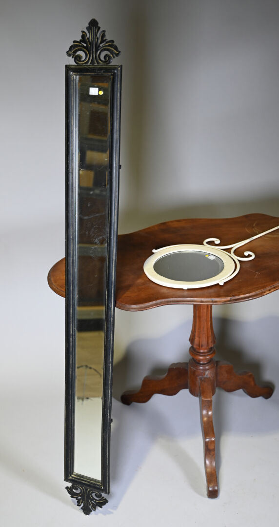 Ensemble hétéroclyte soit un guéridon à plateau violoné (mouillures) , deux miroirs en métal laqué noir et or à glace biseautée et un miroir de coiffeuse(?) en métal laqué crème. Haut. du guéridon : 74 cm – Larg. : 100 cm. Miroirs : 146 x 16 cm.
