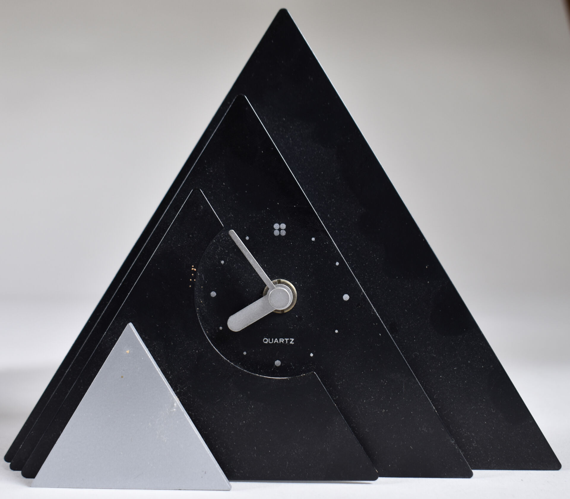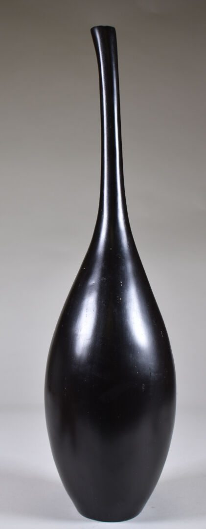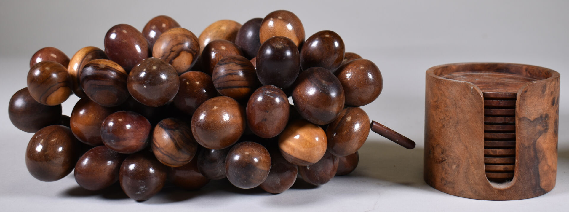 Ensemble hétéroclyte soit un vase bouteille en résine noire, une grappe de raisin en bois tourné, des dessous de verre en placage de loupe, un réveil.