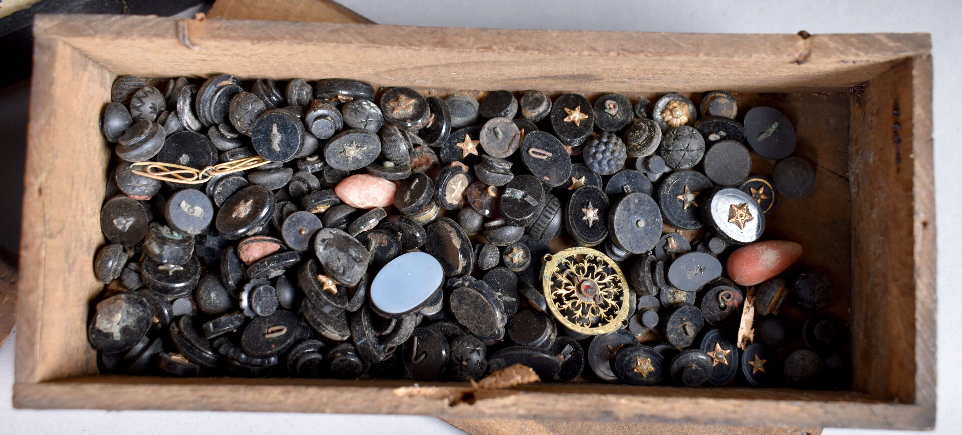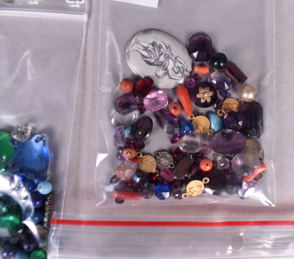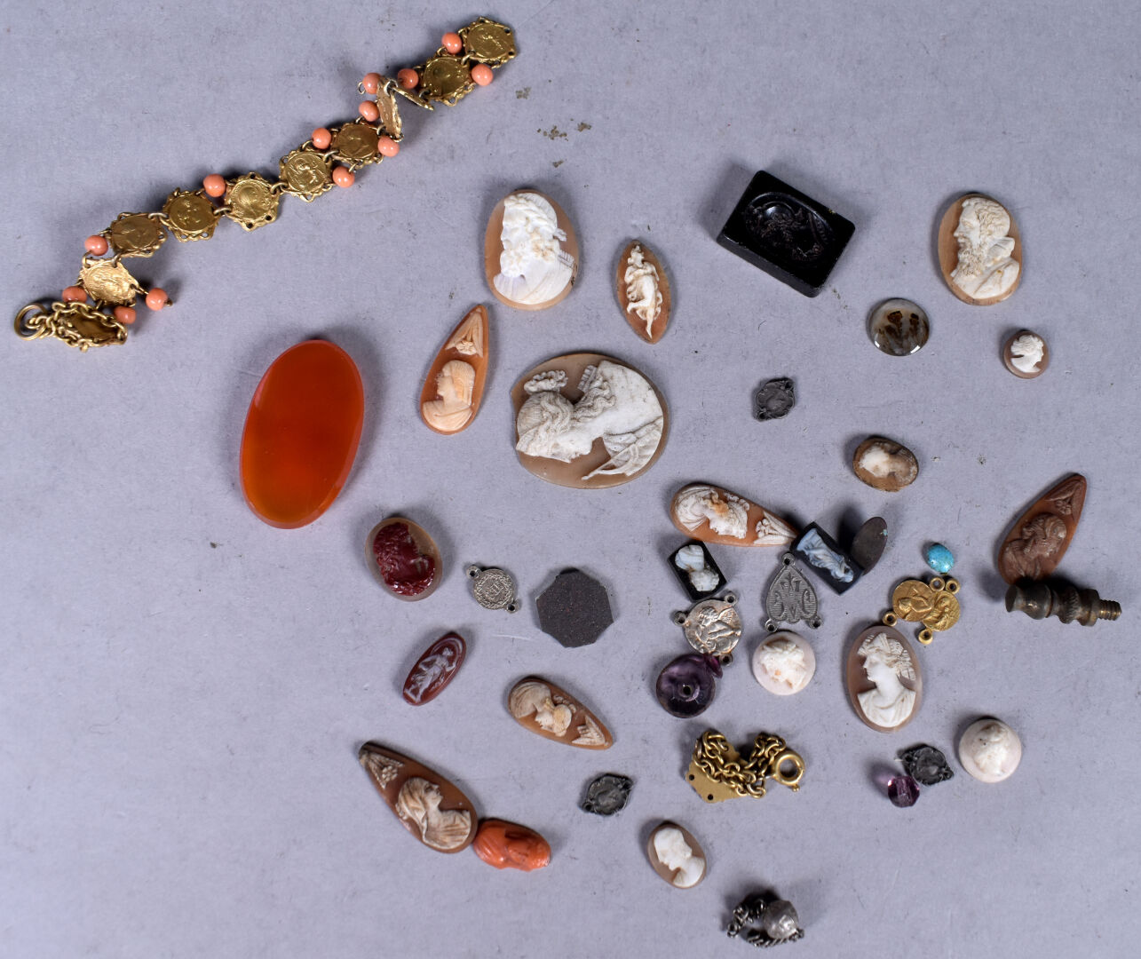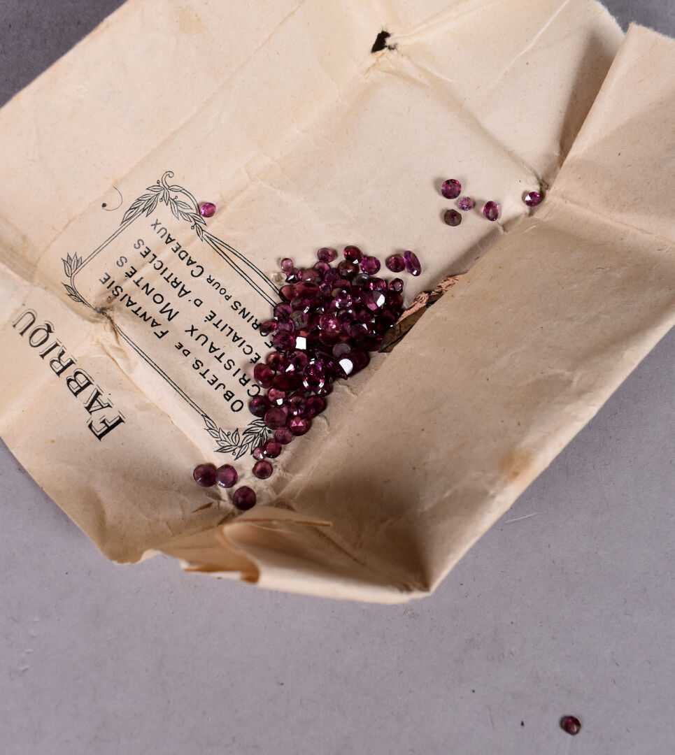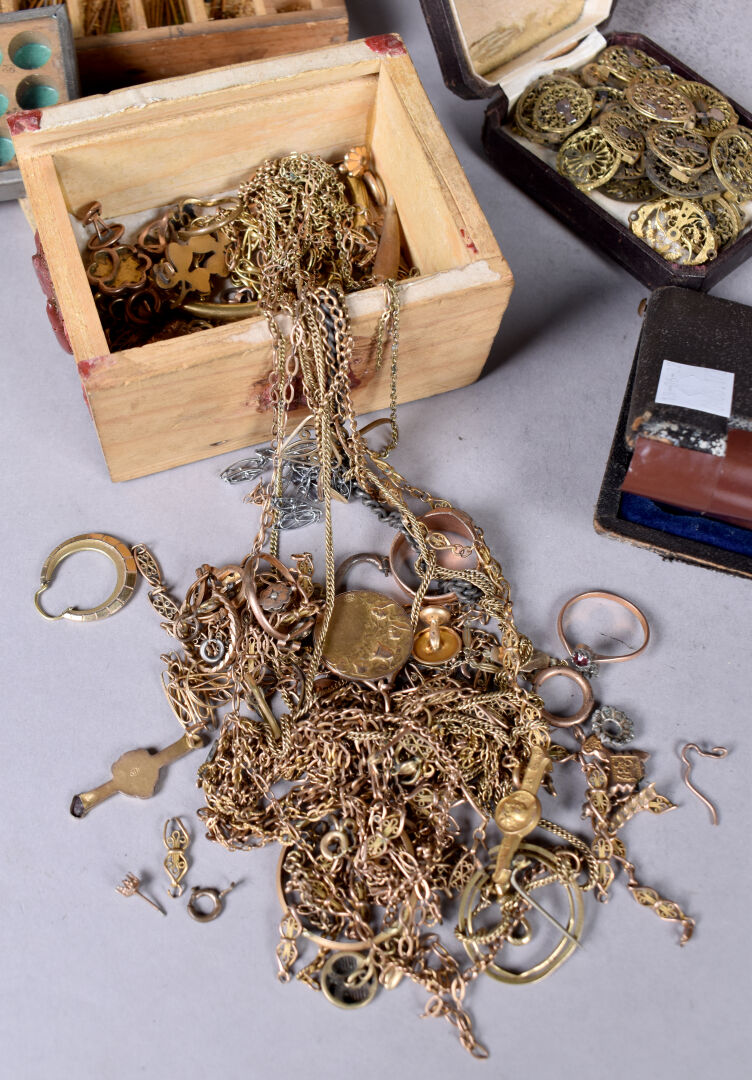 Ensemble provenant d’une succession d’un artisan bijoutier orfèvre du début du XXe siècle soit des perles de verre noir, boutons de deuil, demi-perles, pierres doublées, verroterie, quelques grenats de Perpignan, perles de turquoise, perles de corail, verroterie, camées, intailles, bijoux en métal doré et débris en métal doré et divers.