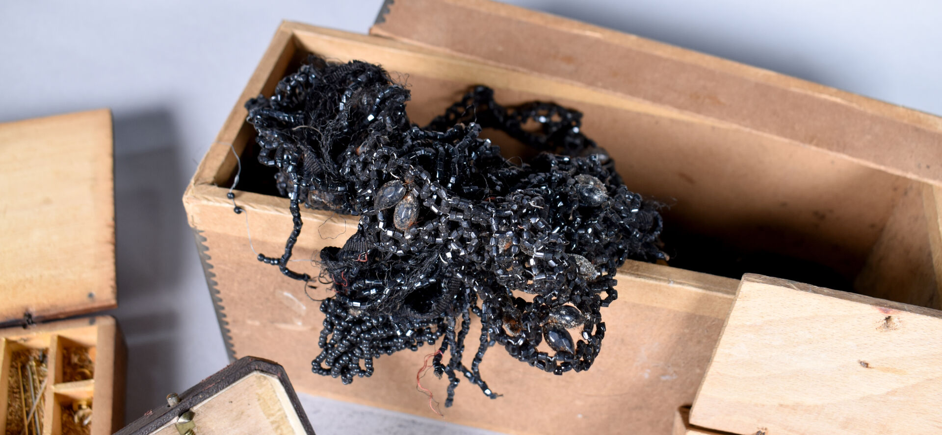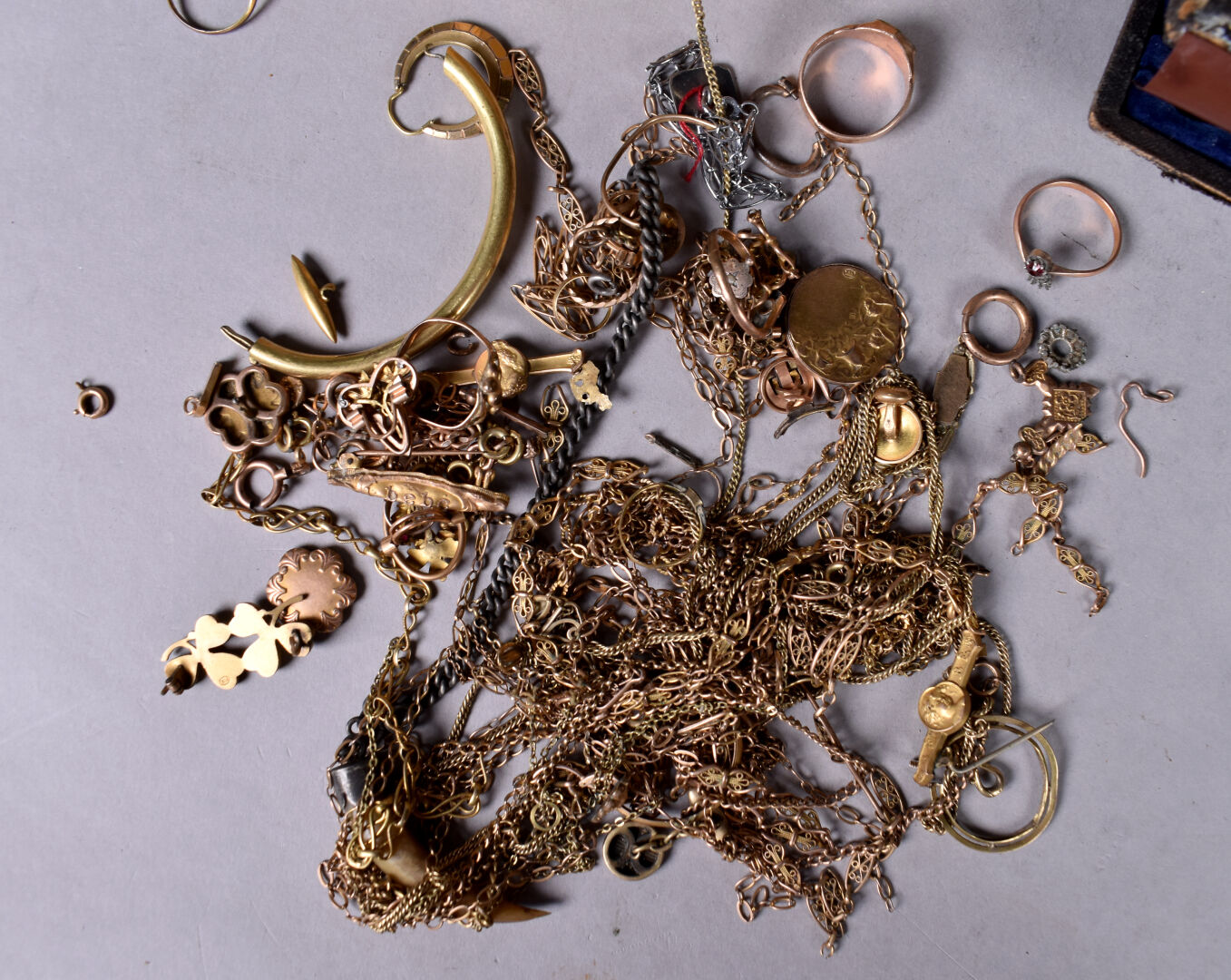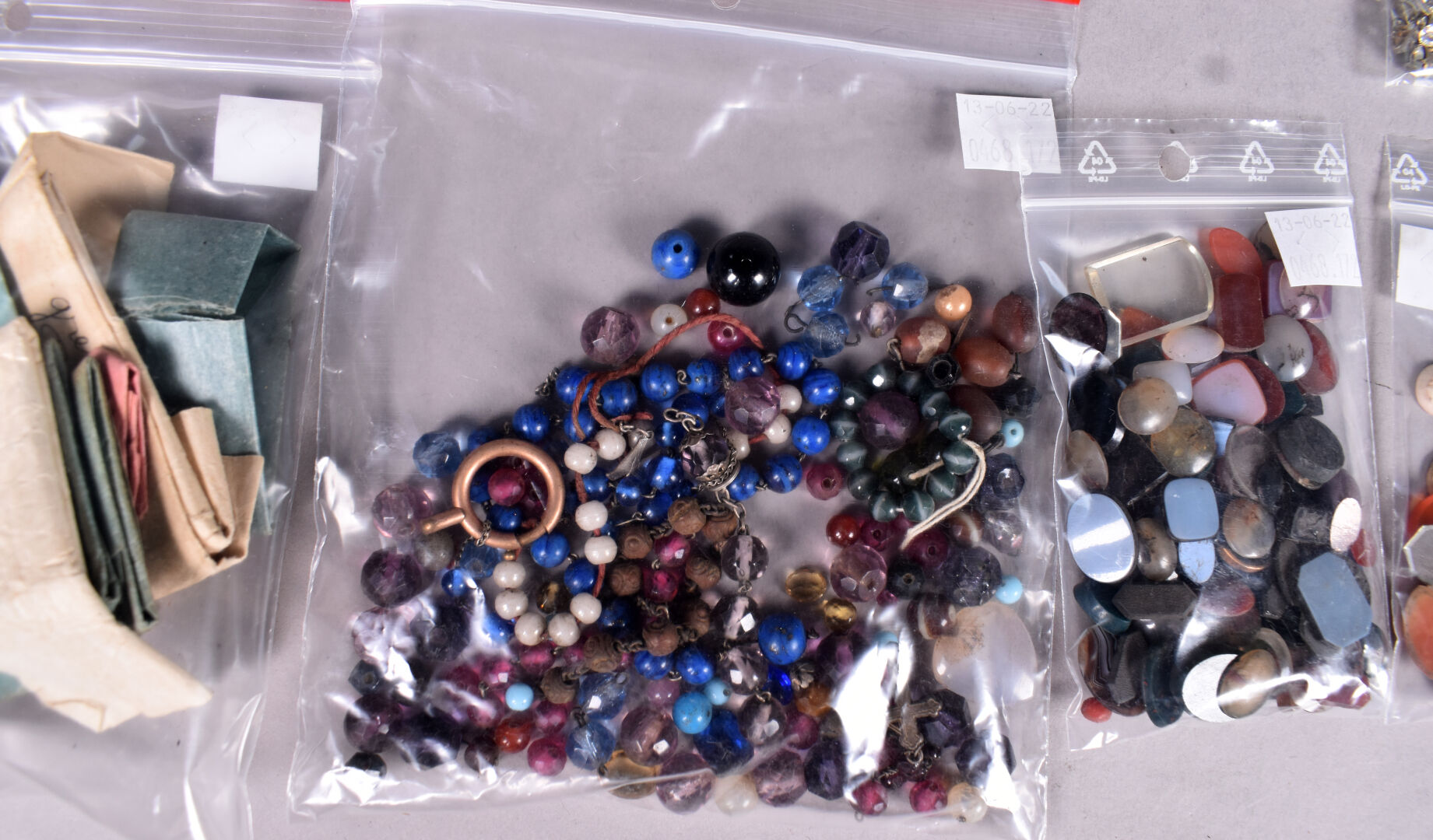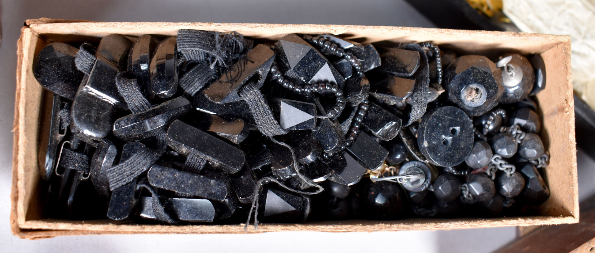 Ensemble provenant d’une succession d’un artisan bijoutier orfèvre du début du XXe siècle soit des perles de verre noir, boutons de deuil, demi-perles, pierres doublées, verroterie, quelques grenats de Perpignan, perles de turquoise, perles de corail, verroterie, camées, intailles, bijoux en métal doré et débris en métal doré et divers.