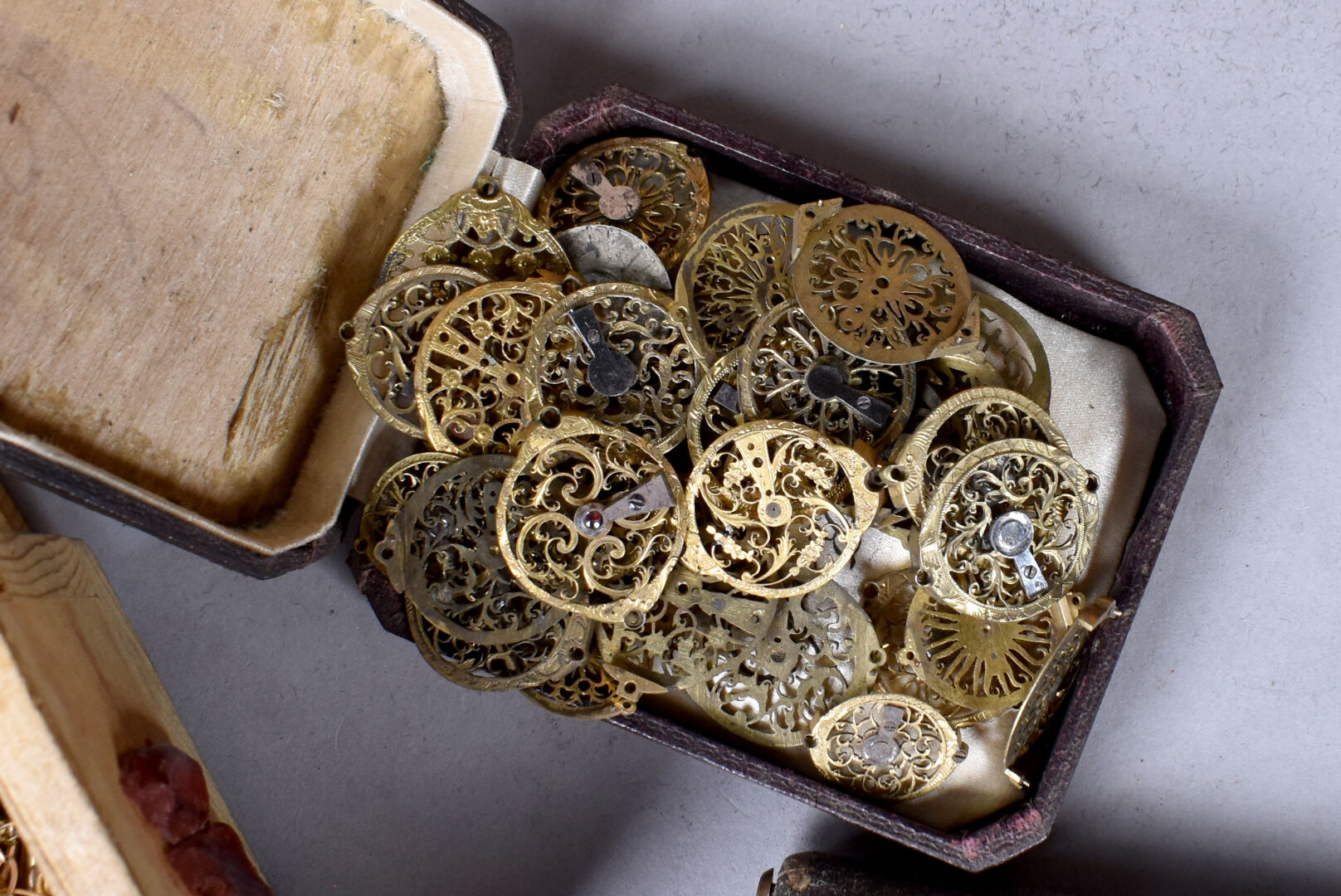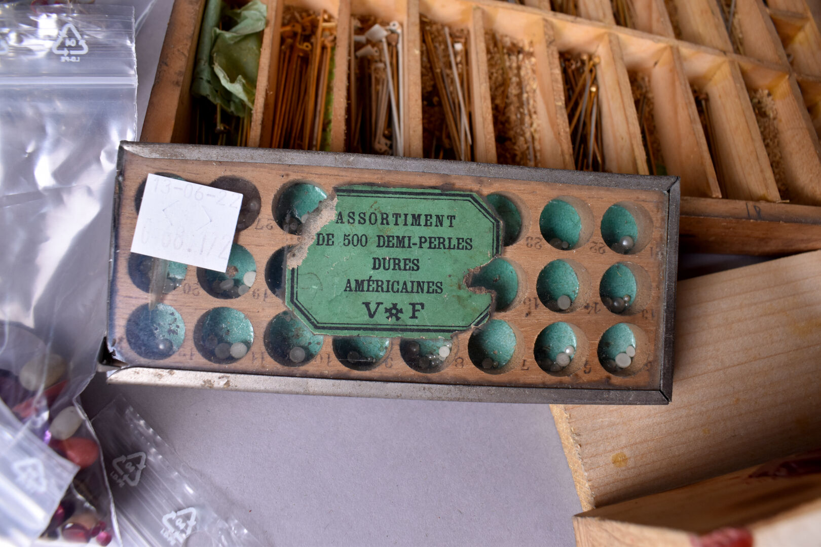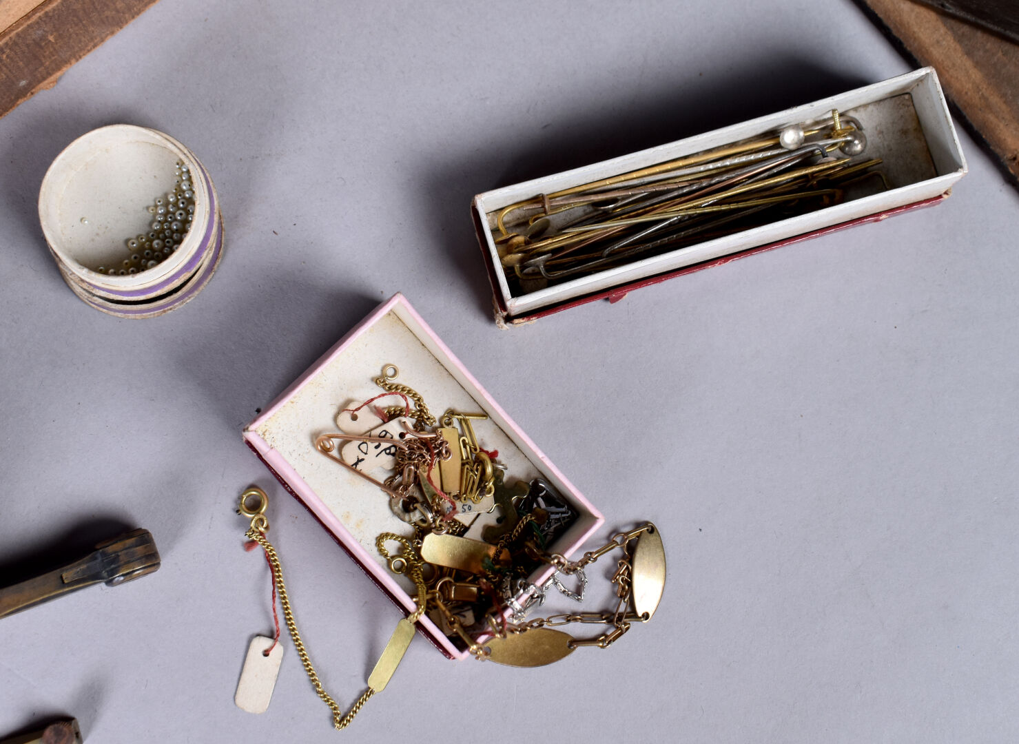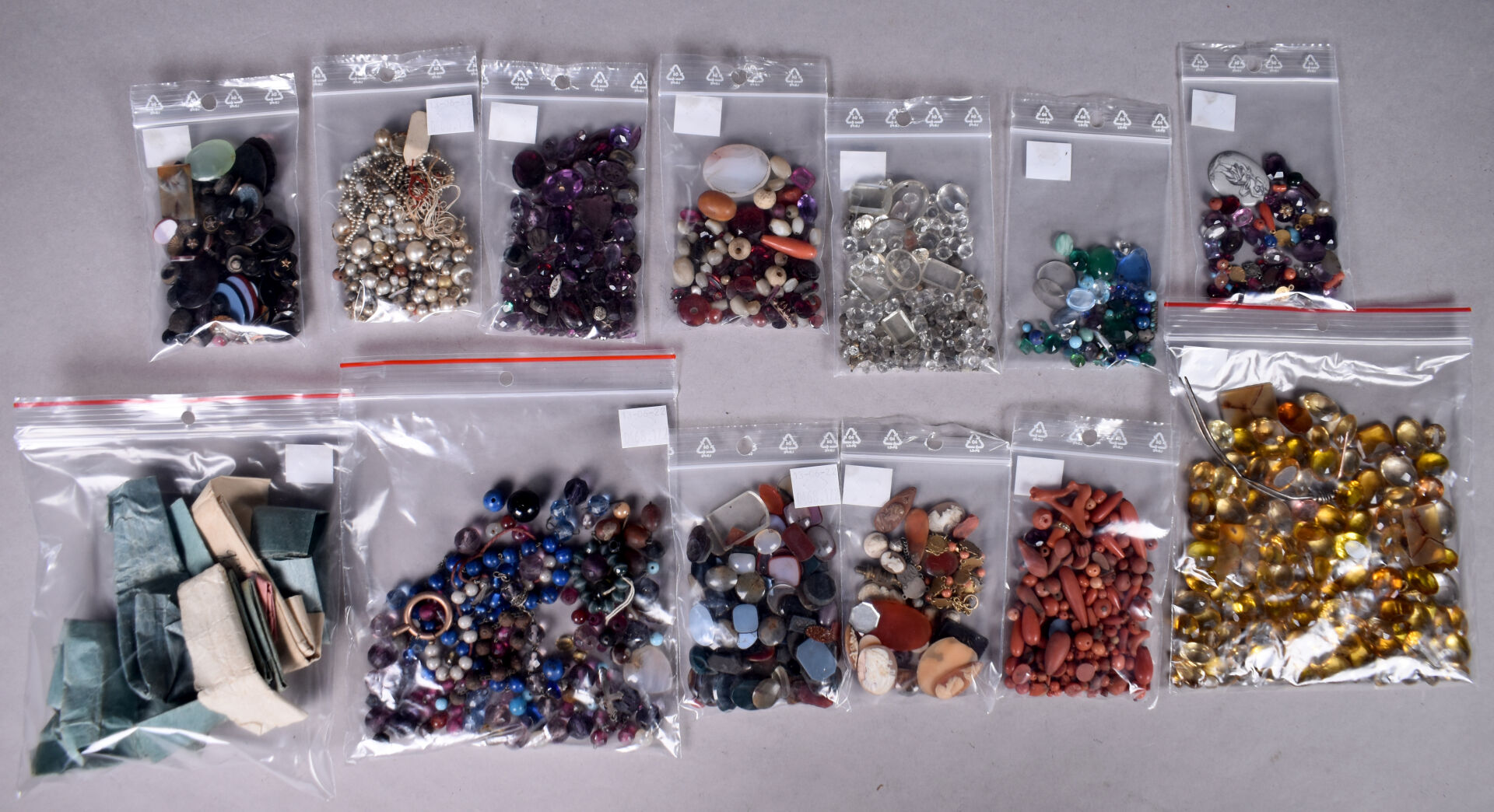 Ensemble provenant d’une succession d’un artisan bijoutier orfèvre du début du XXe siècle soit des perles de verre noir, boutons de deuil, demi-perles, pierres doublées, verroterie, quelques grenats de Perpignan, perles de turquoise, perles de corail, verroterie, camées, intailles, bijoux en métal doré et débris en métal doré et divers.