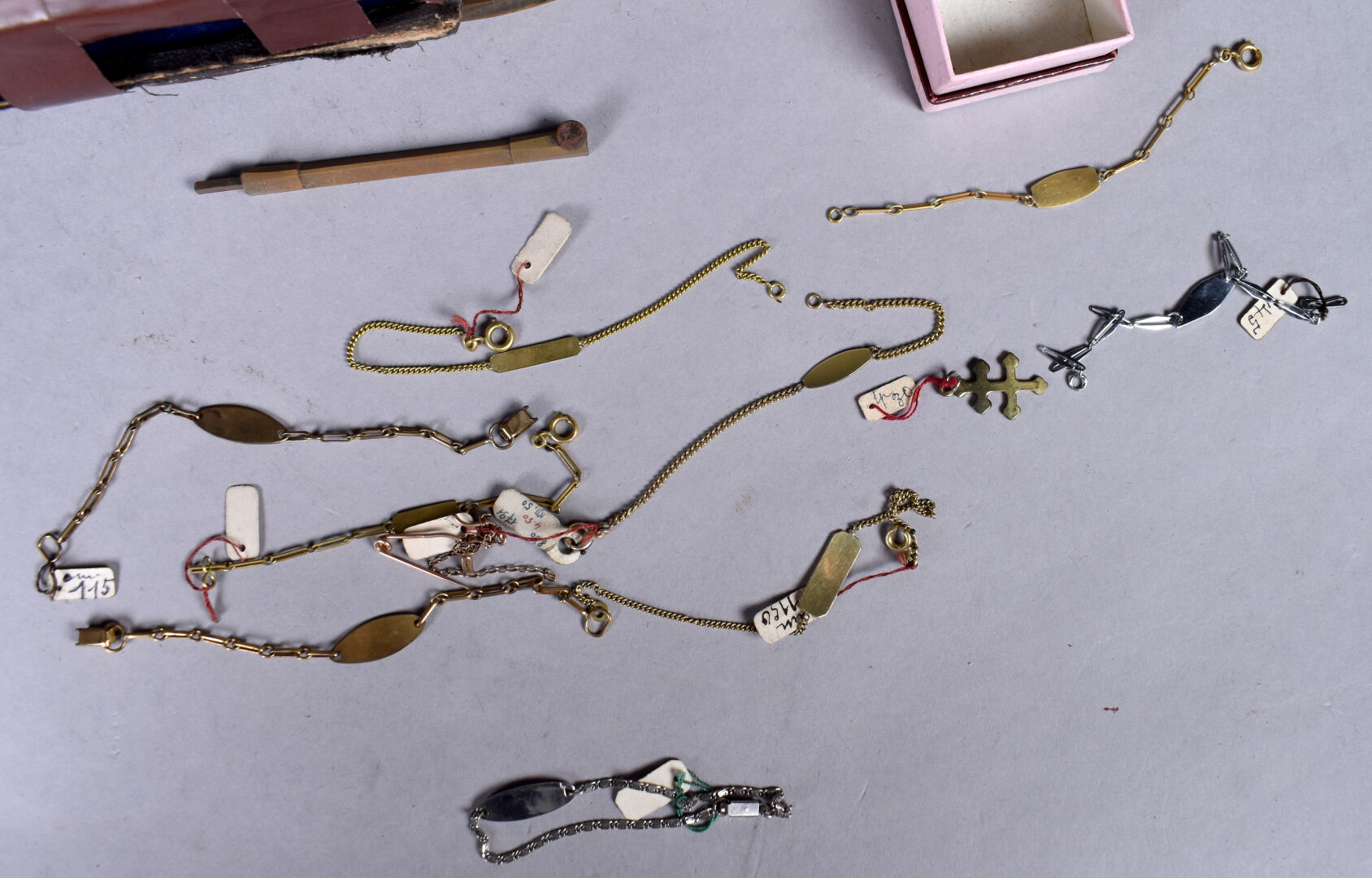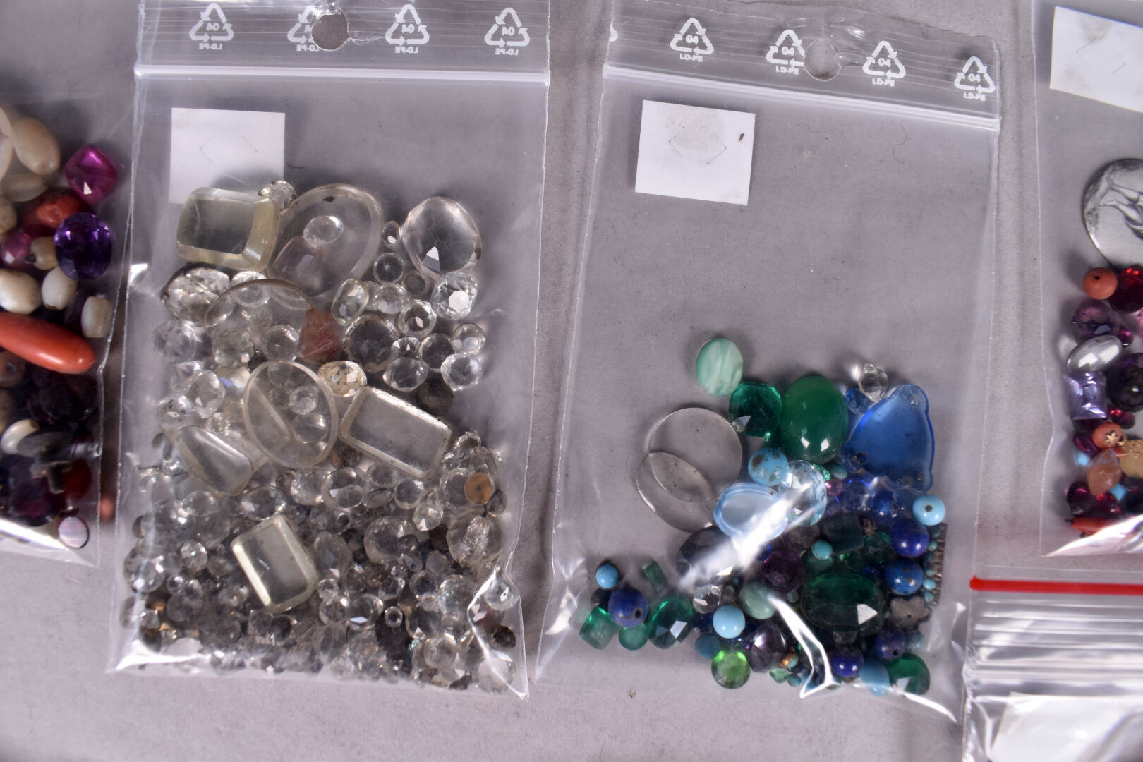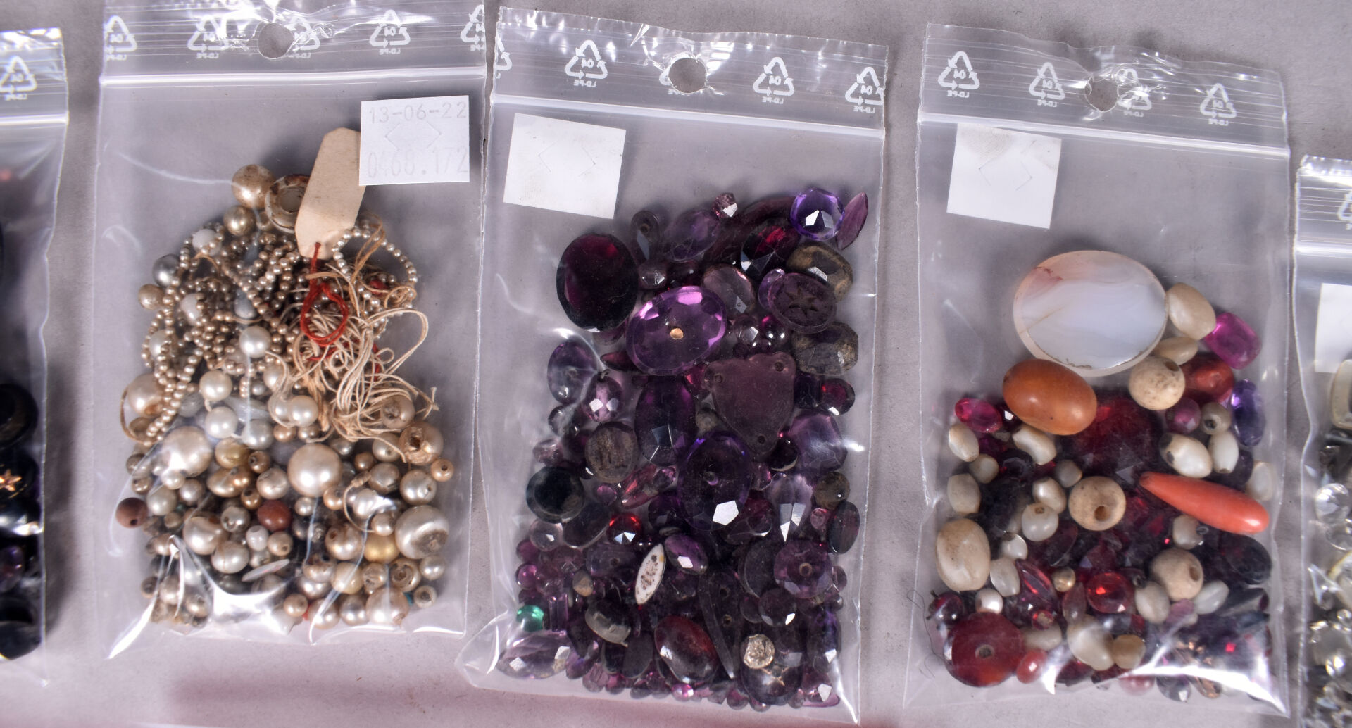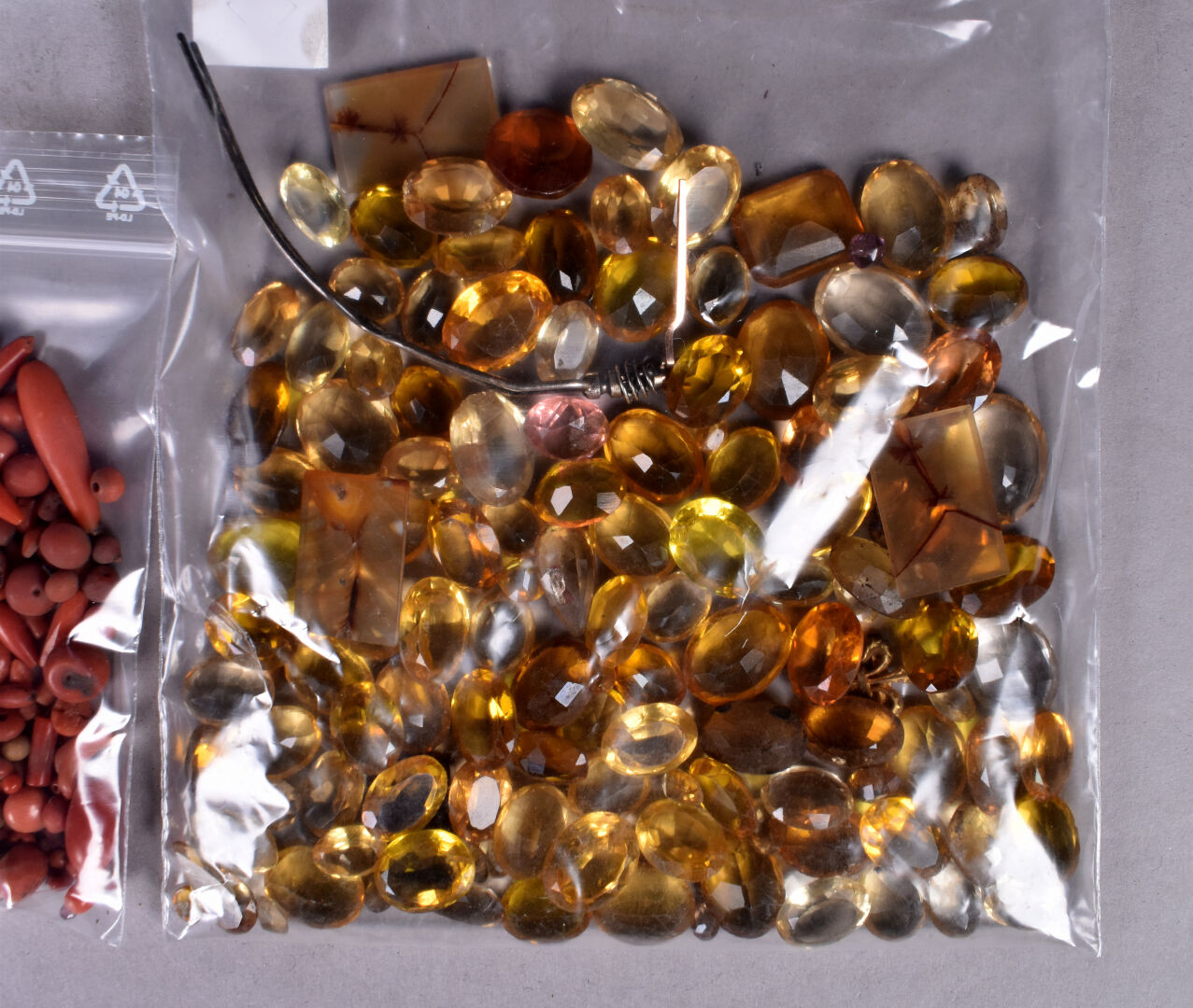 Ensemble provenant d’une succession d’un artisan bijoutier orfèvre du début du XXe siècle soit des perles de verre noir, boutons de deuil, demi-perles, pierres doublées, verroterie, quelques grenats de Perpignan, perles de turquoise, perles de corail, verroterie, camées, intailles, bijoux en métal doré et débris en métal doré et divers.