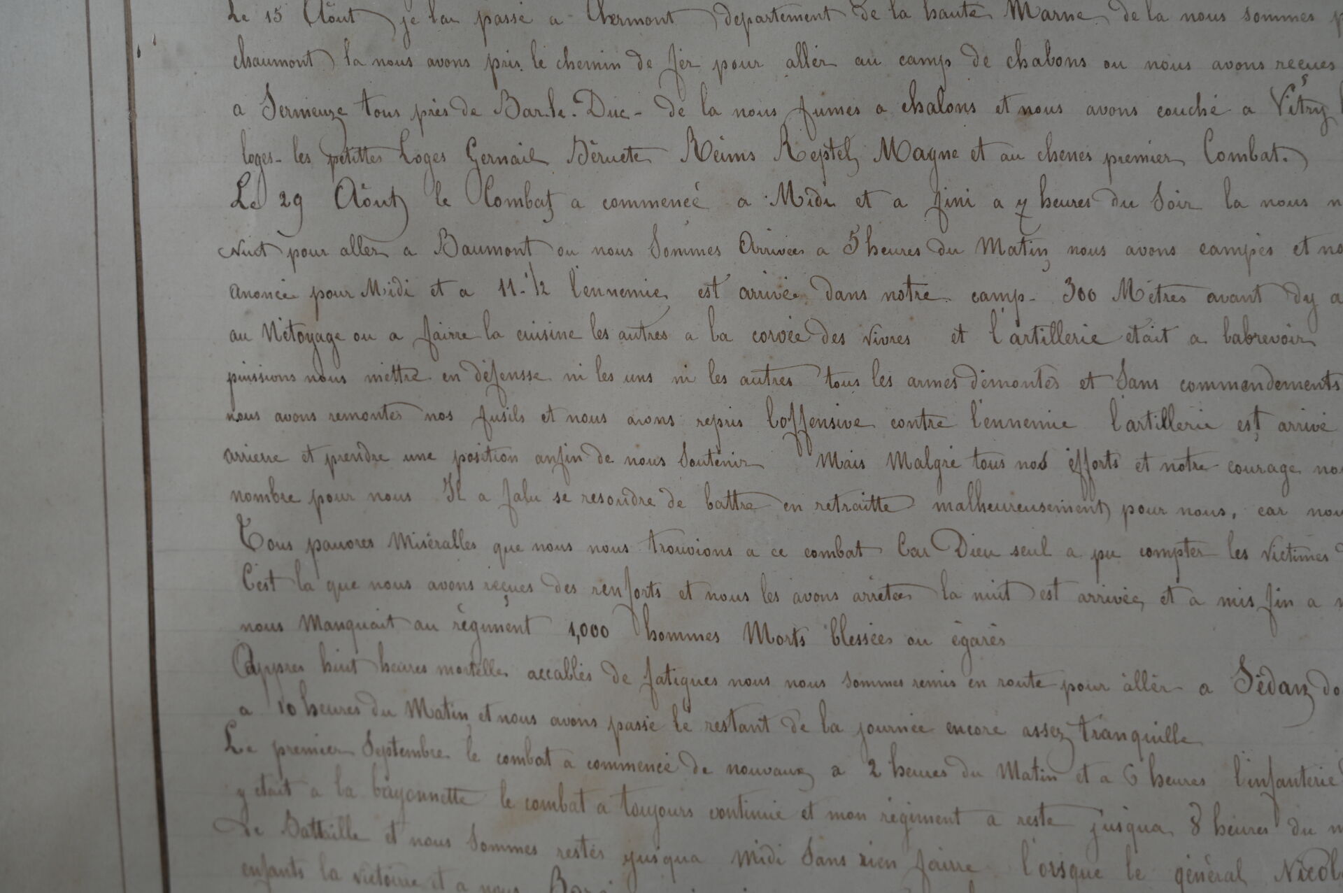 Ensemble relatif à la carrière militaire du soldat Jean BARAT Cadre contenant une médaille commémorative de la guerre de 1871, module rond biface avec ruban vert à raies noires, le cadre contient un long texte relatant la carrière du récipiendaire au sein de 61 éme de ligne et le récit de sa captivité en Allemagne, on y joint un ceinturon en cuir noir, plaque lisse rectangulaire à pans coupés en bronze. (Etat 1).