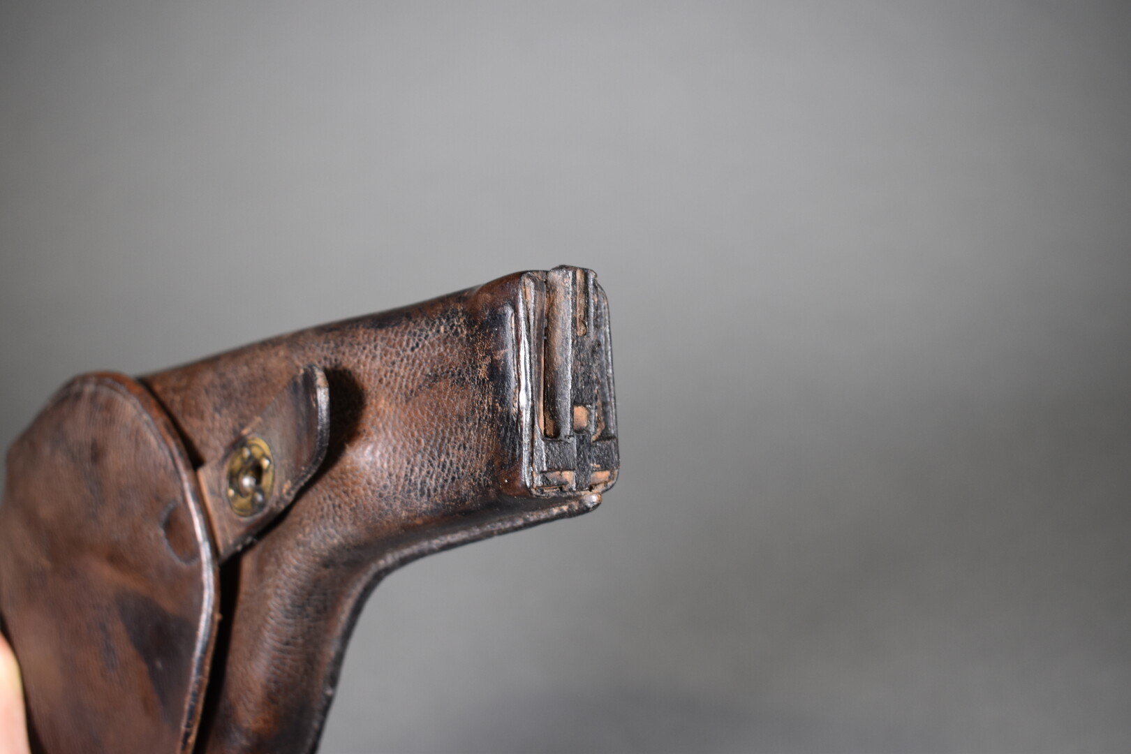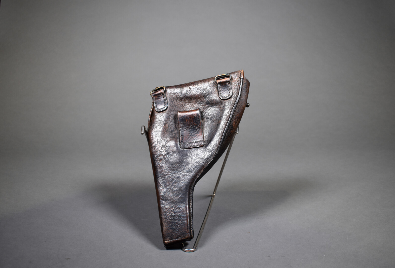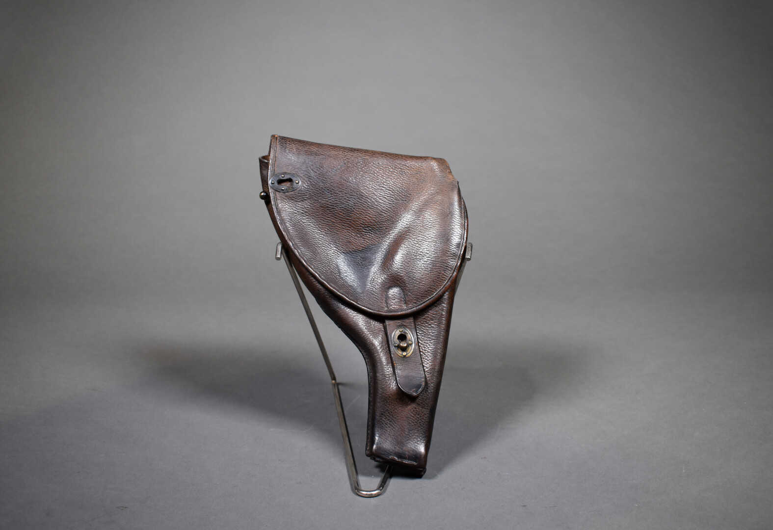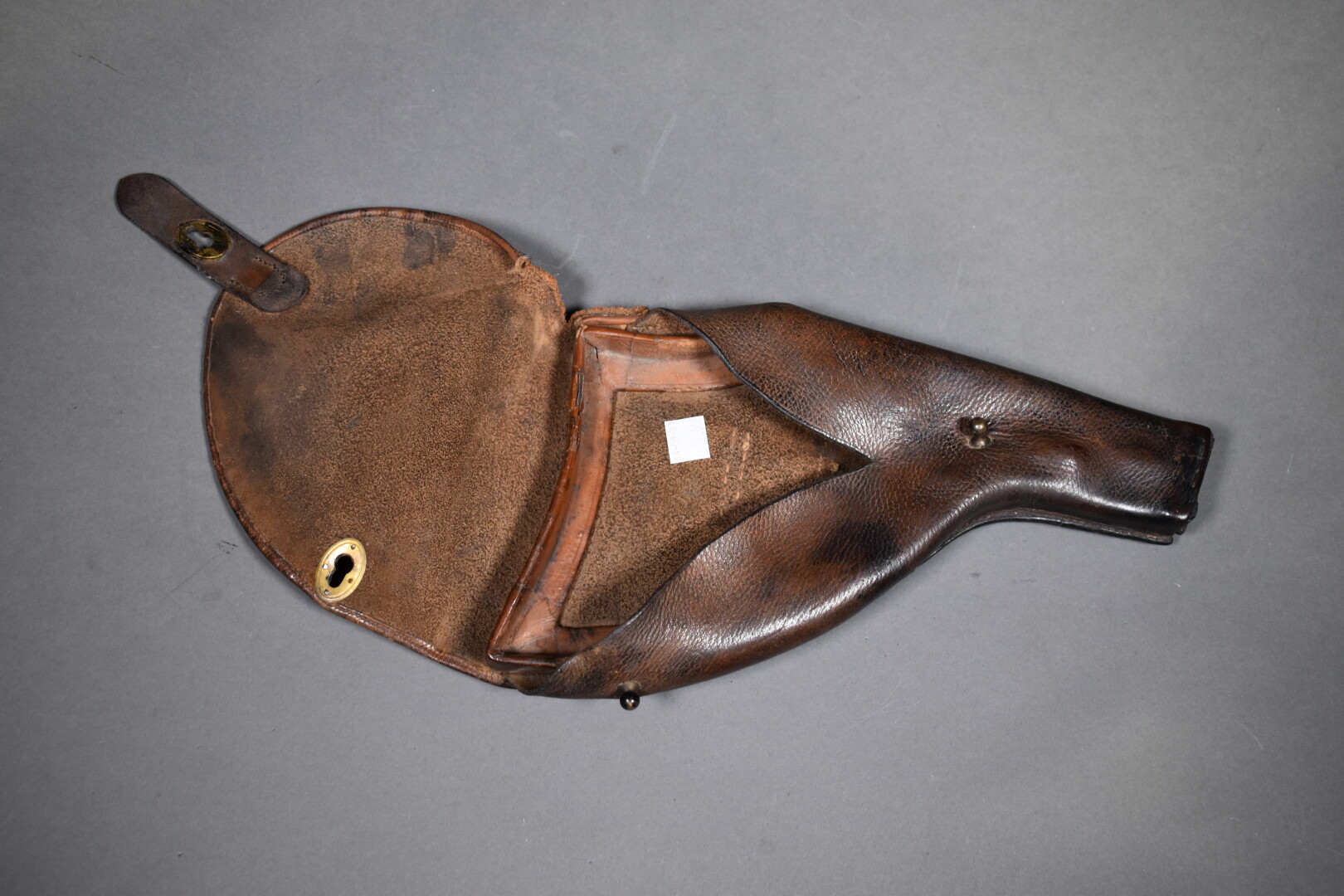 Ensemble se composant d’un porte-carte d’officier en cuir fauve et d’un étui pour pistolet automatique en cuir brun formant une crosse d’épaulement à identifier. Etat 1-