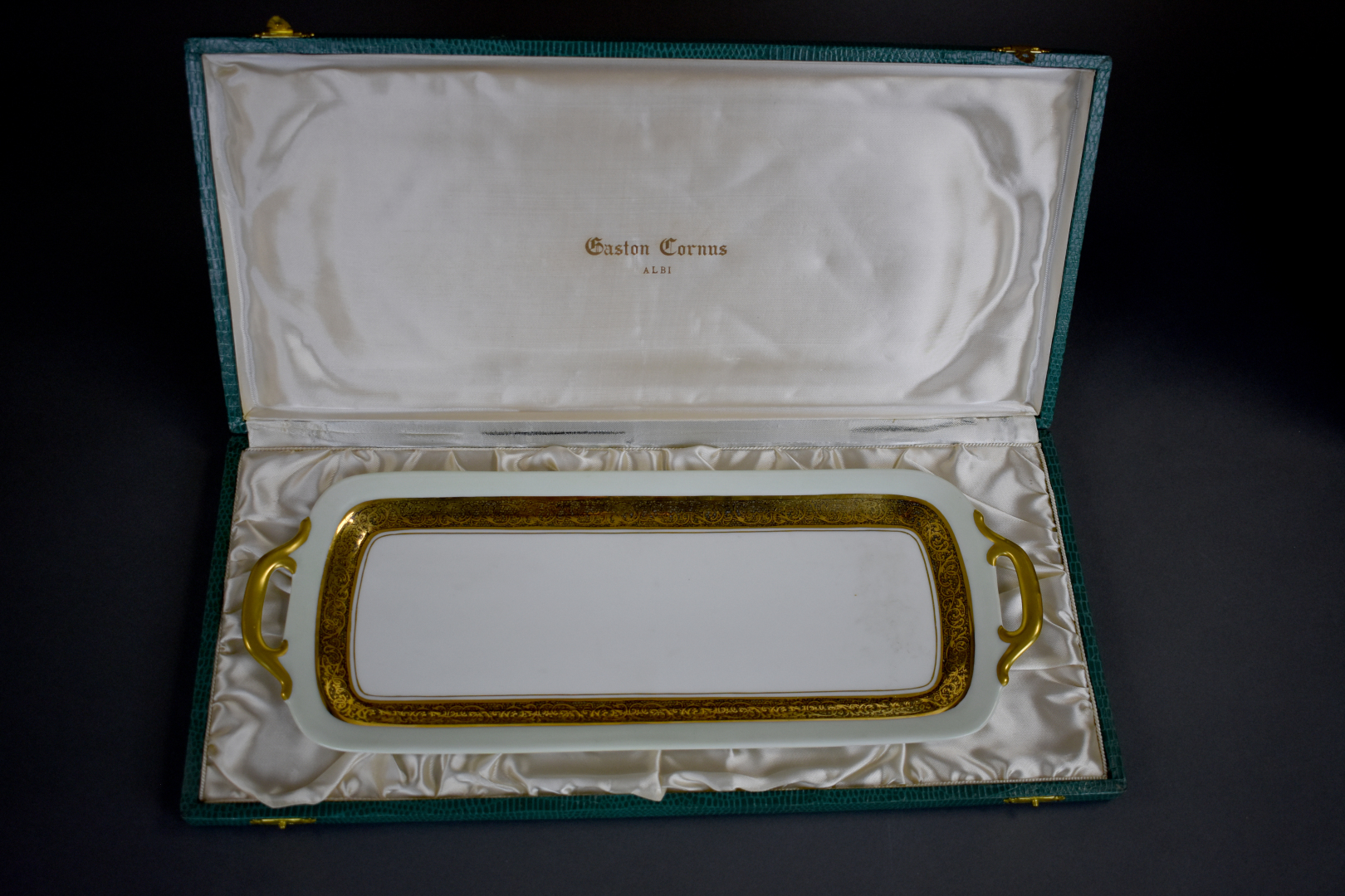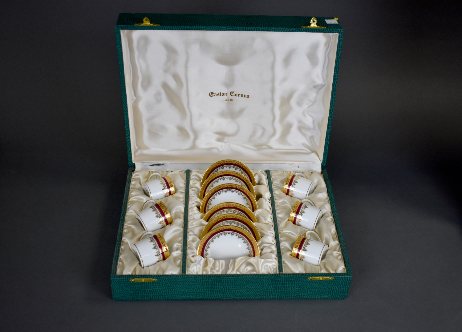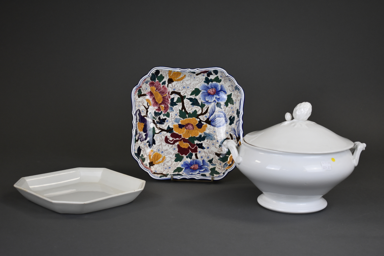 Ensemble soit 3 coffrets contenant de la porcelaine de Limoges René Caire, André Limoges, CH. Field Haviland, une soupière en porcelaine, Gien et divers. On joint un service à café et trois plats en porcelaine, plats en faïence, verseuse en verre et métal et divers..