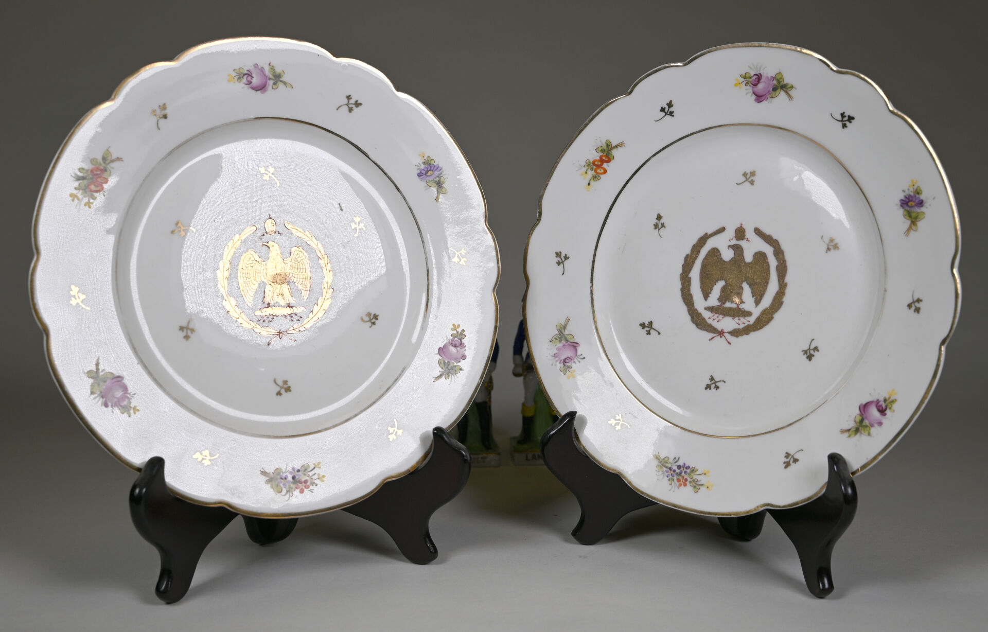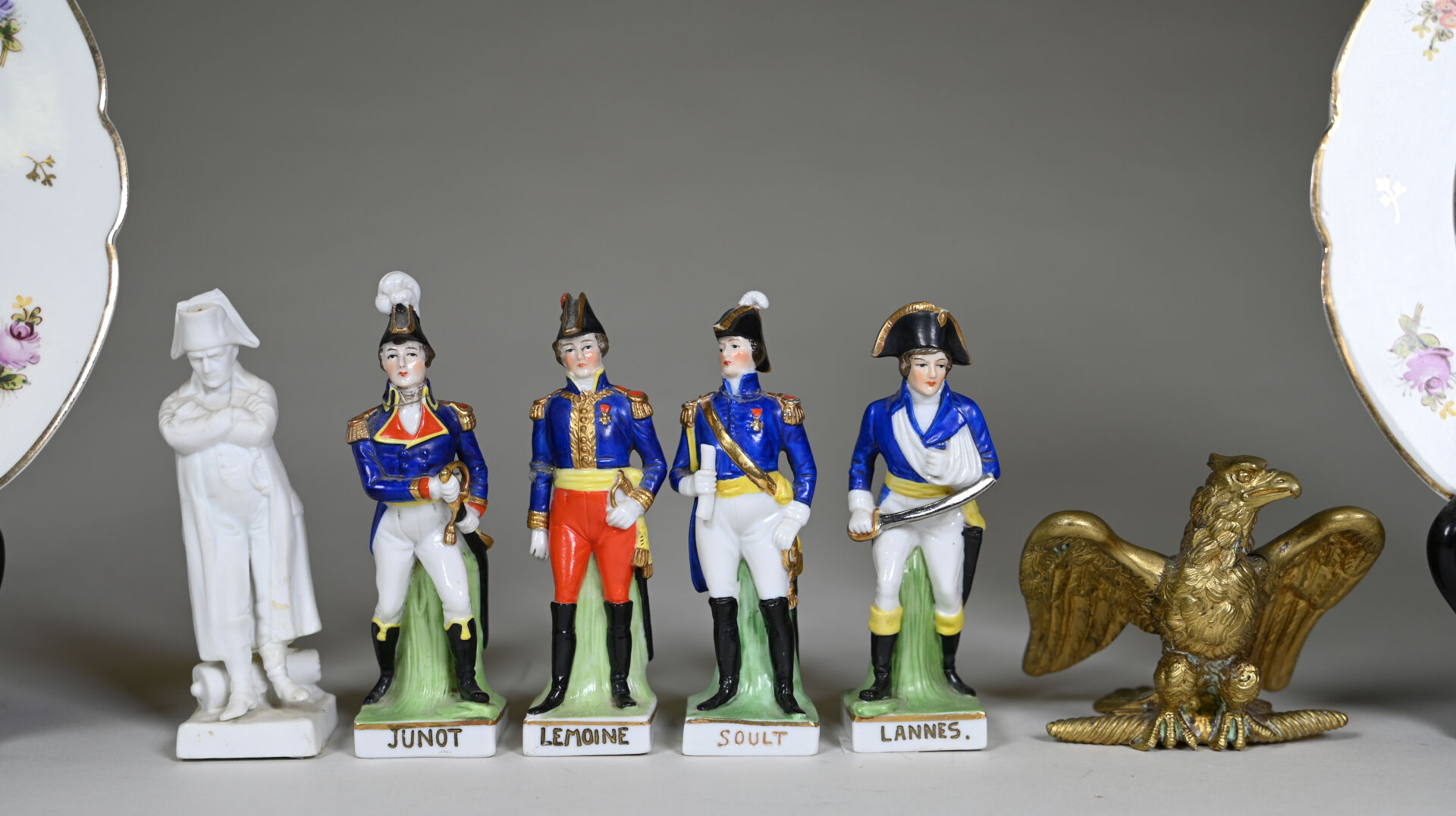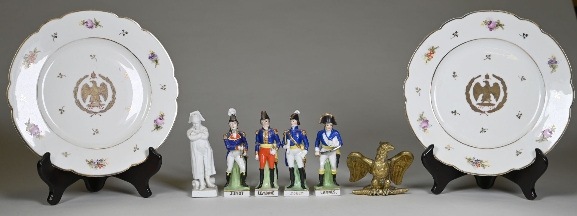Ensemble soit : 4 figurines représentant des Maréchaux de l’Empire soit JUNOT, LANNES (accident au sabre et au tricornes), SOULT, LEMOINE (accident recollé au bras droit). Porcelaine de Ludwigsbourg ? Haut. : 13 cm. On joint une figurine en biscuit représentant l’Empereur Napoléon 1er (accident recollé) ainsi qu’une paire d’assiettes en porcelaine à l’aigle impériale (CAPODIMONTE) et un élément décoratif en bronze doré représentant l’aigle tenant le foudre. Diam des assiettes : 24 cm.