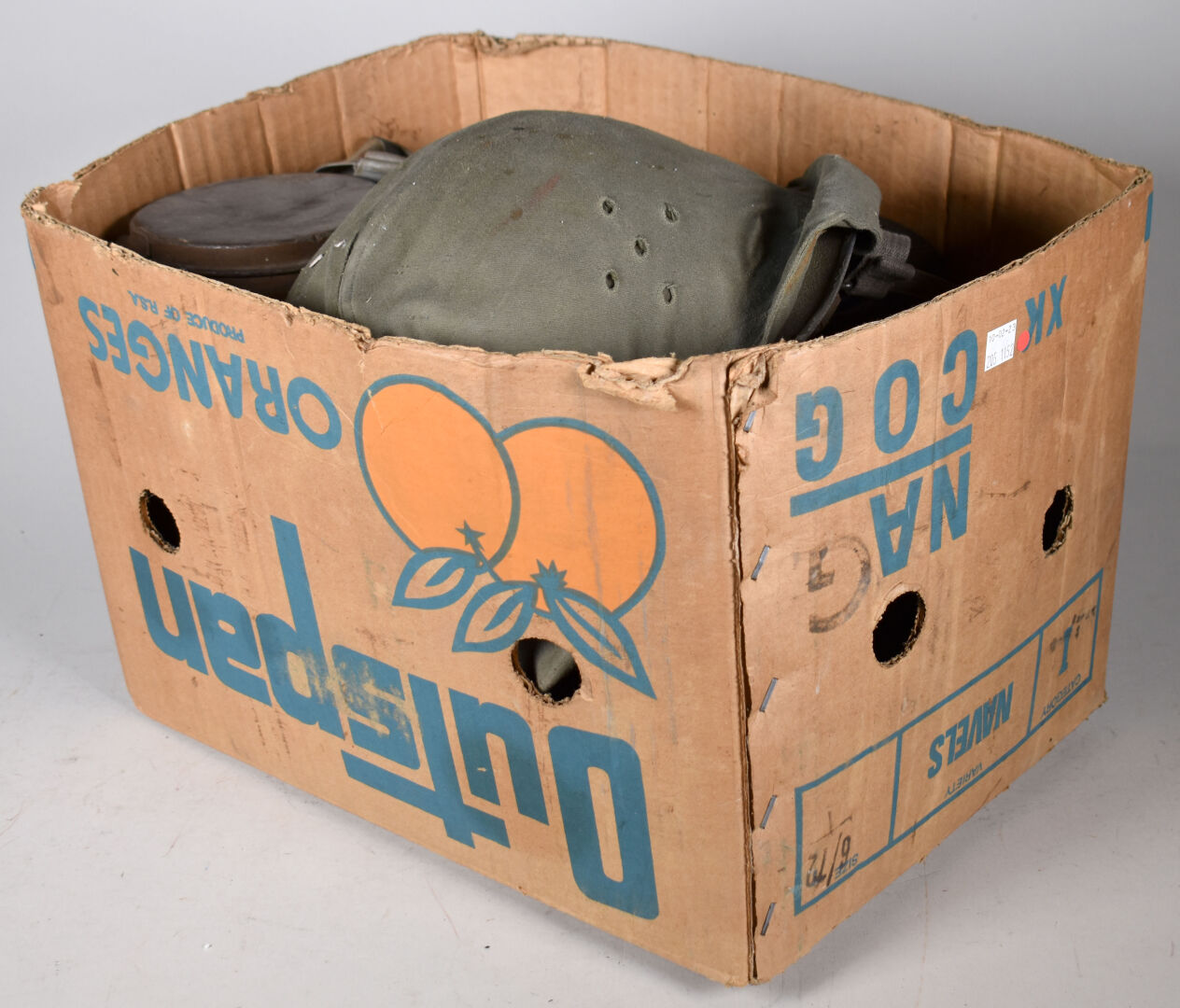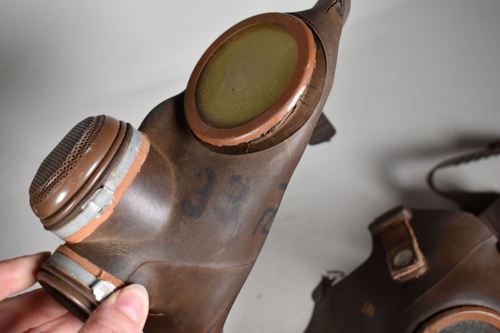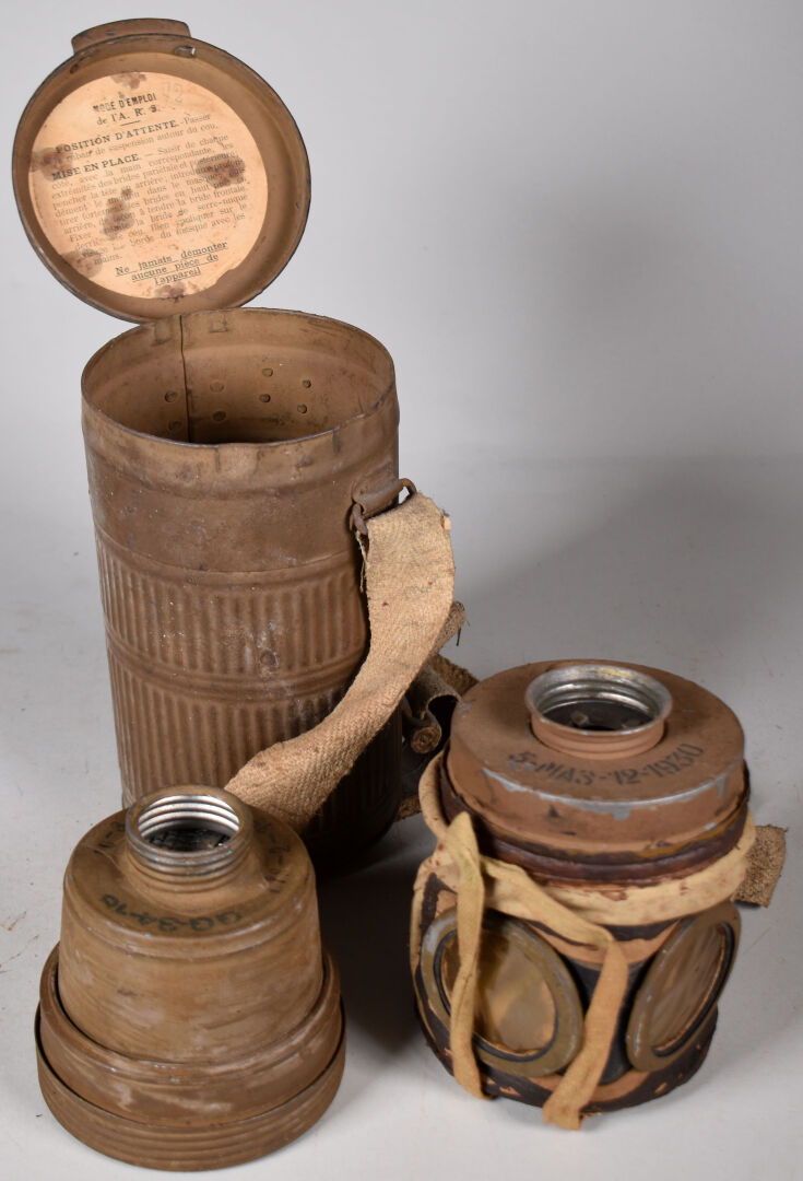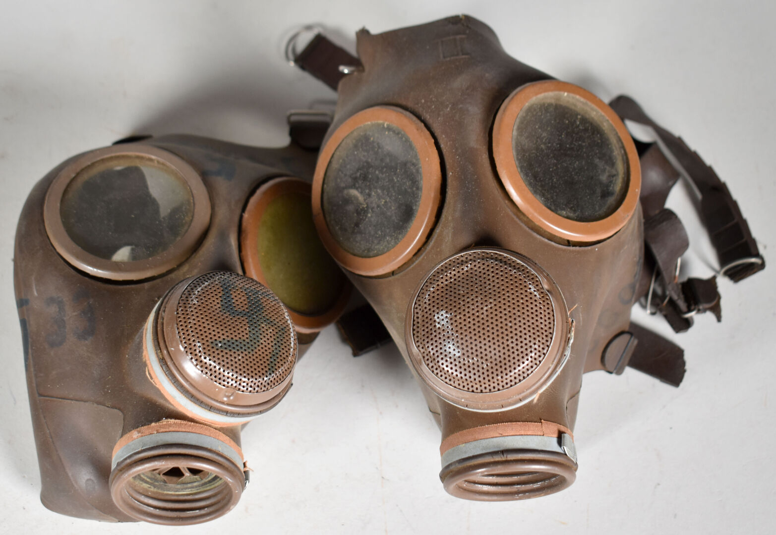 Ensemble soit deux casques avec sous casques (dont modèle 51), un ceinturon et deux masques à gaz (un avec sa boîte).
