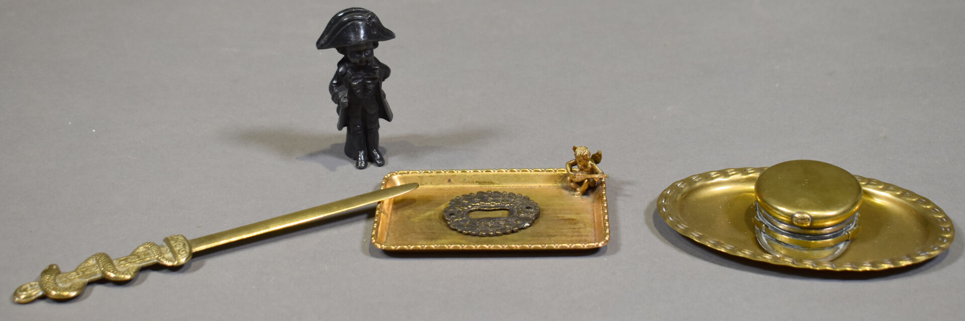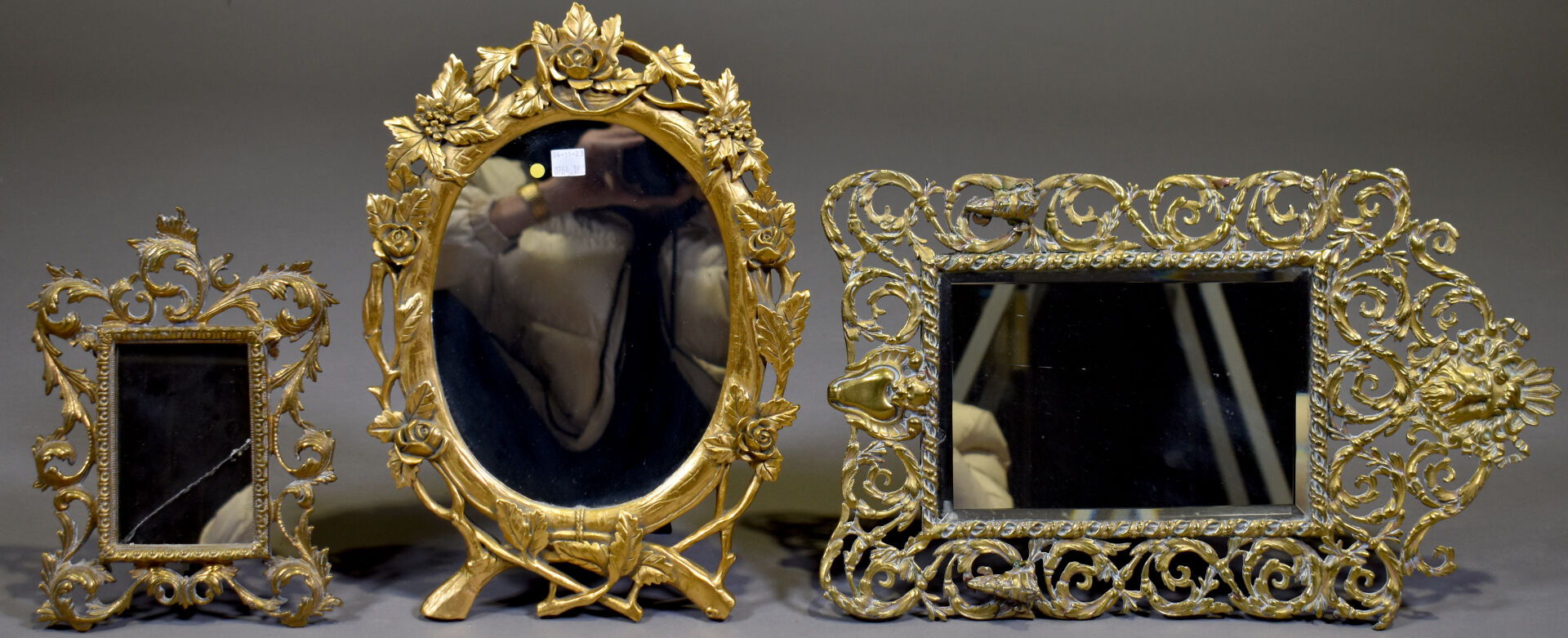 Ensemble soit deux miroirs à poser en bronze ciselé doré, un autre en bois doré, un vide poche orné d’un angelot à la mandoline, une pendulette LANCEL et divers. Dim. du plus grand miroir : 48 x 28 cm. 1 caisse.