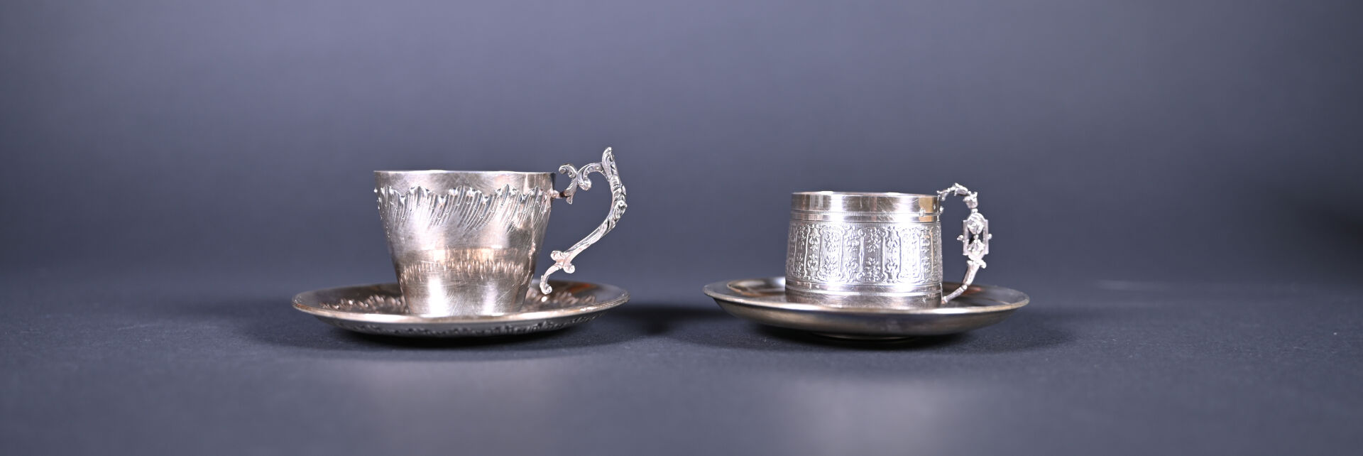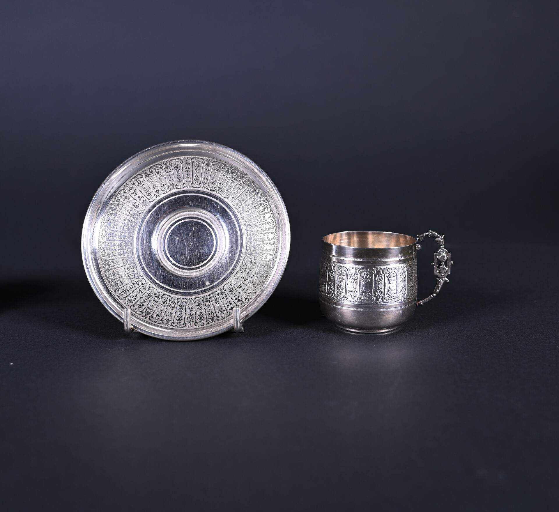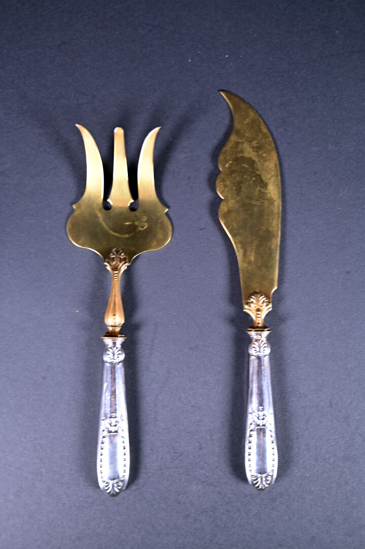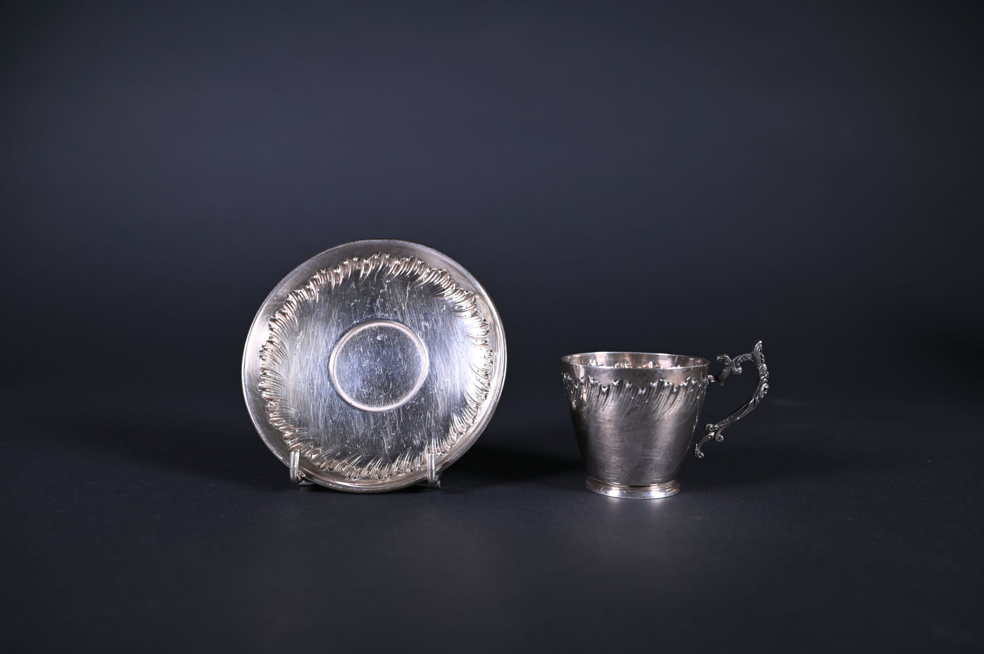 Ensemble soit deux tasses et sous-tasses dépareillées en une saupoudreuse en argent. Poids : 333g. On joint un couvert de service à poisson à manches en argent fourré poids brut. : 225 g. Deux écrins.