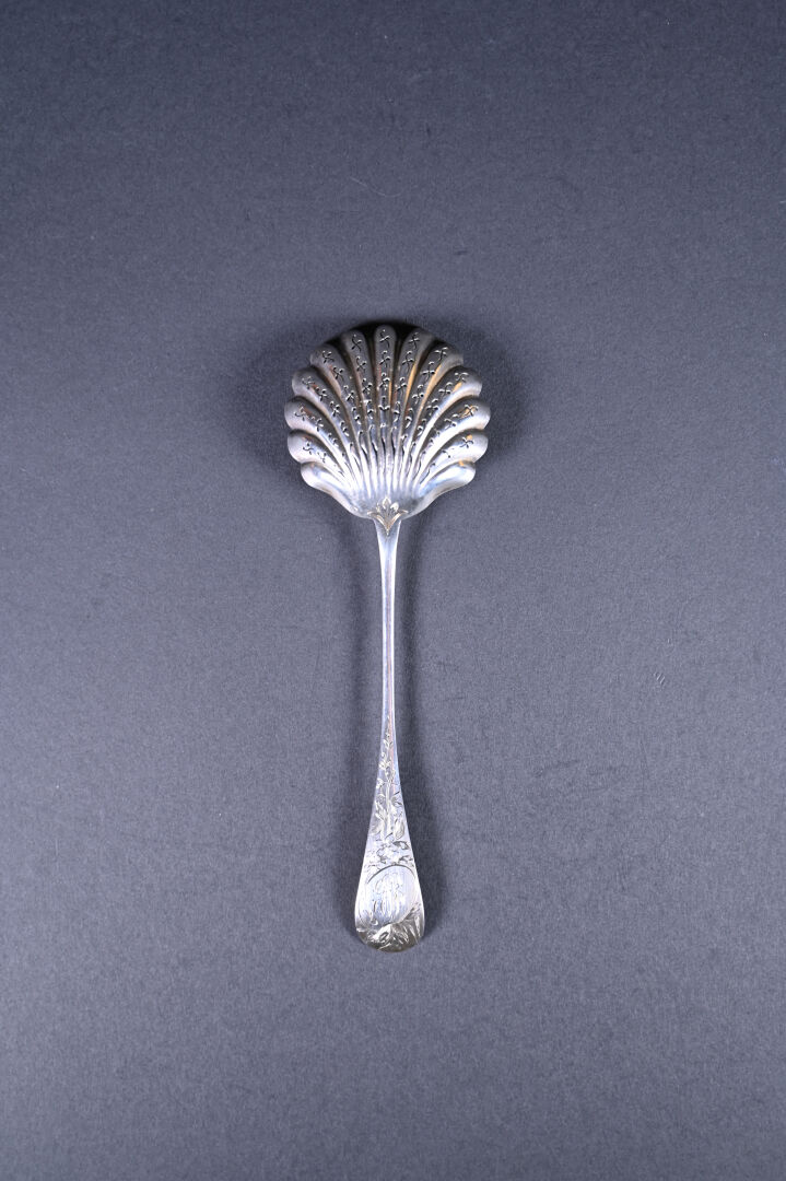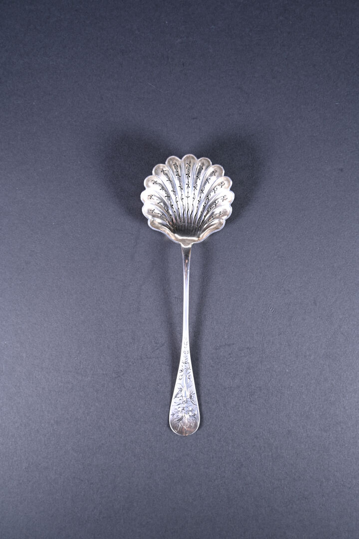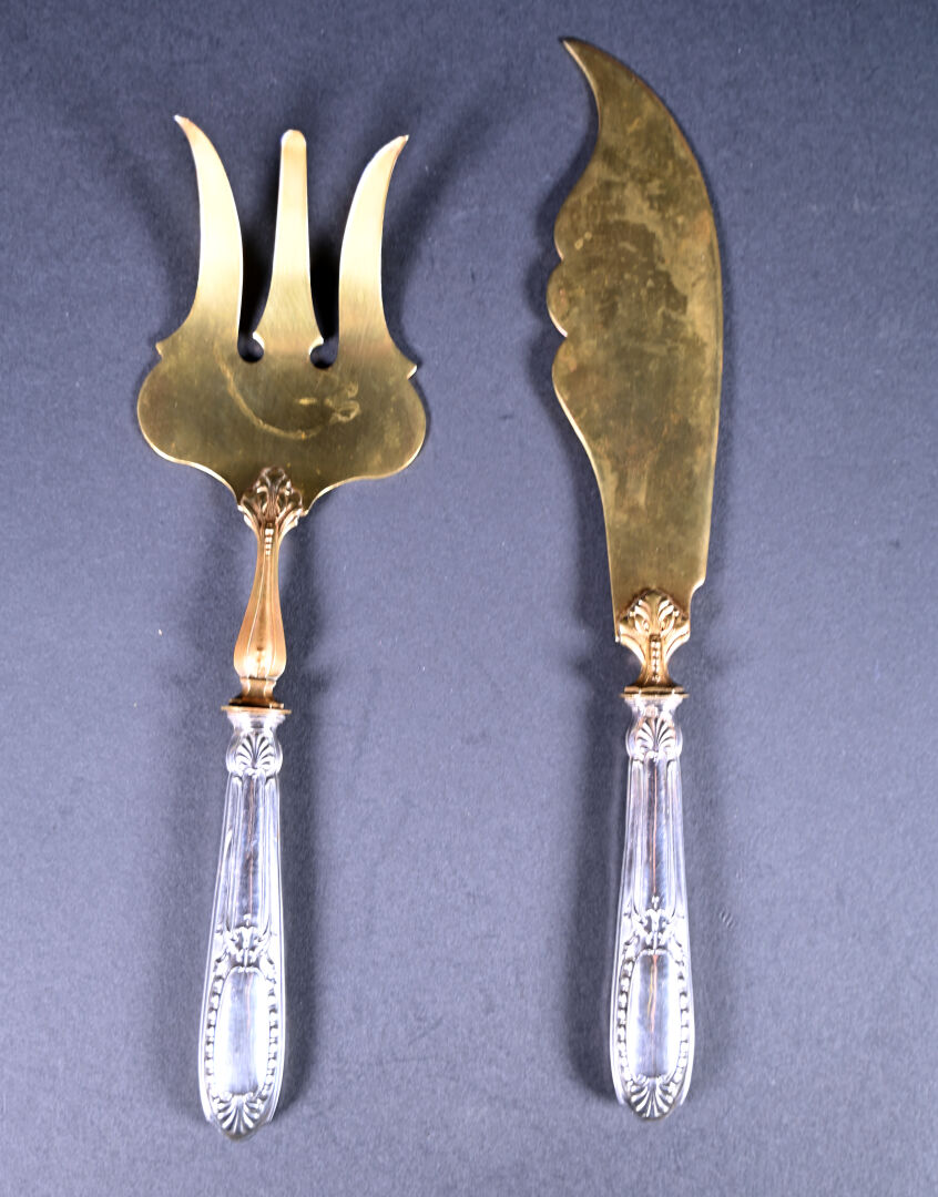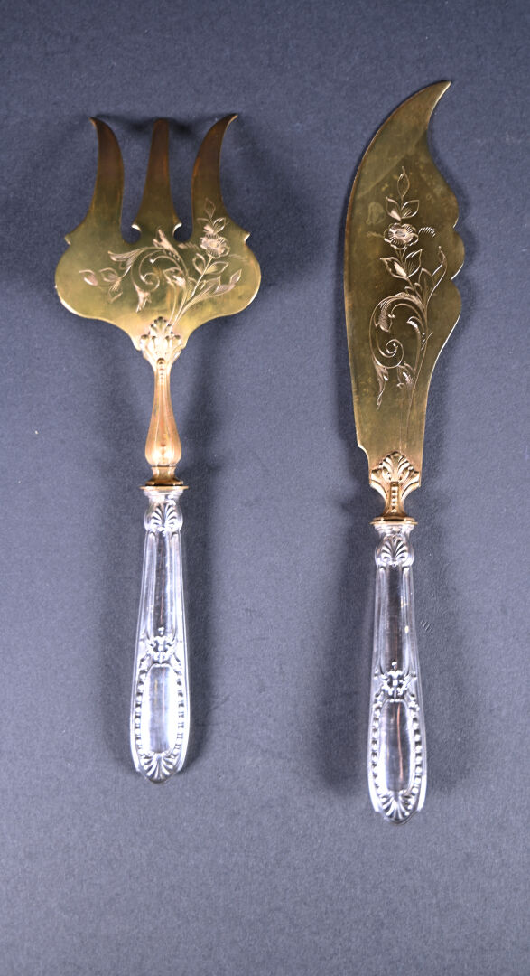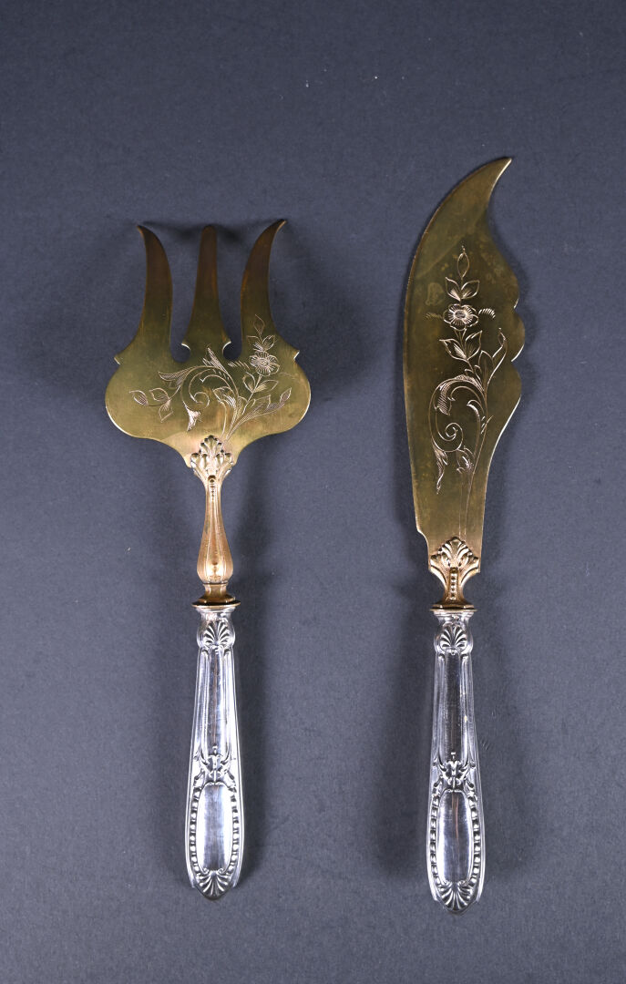 Ensemble soit deux tasses et sous-tasses dépareillées en une saupoudreuse en argent. Poids : 333g. On joint un couvert de service à poisson à manches en argent fourré poids brut. : 225 g. Deux écrins.