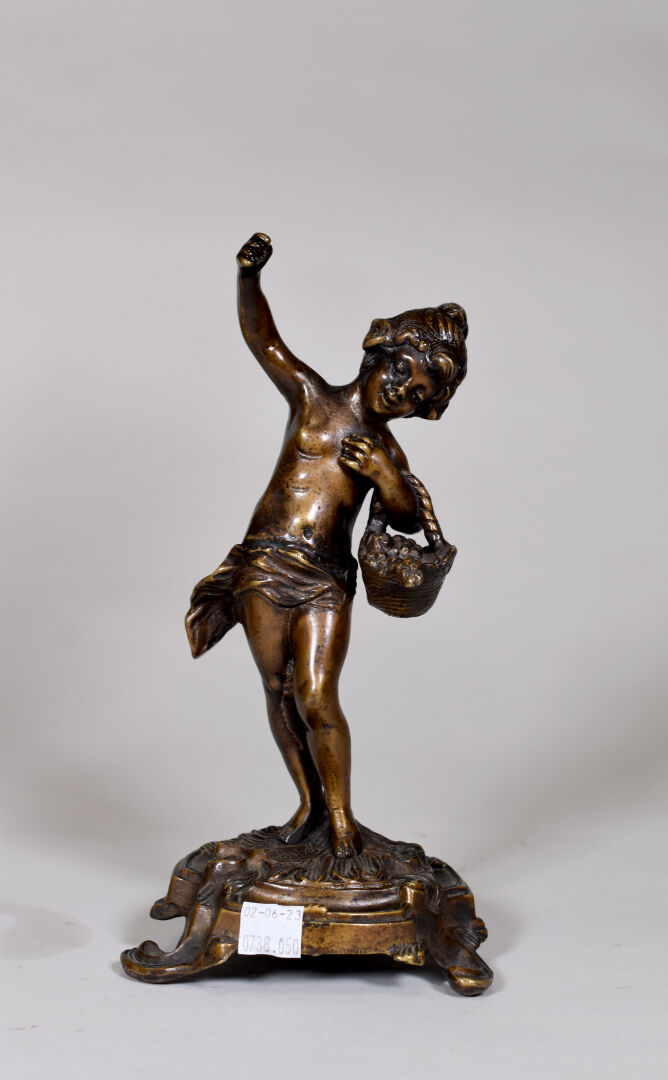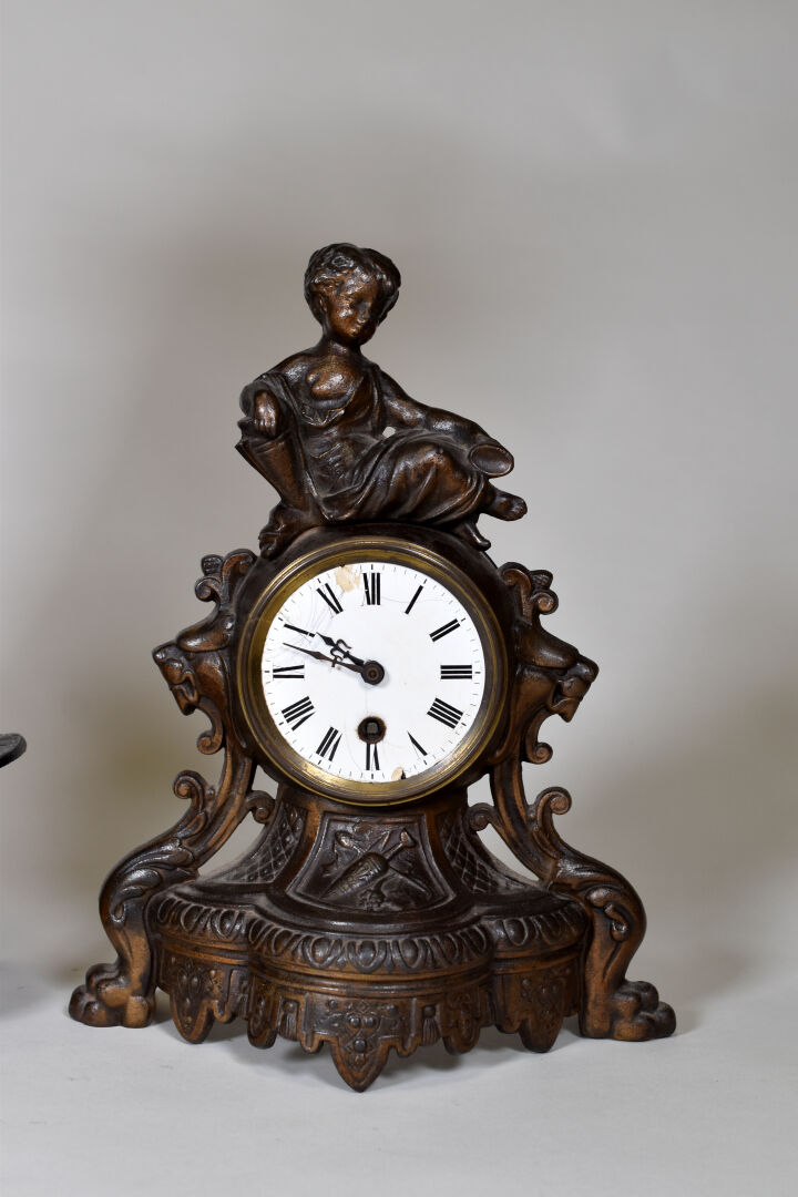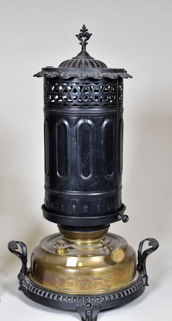 Ensemble soit poêle à pétrôle RUBIS en métal (Haut. : 59 cm), un régule représentant un faucheur à socle de bois (Haut. : 38 cm) , une pendule en métal (accident au cadran) et un bronze figurant une jeune fille tenant un panier de fruits.