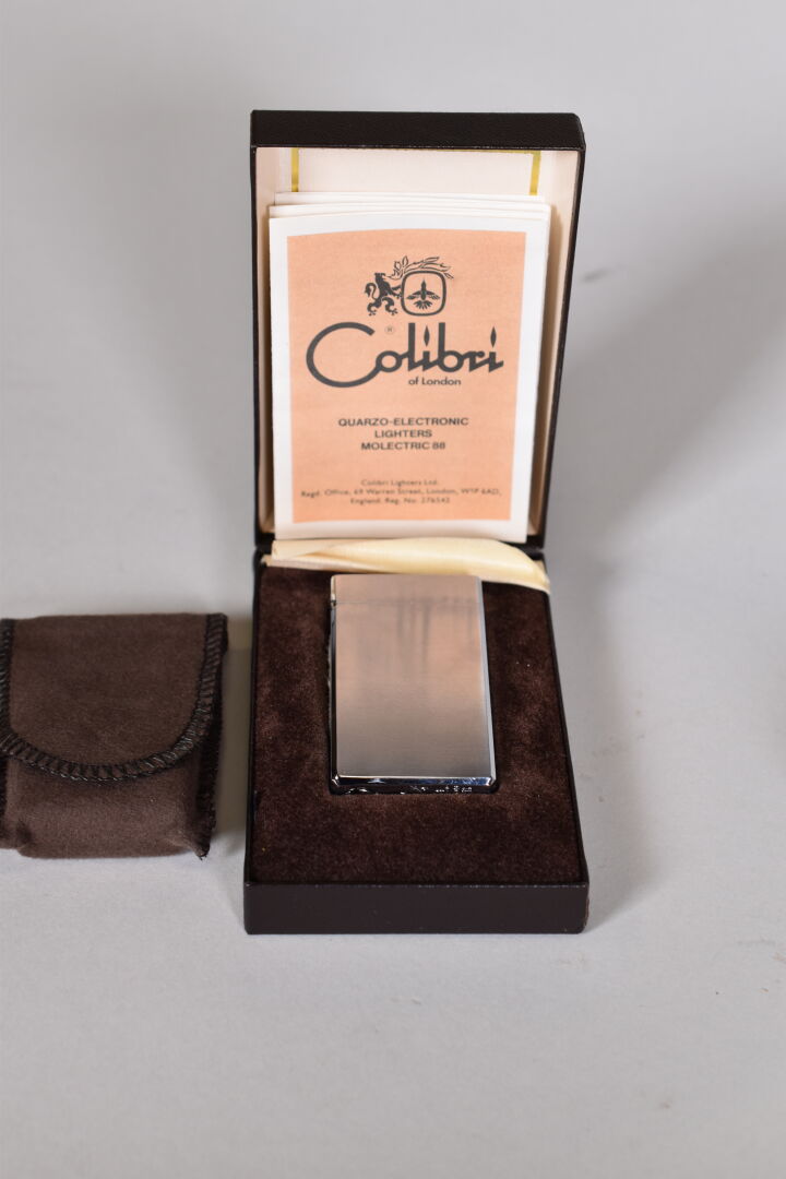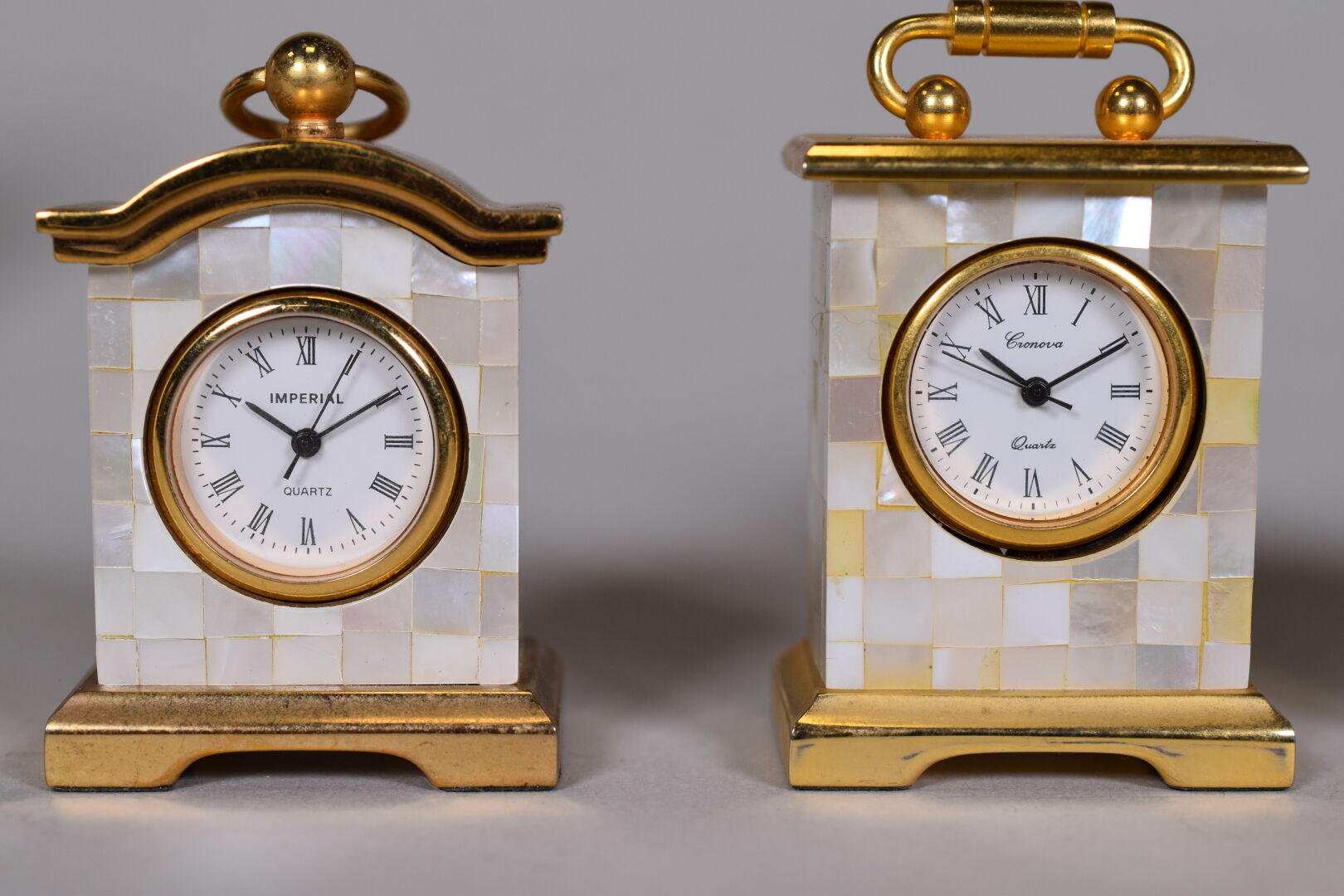 Ensemble soit trois réveils miniature dont deux à décor marqueté de plaques de nacre, mouvements à quartz. On joint un briquet de marque COLIBRI en métal gris (boite).