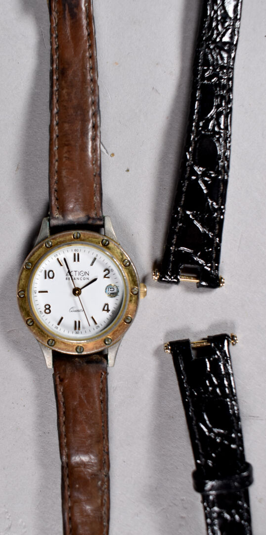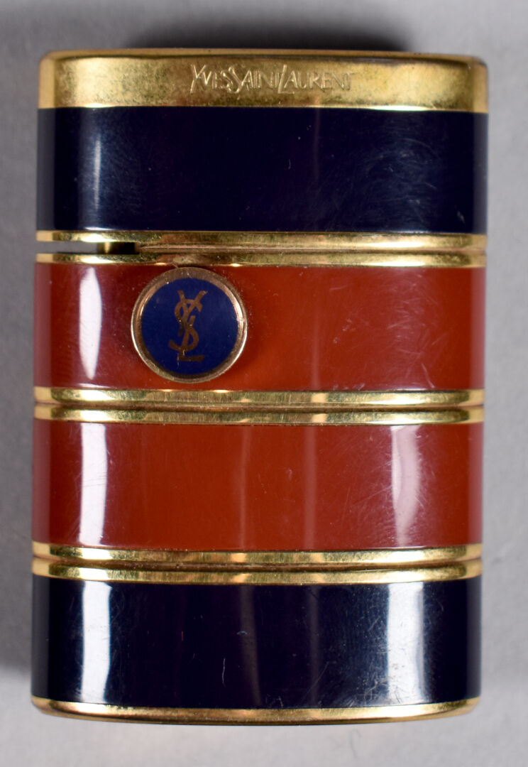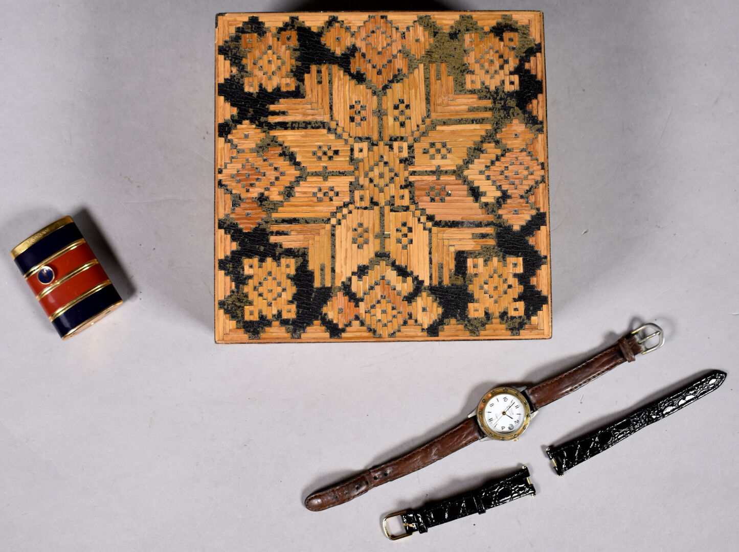 Ensemble soit un briquet en métal doré émaillé rouge et bleu Yves ST Laurent, une boite marquetée de paille et une montre bracelet ACTION (usures).