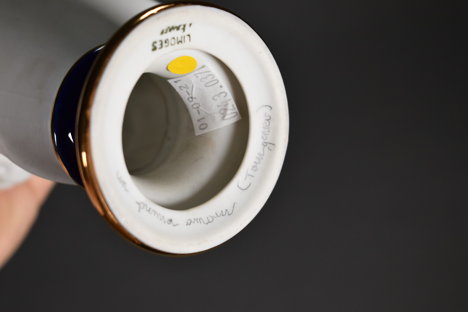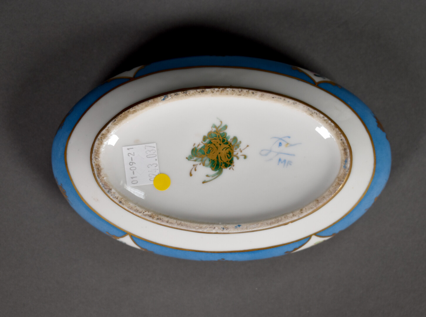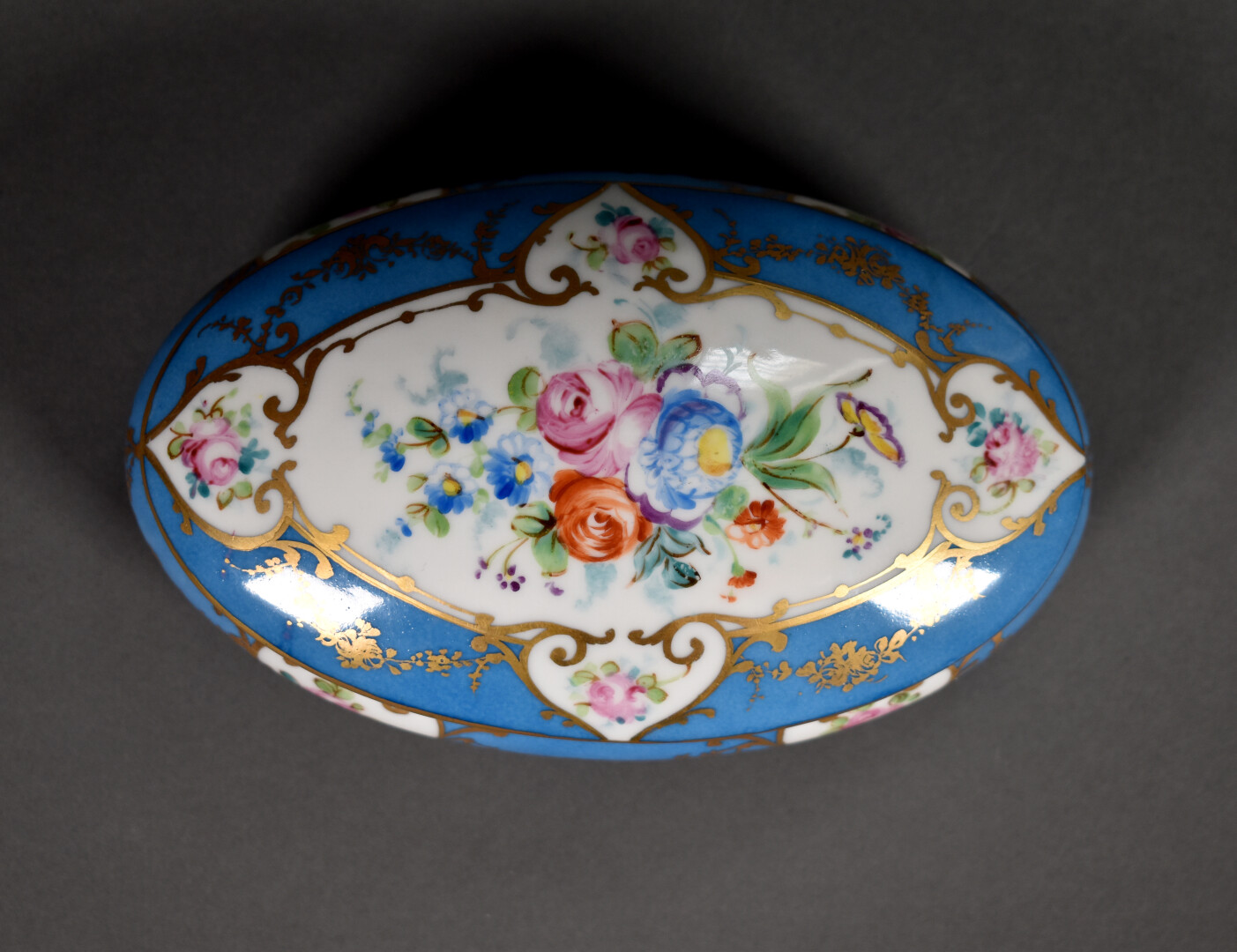Ensemble soit un buste en biscuit et porcelaine représentant un jeune garçon. Limoges, XXe siècle. Haut. : 19 cm. Et une bonbonière en porcelaine de Sèvres à décor polychrome de fleurs sur fond bleu céleste. XXe siècle. Haut. : 7,5 cm.