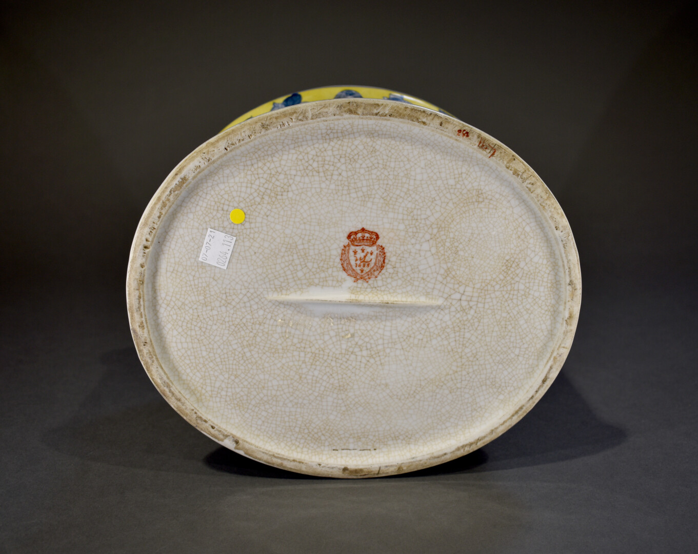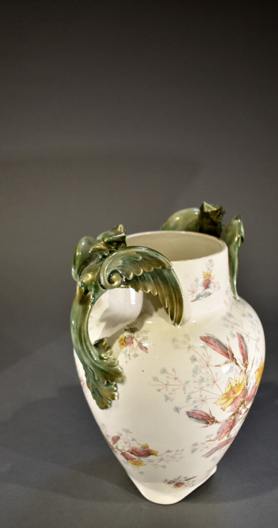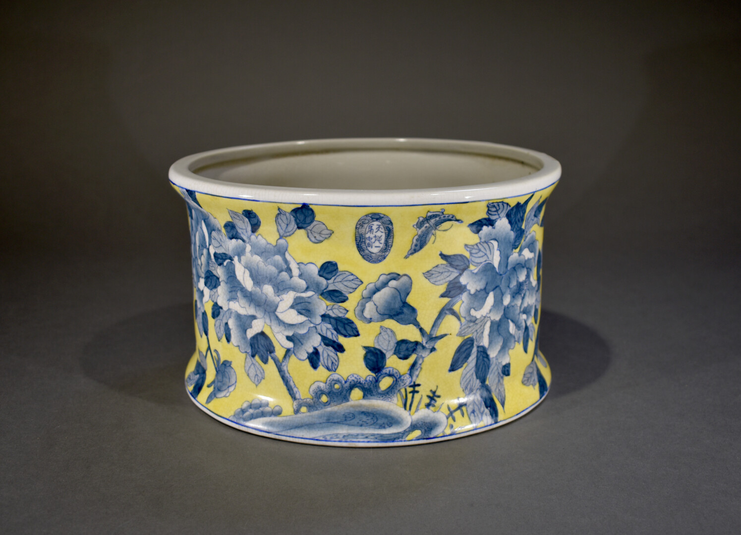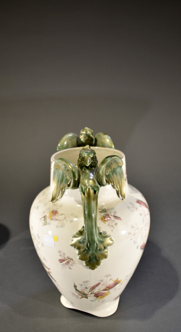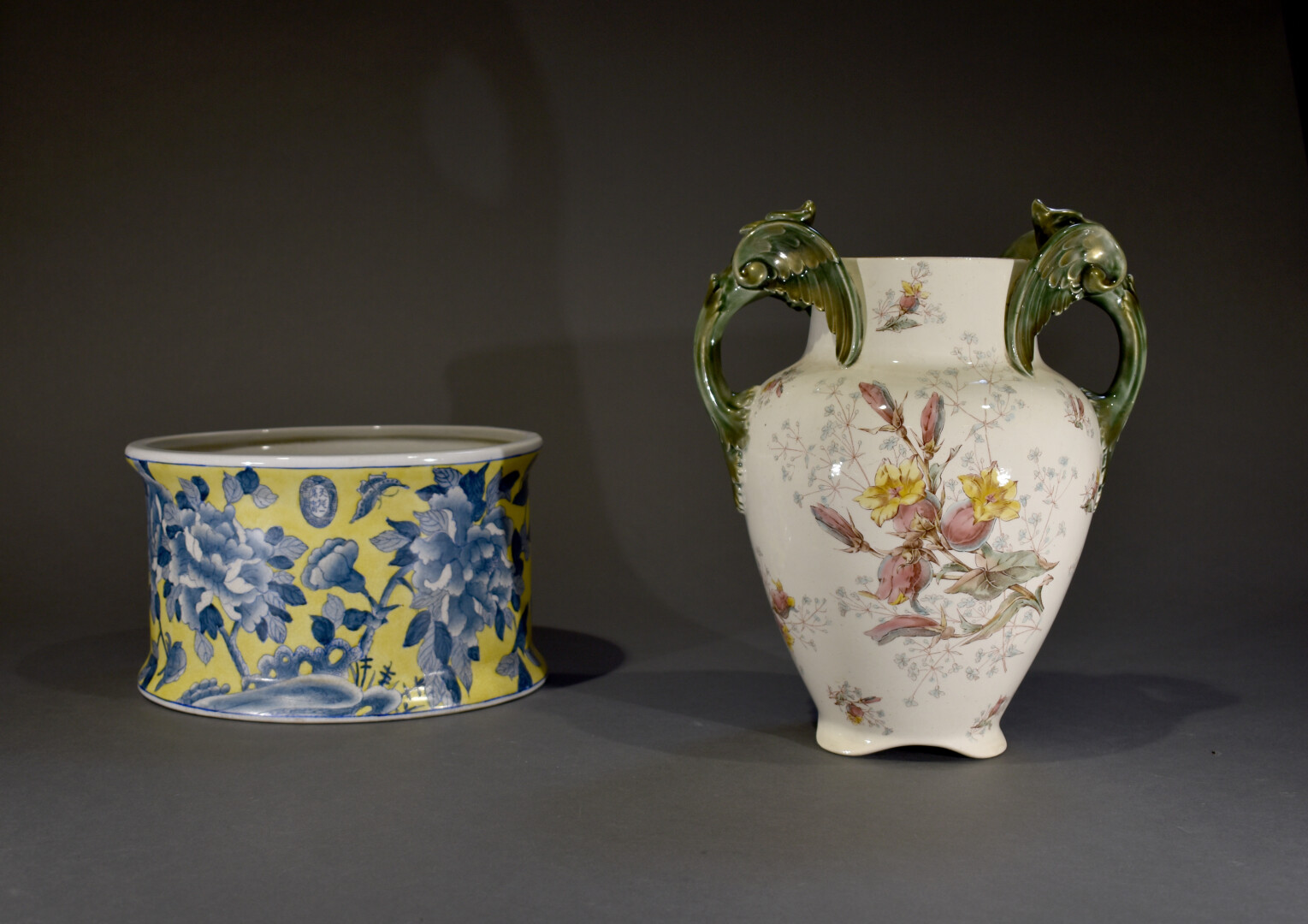 Ensemble soit un cache-pot en faïence à décor en bleu de pivoines sur fond jaune, avec cachet sous la basee et un vase à anses en faïence à décor de fleurs, les anses en vert figurant des oiseaux. Haut. : 16 cm – Haut. : 30 cm.