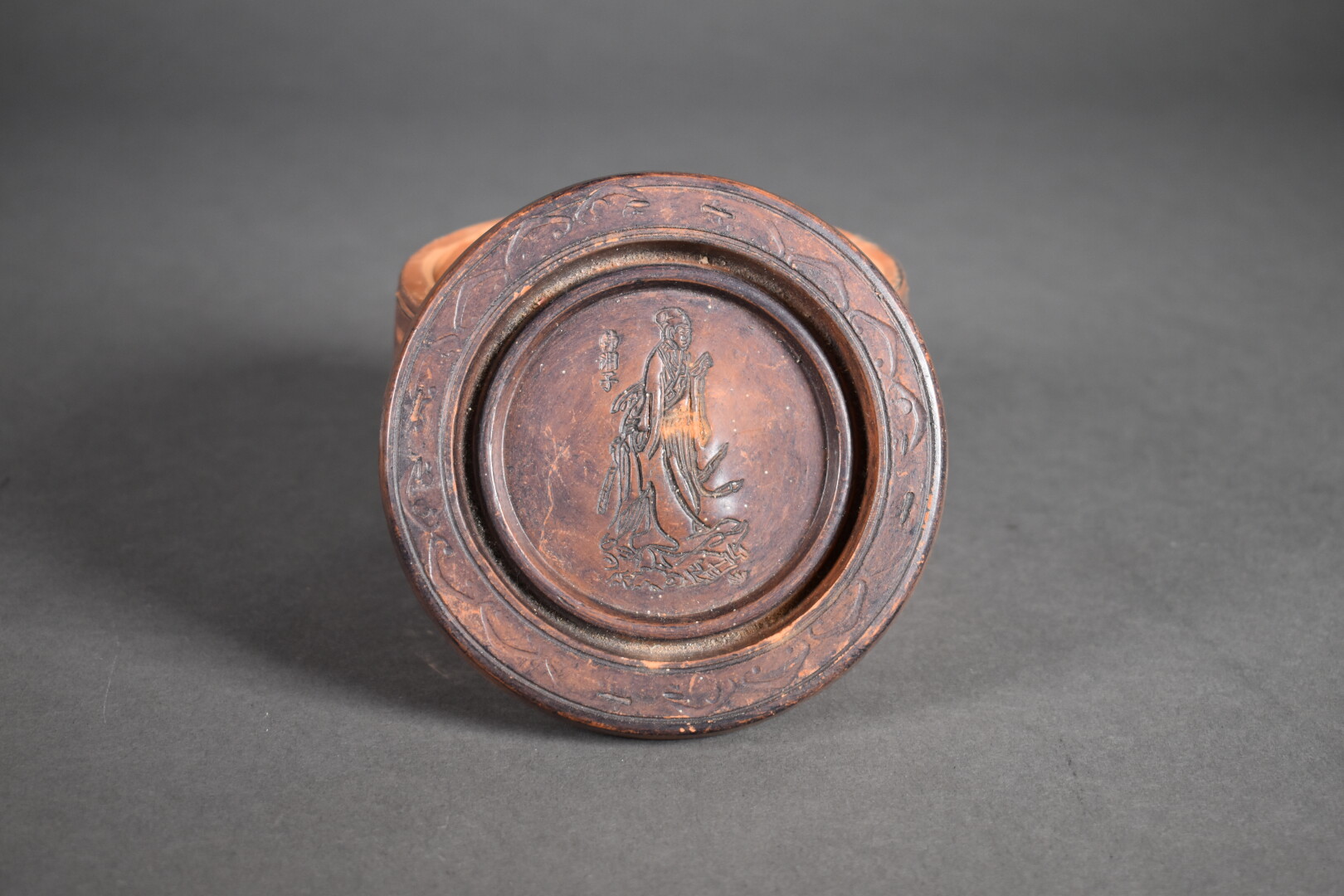 Ensemble soit un cadre en bois de rose sculpté, Indochine , une boîte à thé en terre cuite YiXin et une pipe à eau en porcelaine, Indochine.