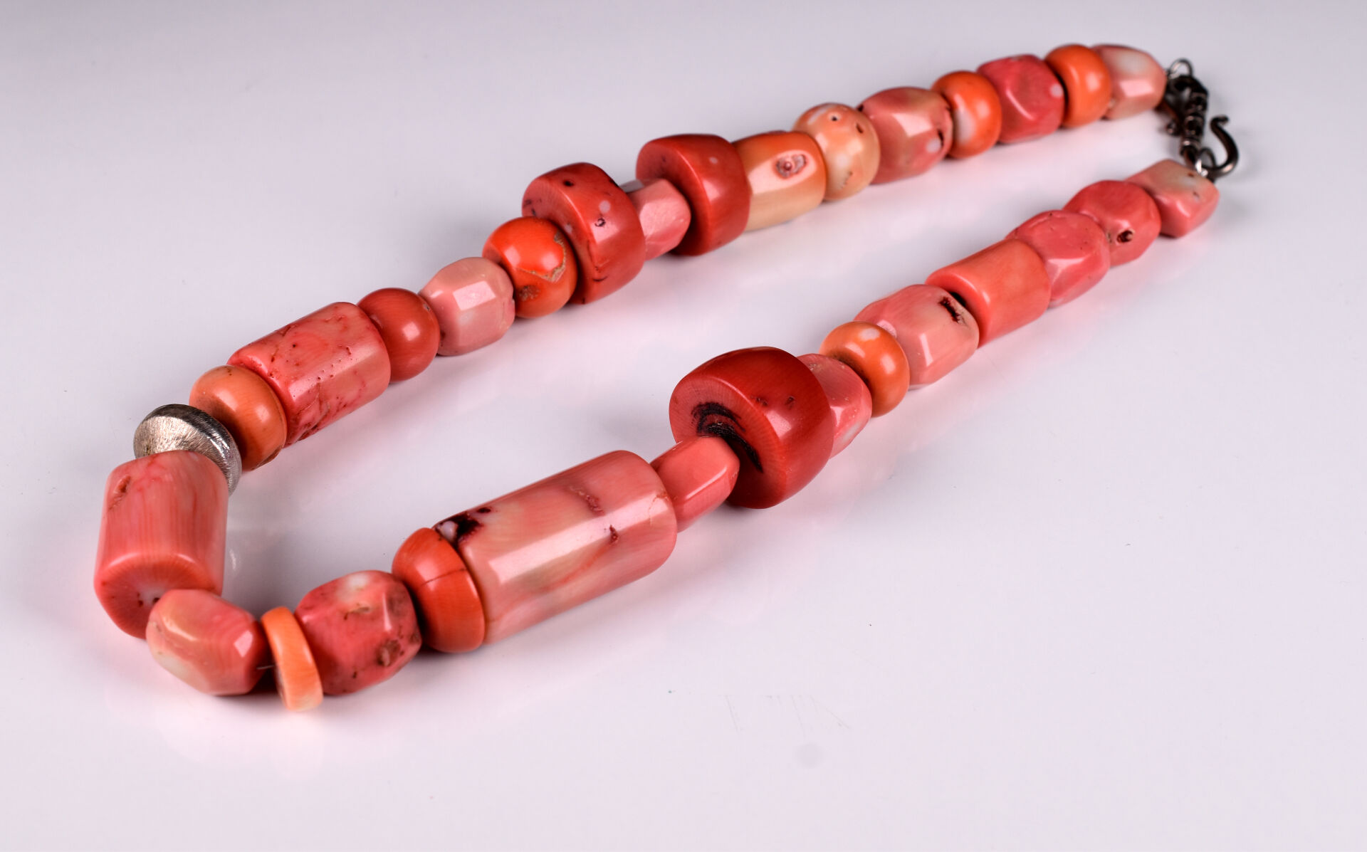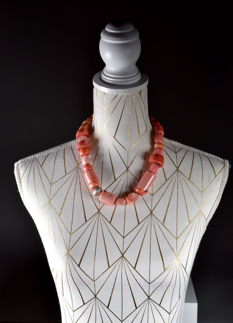 Ensemble soit un collier de perles de corail à fermoir en argent et une bague en argent. Poids brut. total. : g.
