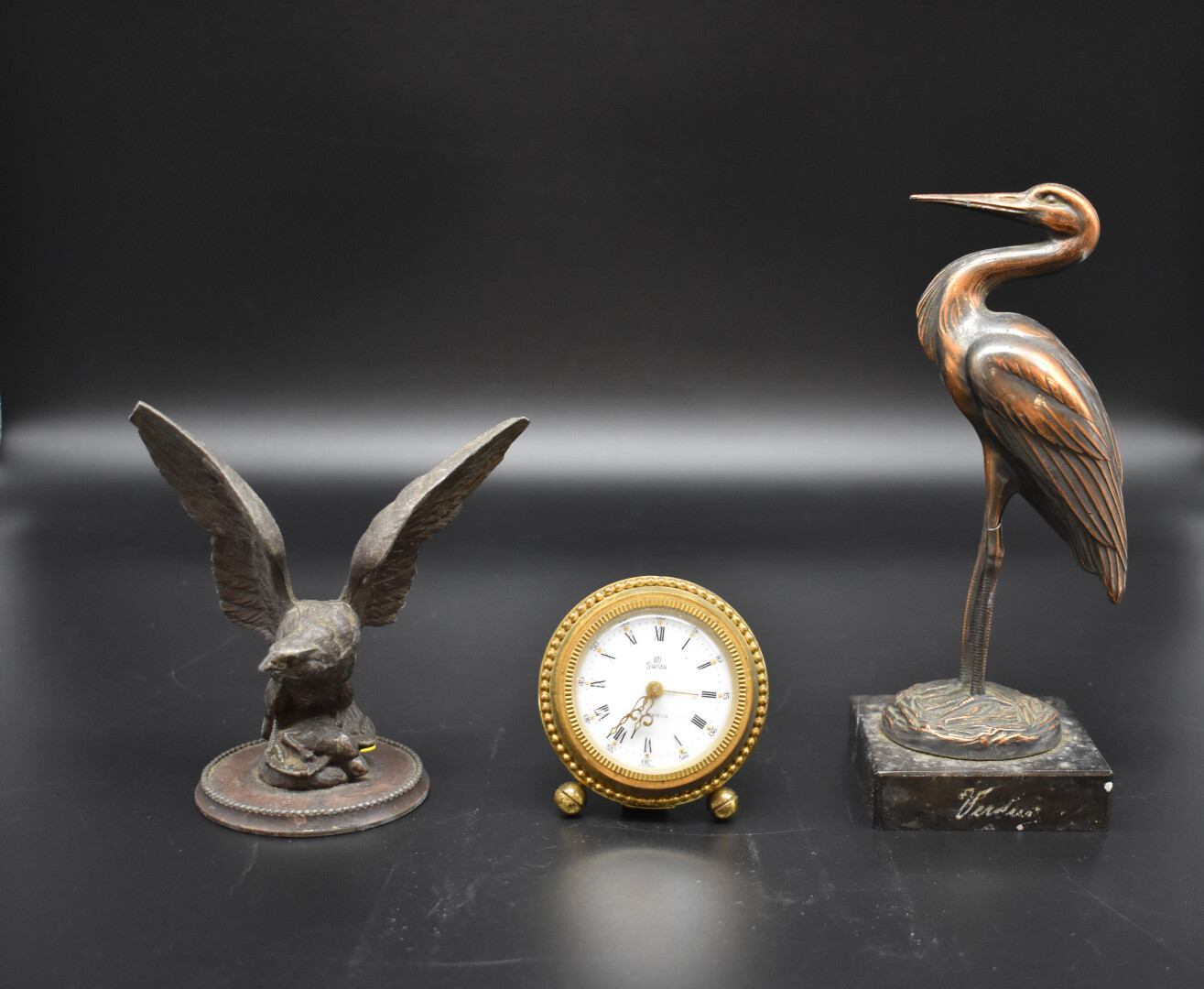 Ensemble soit un échassier en bronze creux ou cuivre avec socle en pierre dure noire, un aigle en régule patiné brun et une pendulette en laiton SWIZA. Haut. échassier : 19 cm.
