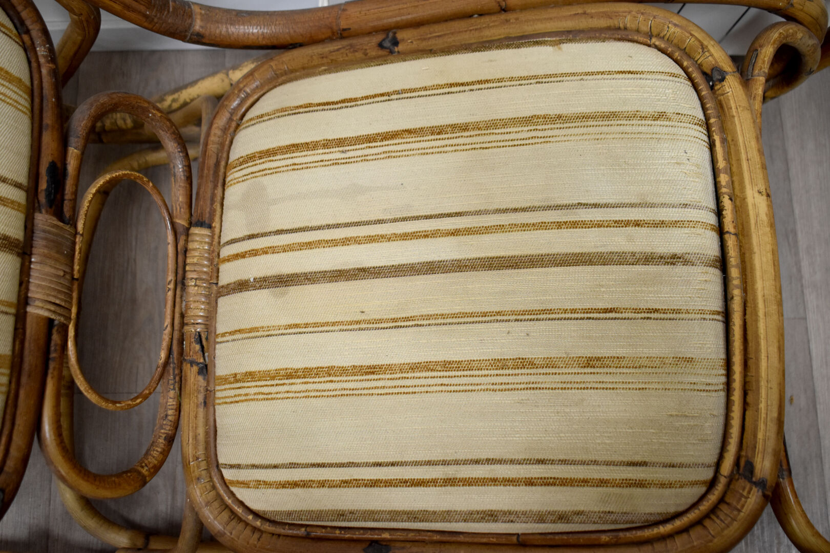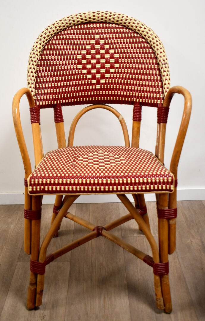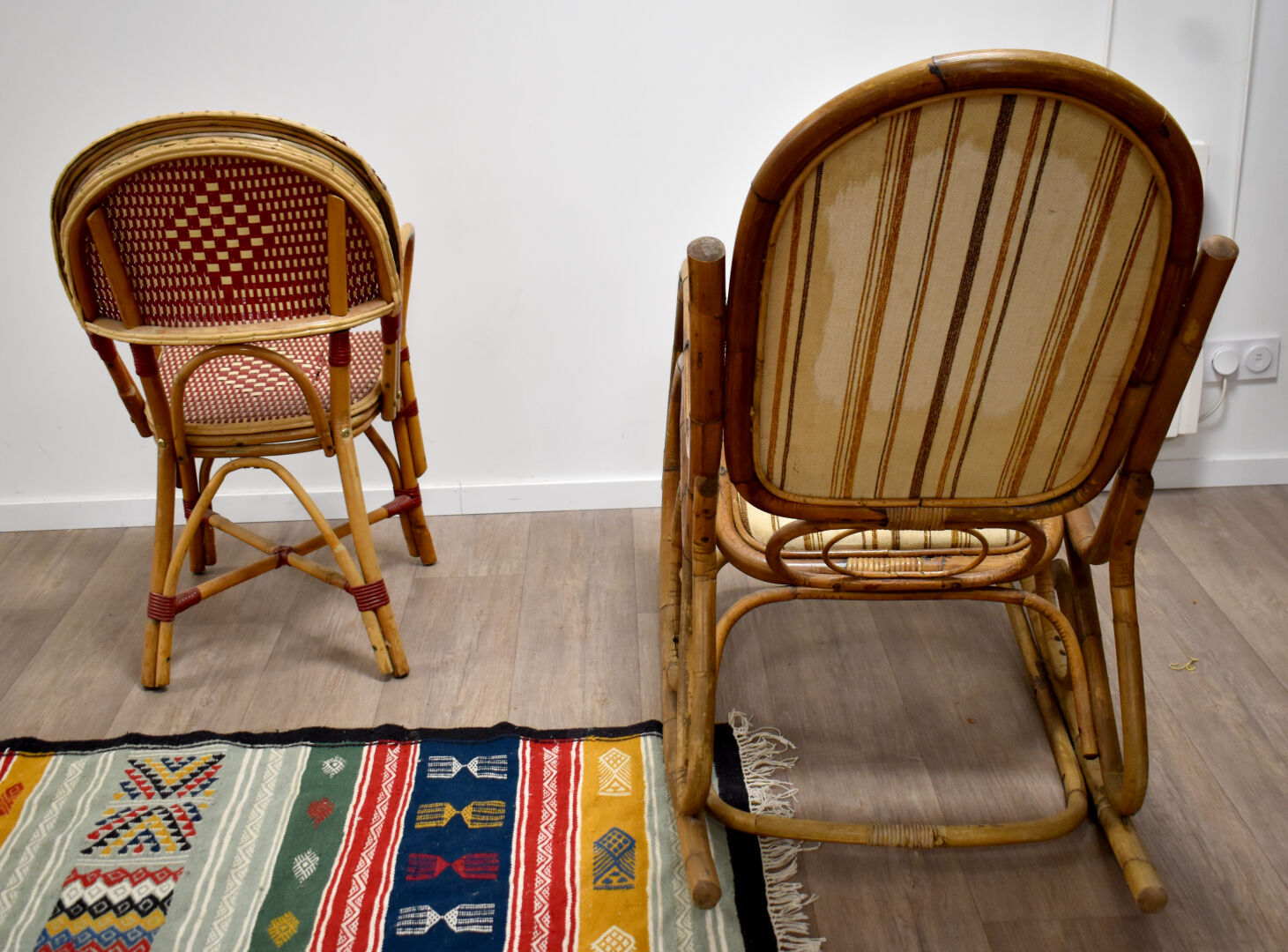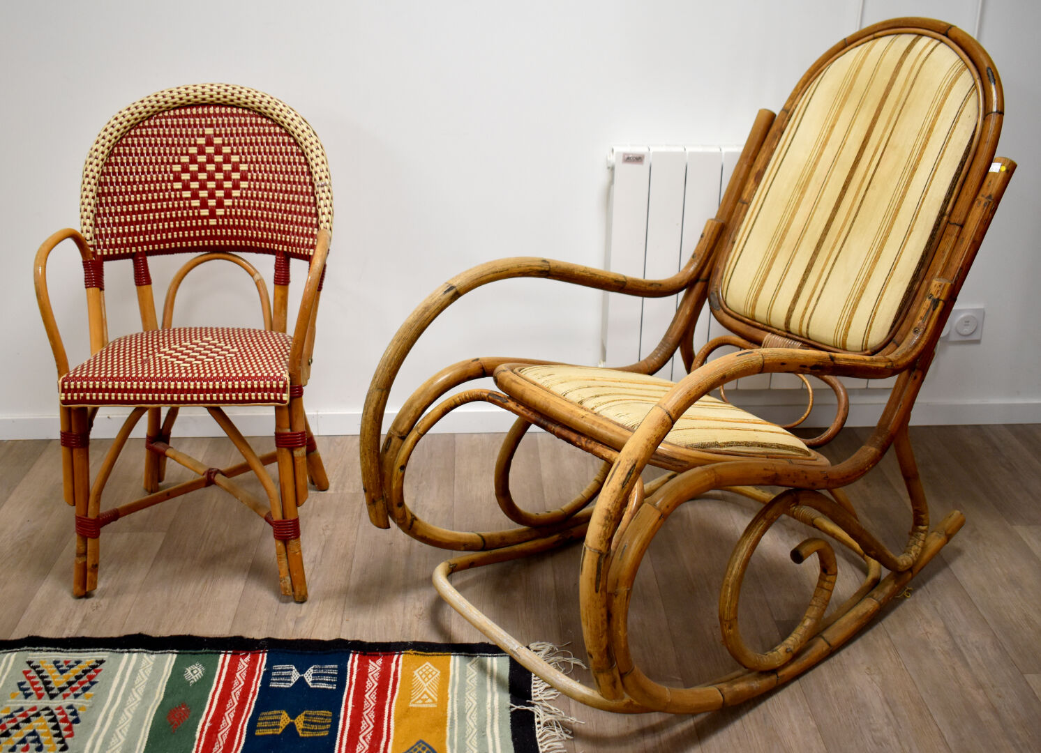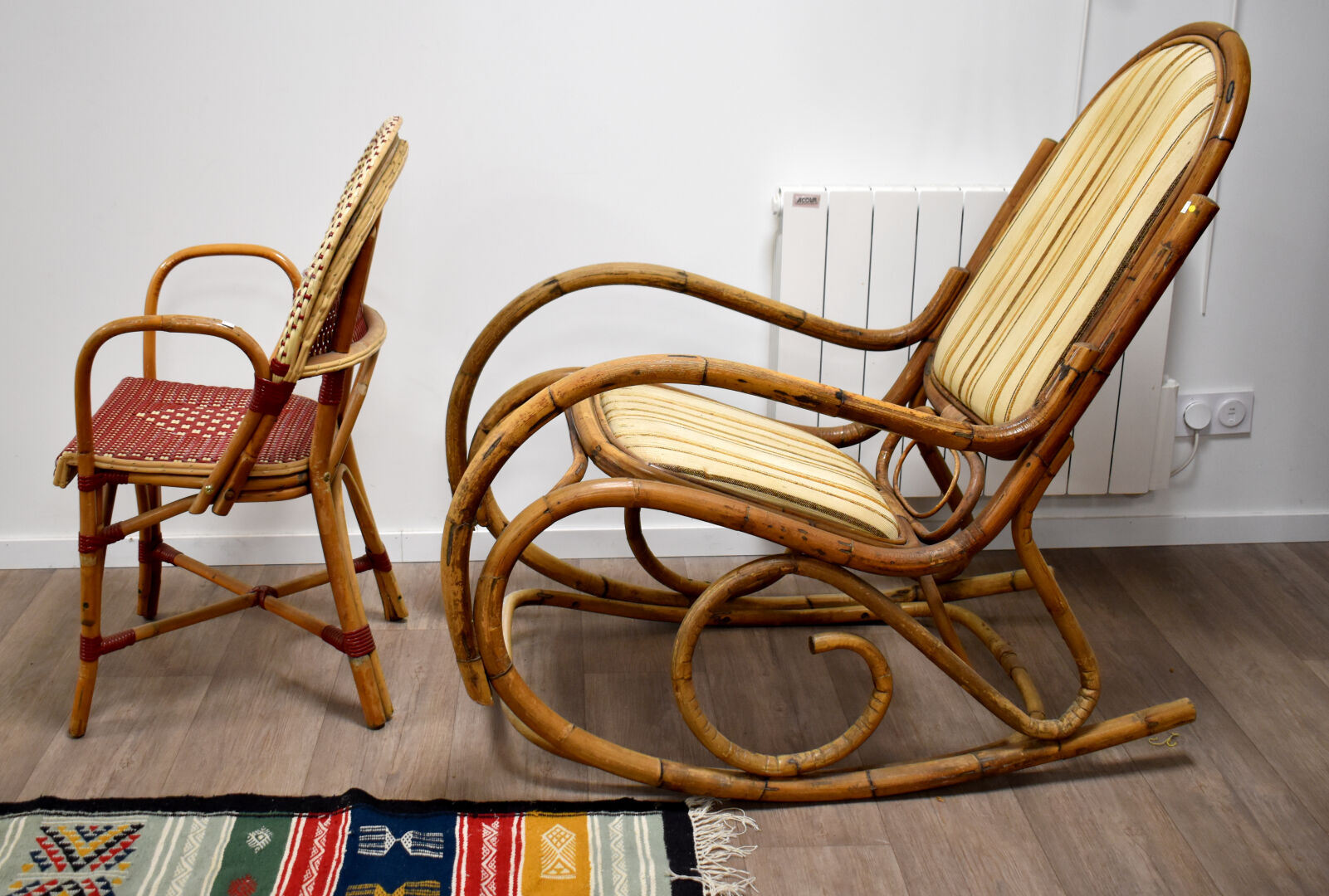 Ensemble soit un fauteuil à bascule en rotin à garniture de tissus beige (usures). Haut. : 103 cm et un fauteuil de terasse de bistrot en rotin et résine rouge et crème tressée (assise fendue). Haut. : 89 cm.