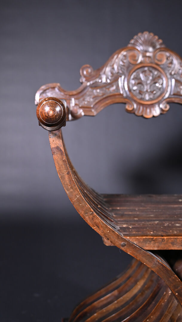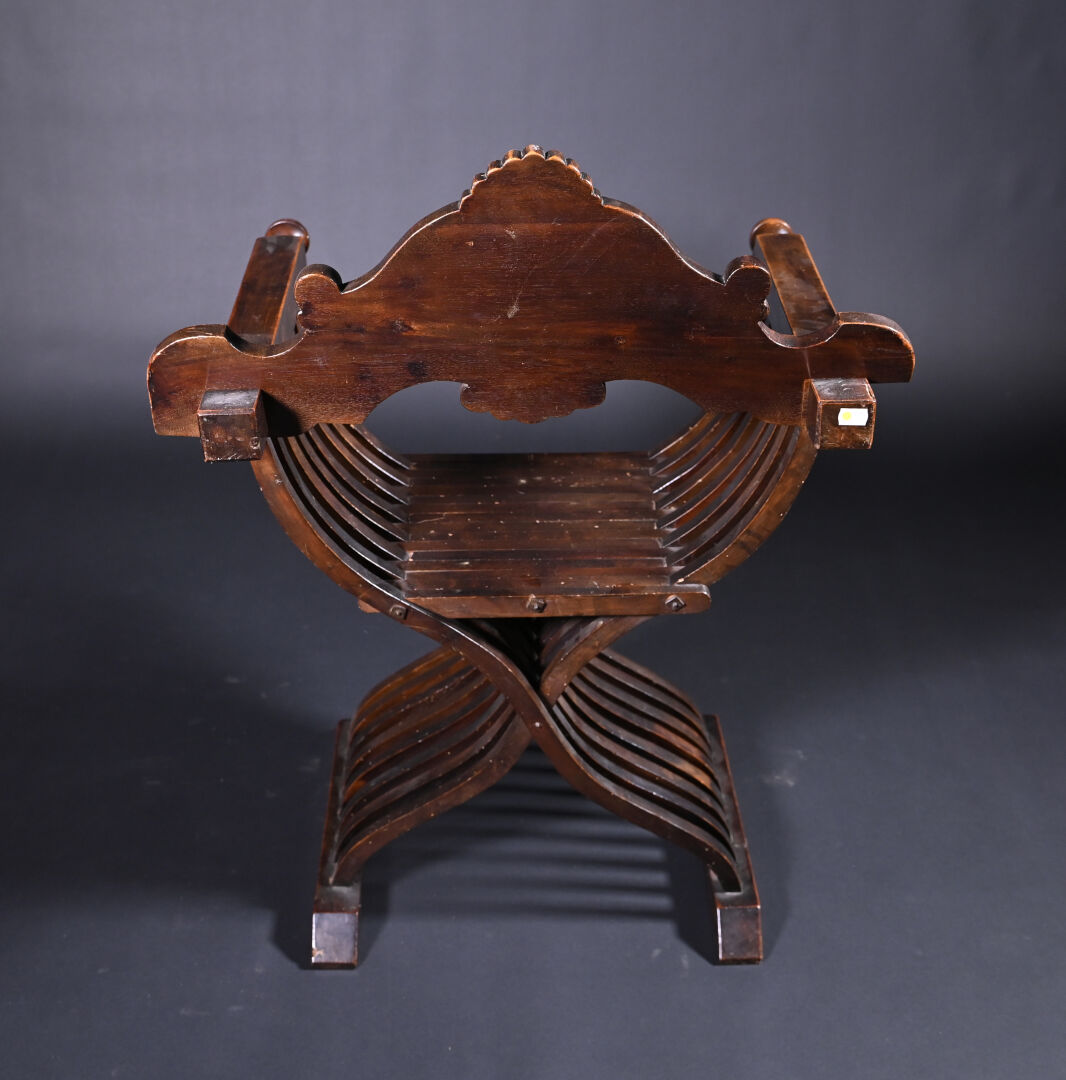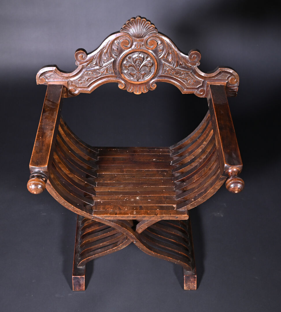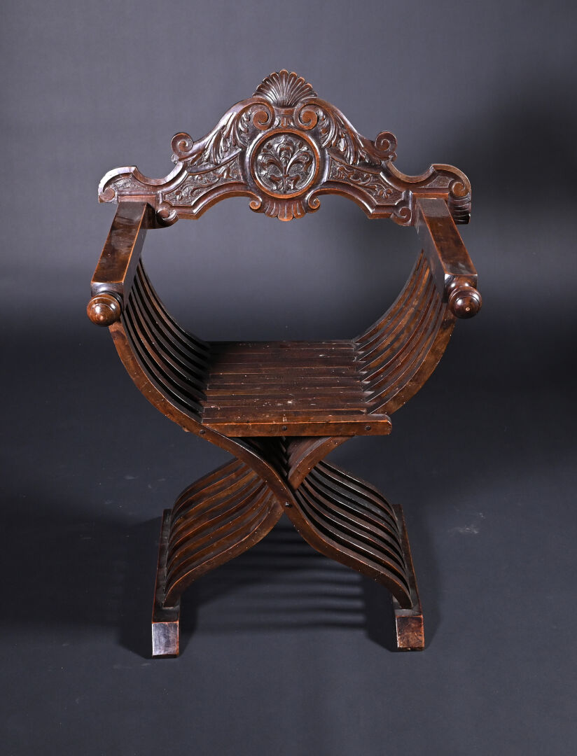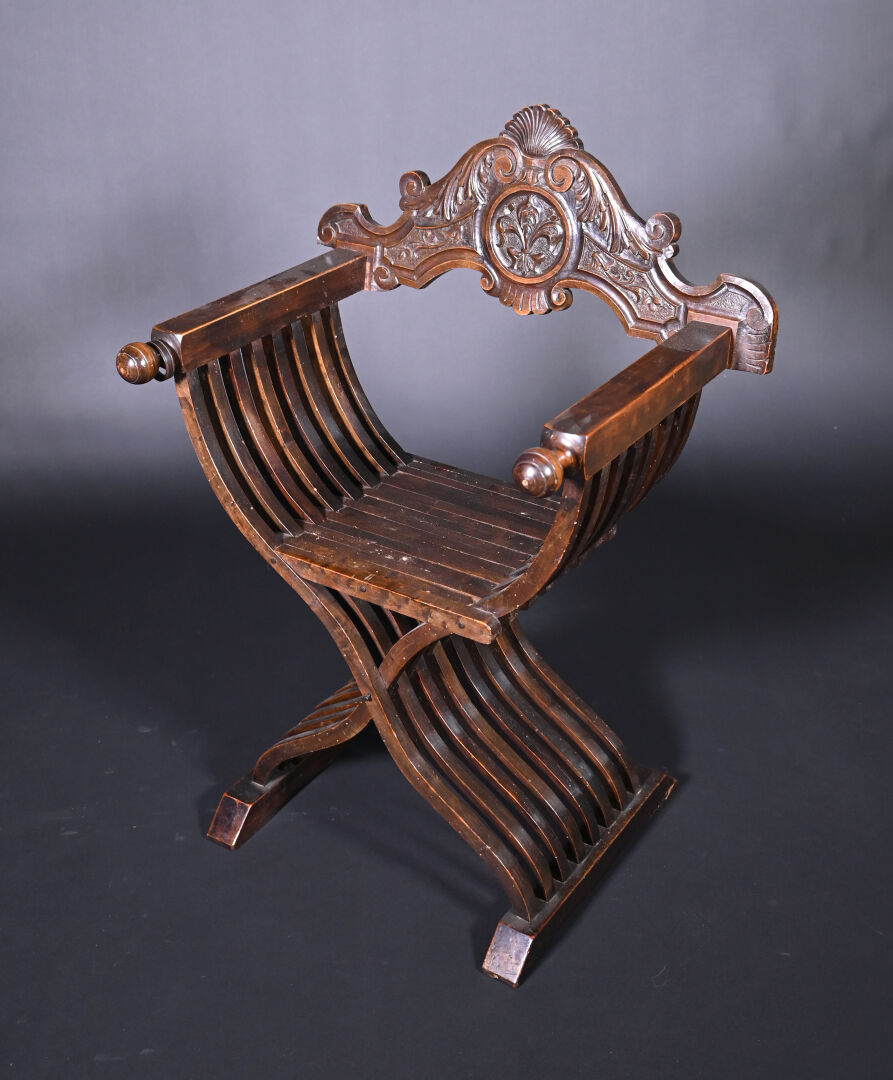 Ensemble soit un fauteuil ployant dit « Dagobert » en bois sculpté (un éclat) et une table à écrire inspirée des tables de changeur en bois teinté, elle ouvre à deux tiroirs en ceinture et repose sur des pieds tournés. Style Haute époque. Dim. table. : Haut. : 80 cm – Larg. : 127 cm – Prof. : 58 cm.