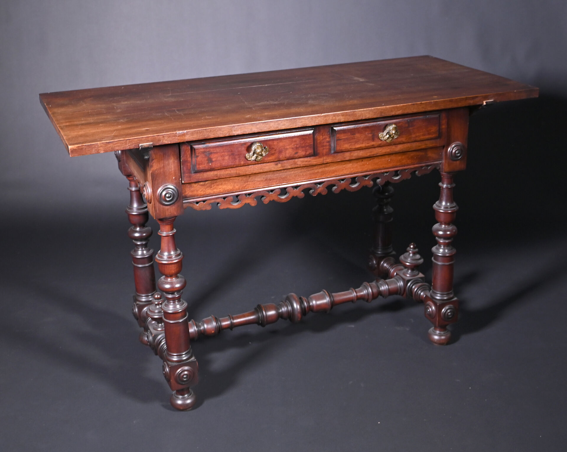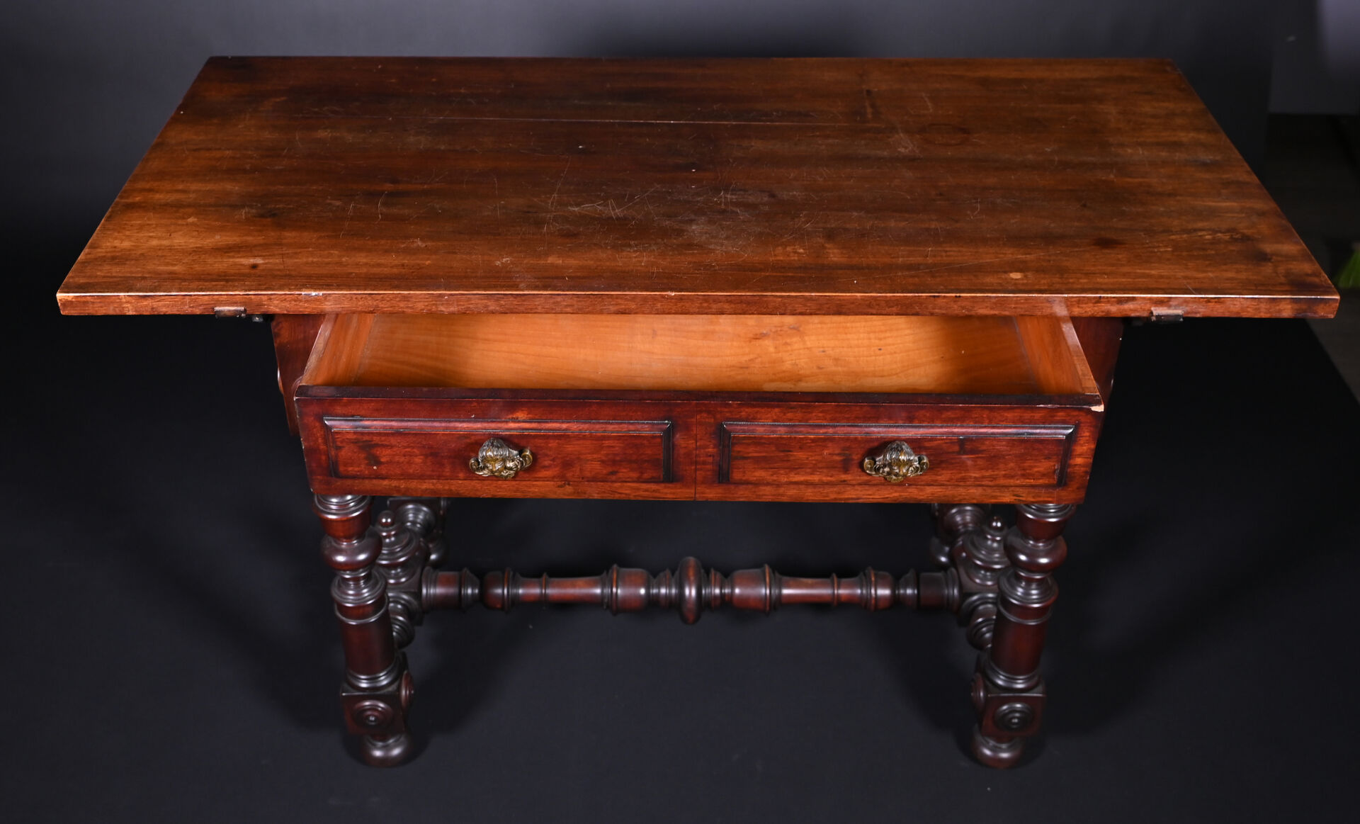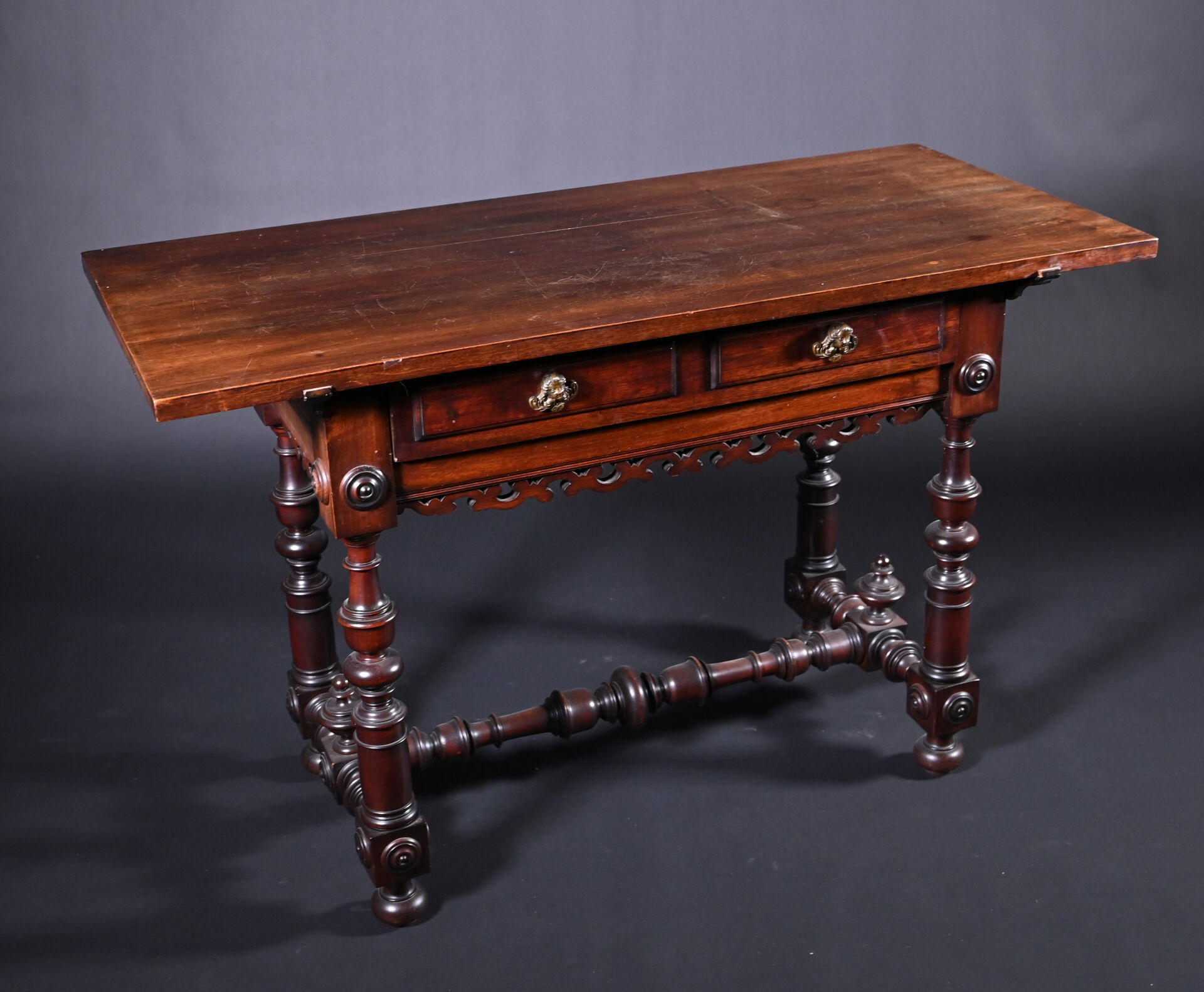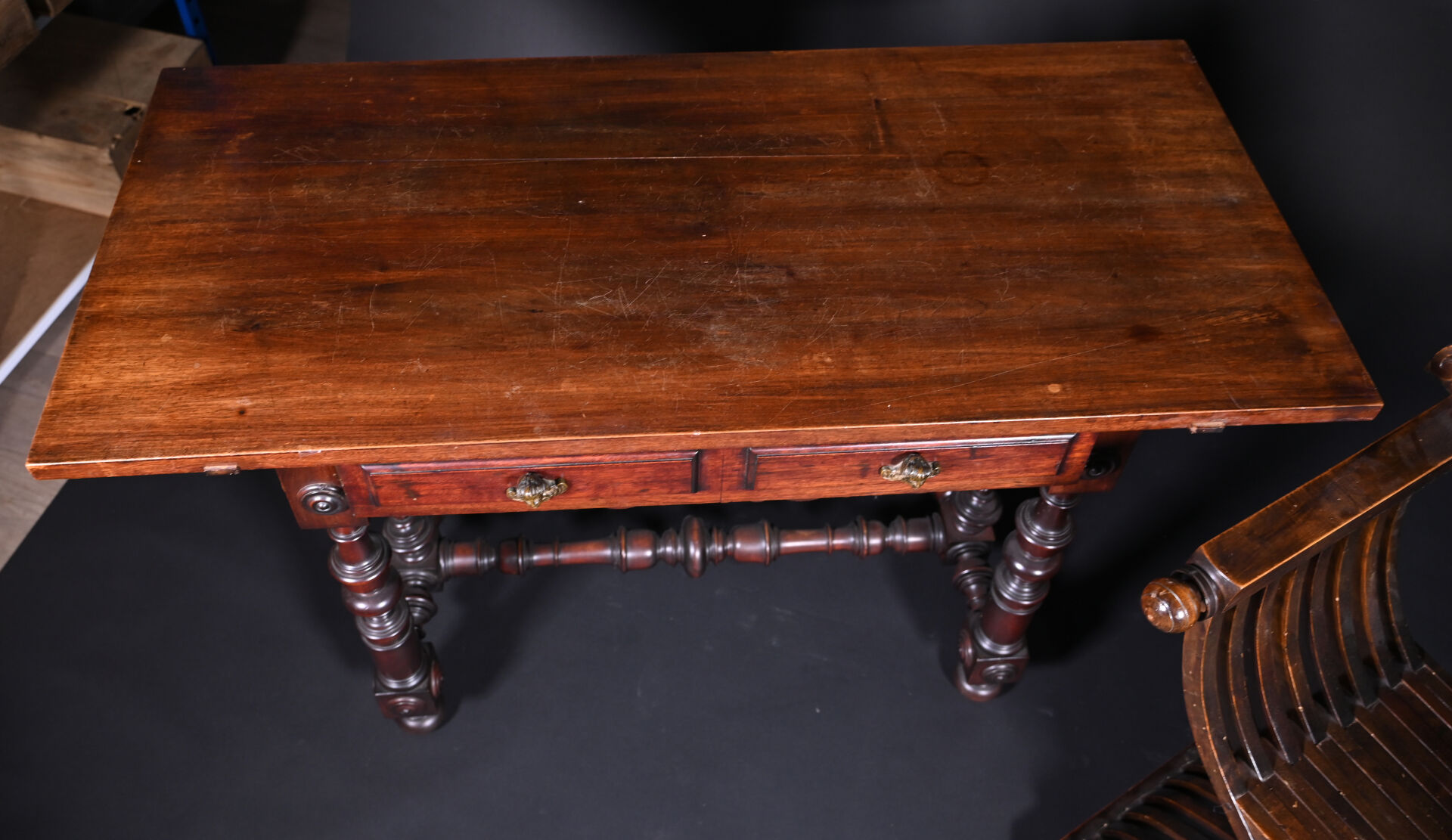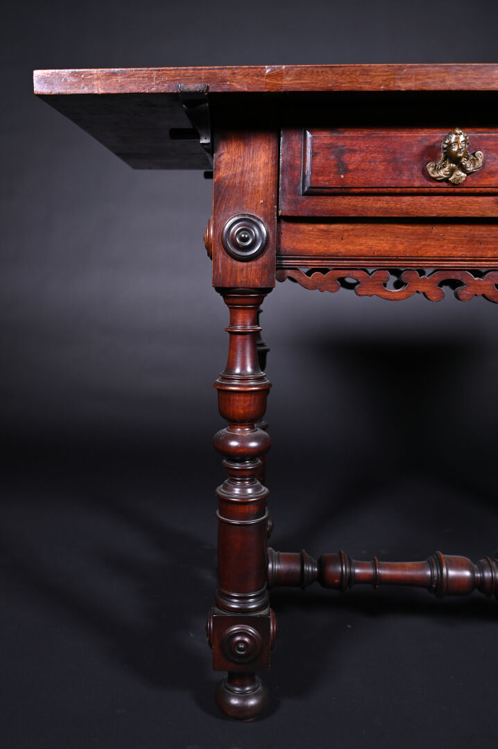 Ensemble soit un fauteuil ployant dit « Dagobert » en bois sculpté (un éclat) et une table à écrire inspirée des tables de changeur en bois teinté, elle ouvre à deux tiroirs en ceinture et repose sur des pieds tournés. Style Haute époque. Dim. table. : Haut. : 80 cm – Larg. : 127 cm – Prof. : 58 cm.