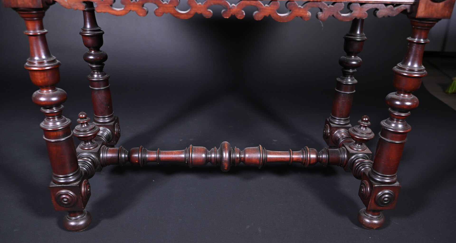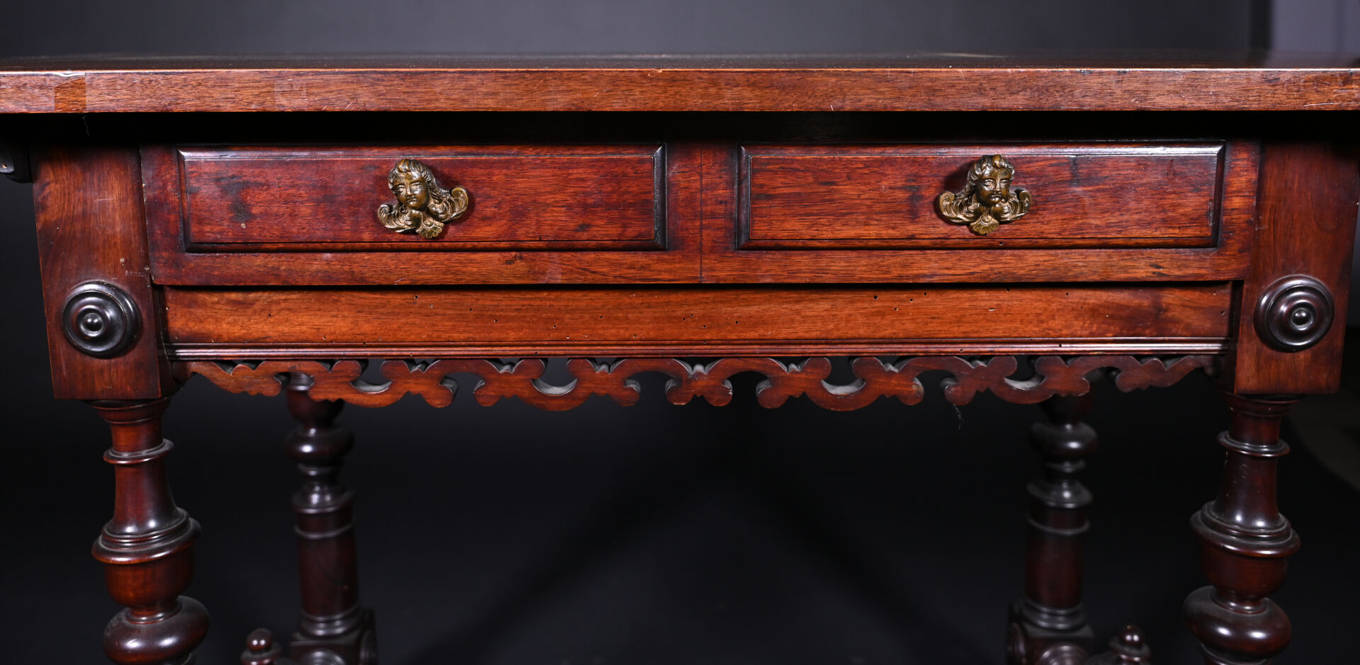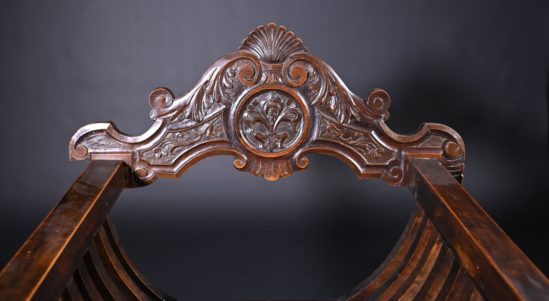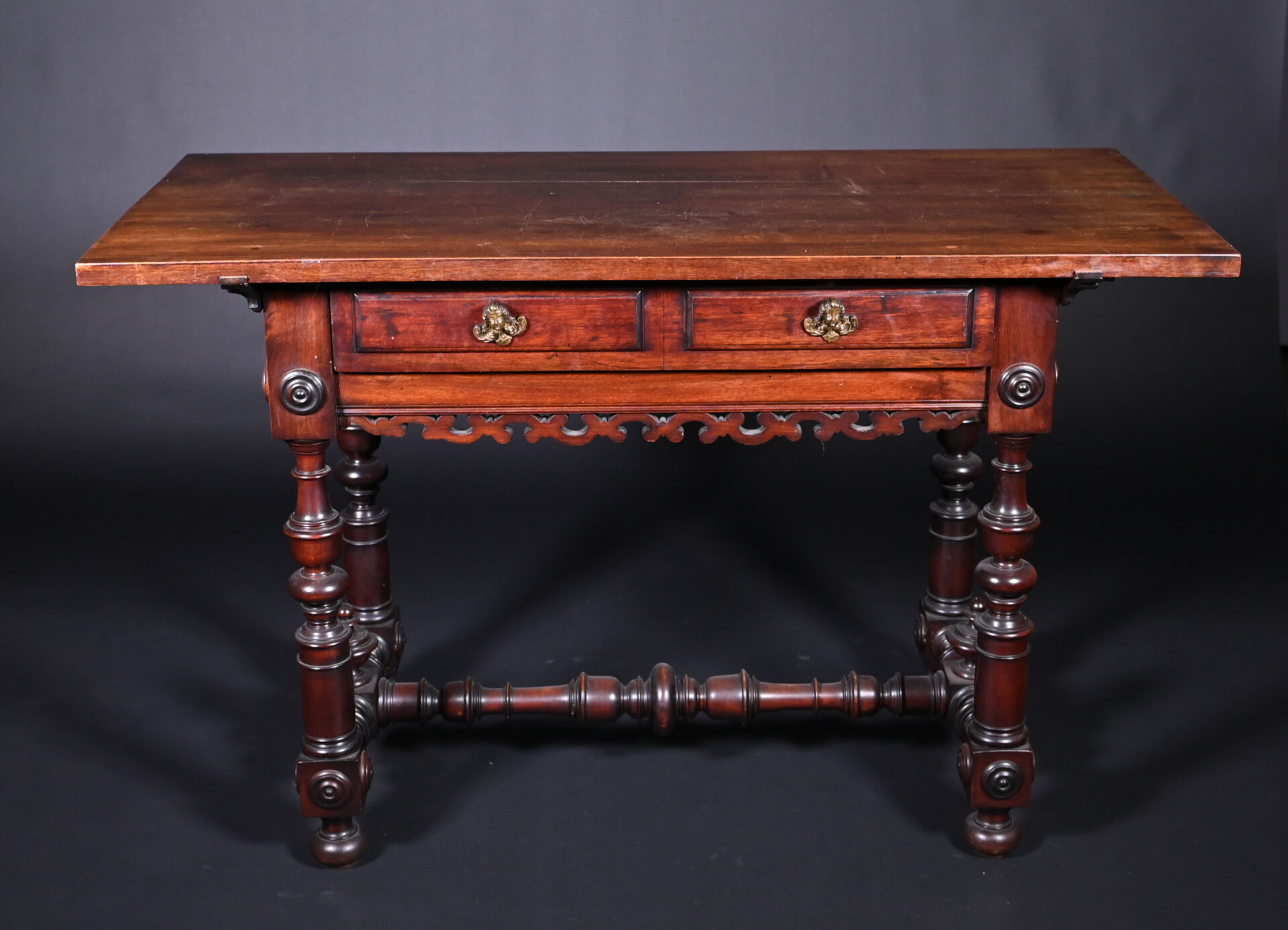 Ensemble soit un fauteuil ployant dit « Dagobert » en bois sculpté (un éclat) et une table à écrire inspirée des tables de changeur en bois teinté, elle ouvre à deux tiroirs en ceinture et repose sur des pieds tournés. Style Haute époque. Dim. table. : Haut. : 80 cm – Larg. : 127 cm – Prof. : 58 cm.