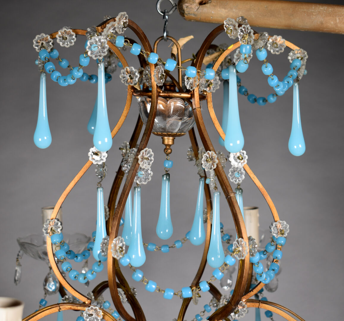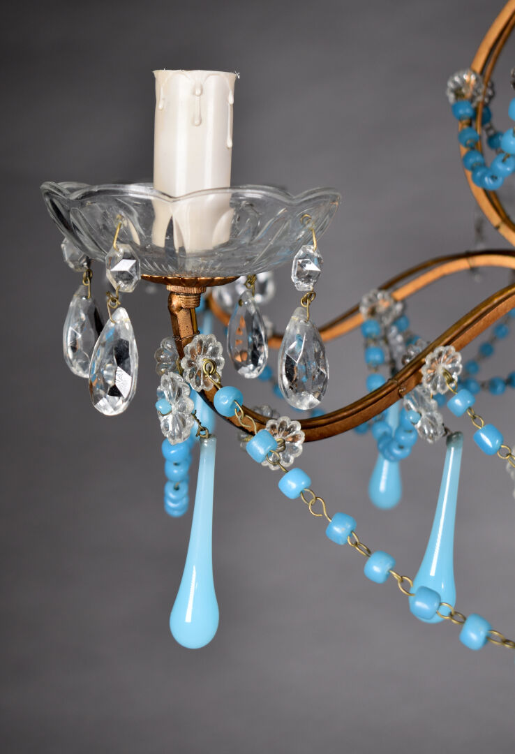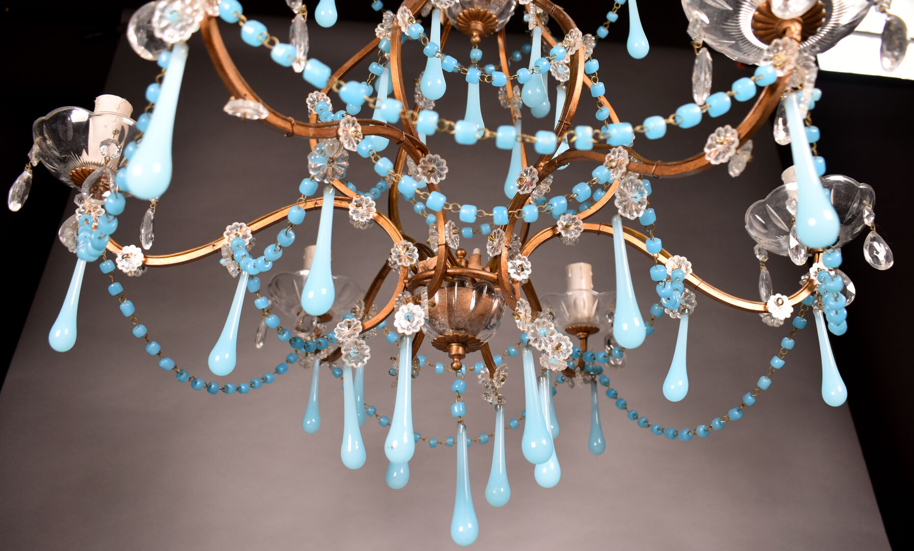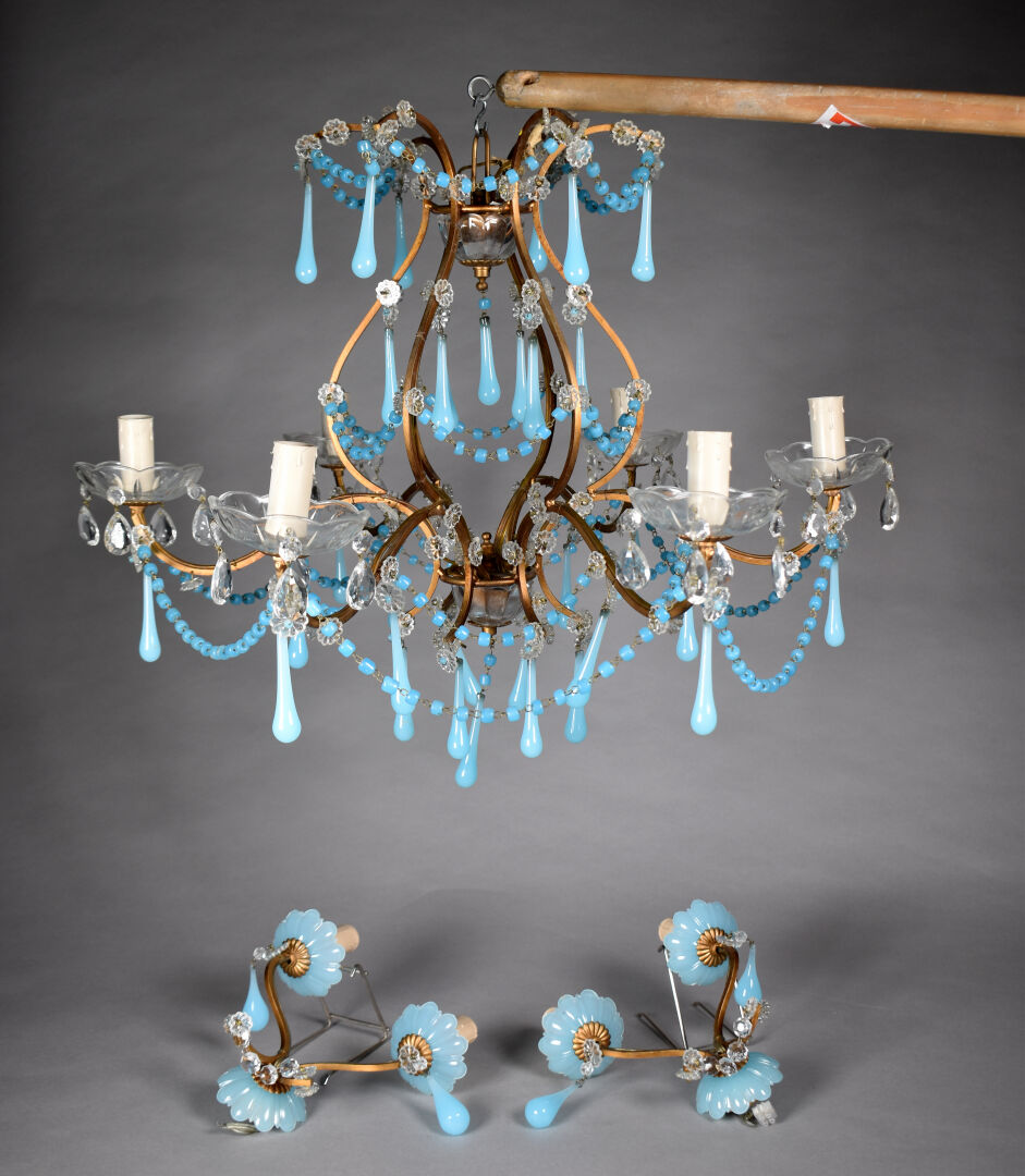 Ensemble soit un lustre à 6 bras de lumière et une paire d’appliques en bronze à pampilles et perles de verre bleu. Murano, XXe siècle. Haut. du lustre : 50 cm.