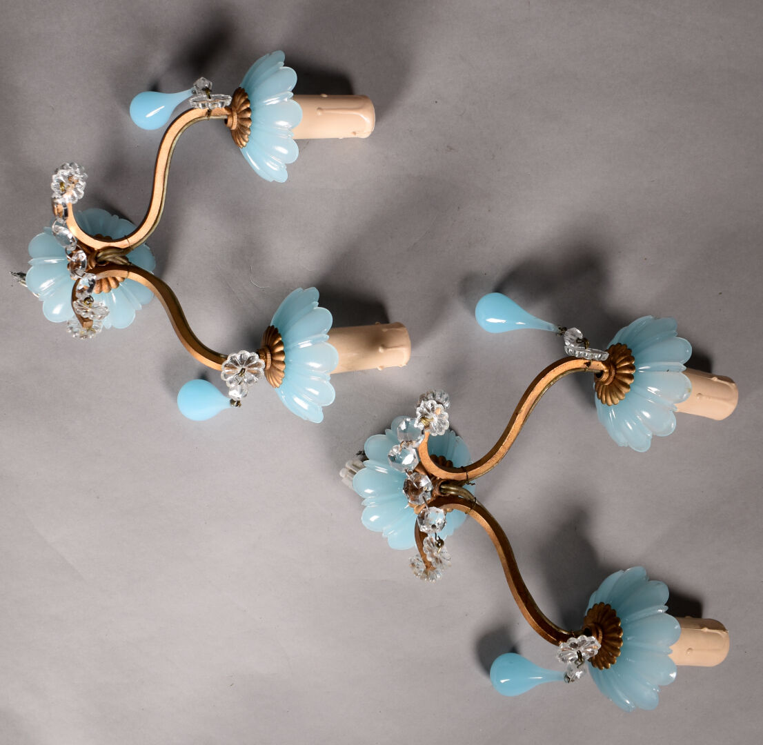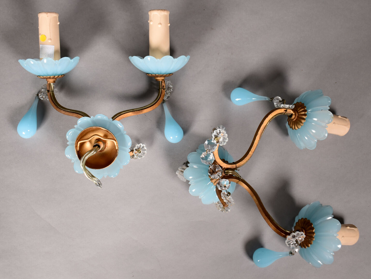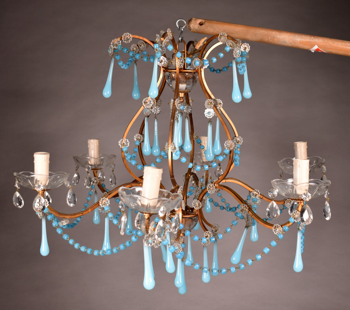Ensemble soit un lustre à 6 bras de lumière et une paire d’appliques en bronze à pampilles et perles de verre bleu. Murano, XXe siècle. Haut. du lustre : 50 cm.