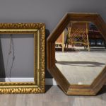 Ensemble soit un miroir octogonal en bois mouluré, un cadre en composition dorée et 10 pièces encadrées soit des gravures, tissu, une peinture sur tissu et un dessin. Dim. du miroir : Haut. : 65 cm – Larg. : 53 cm.