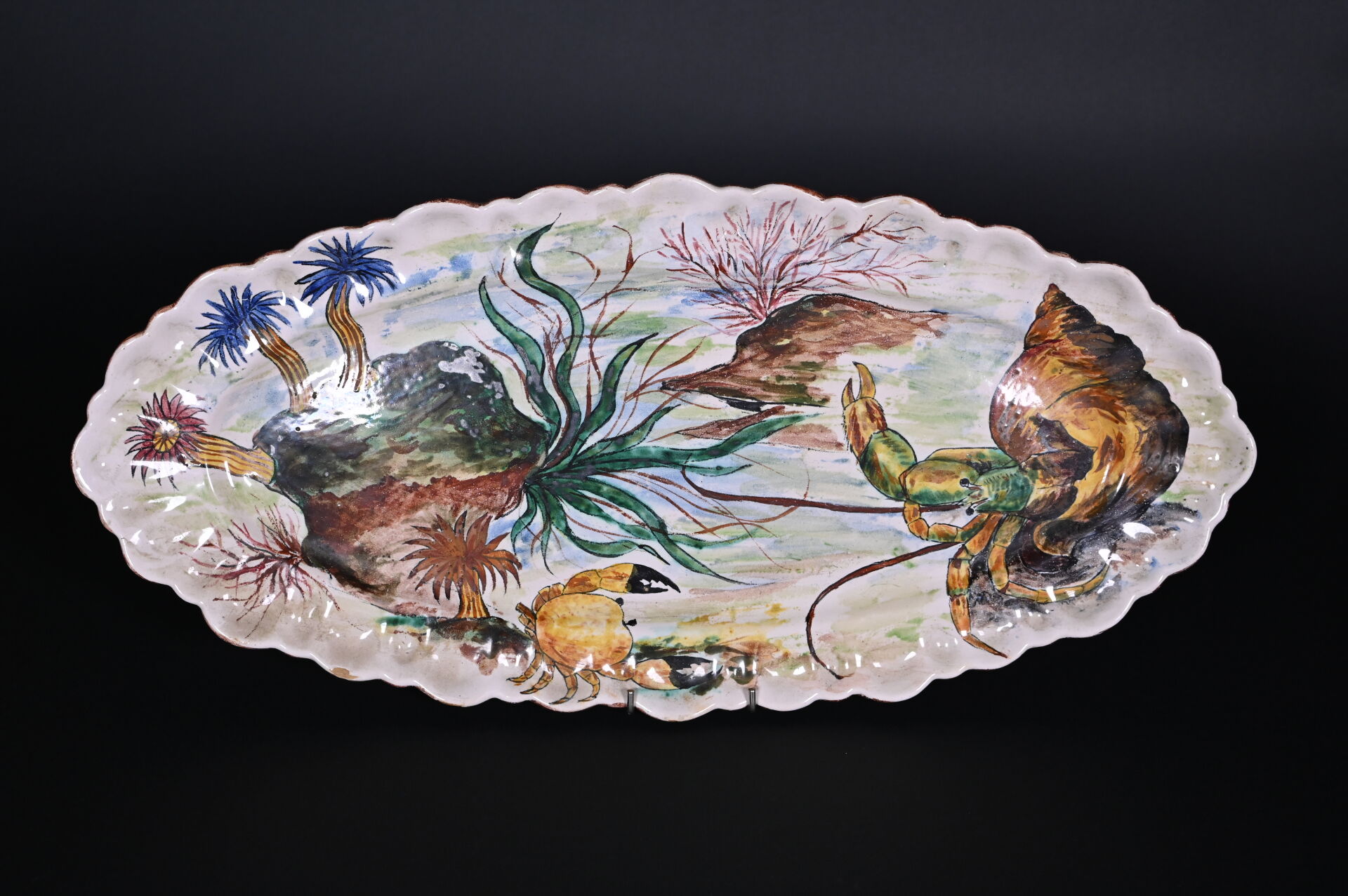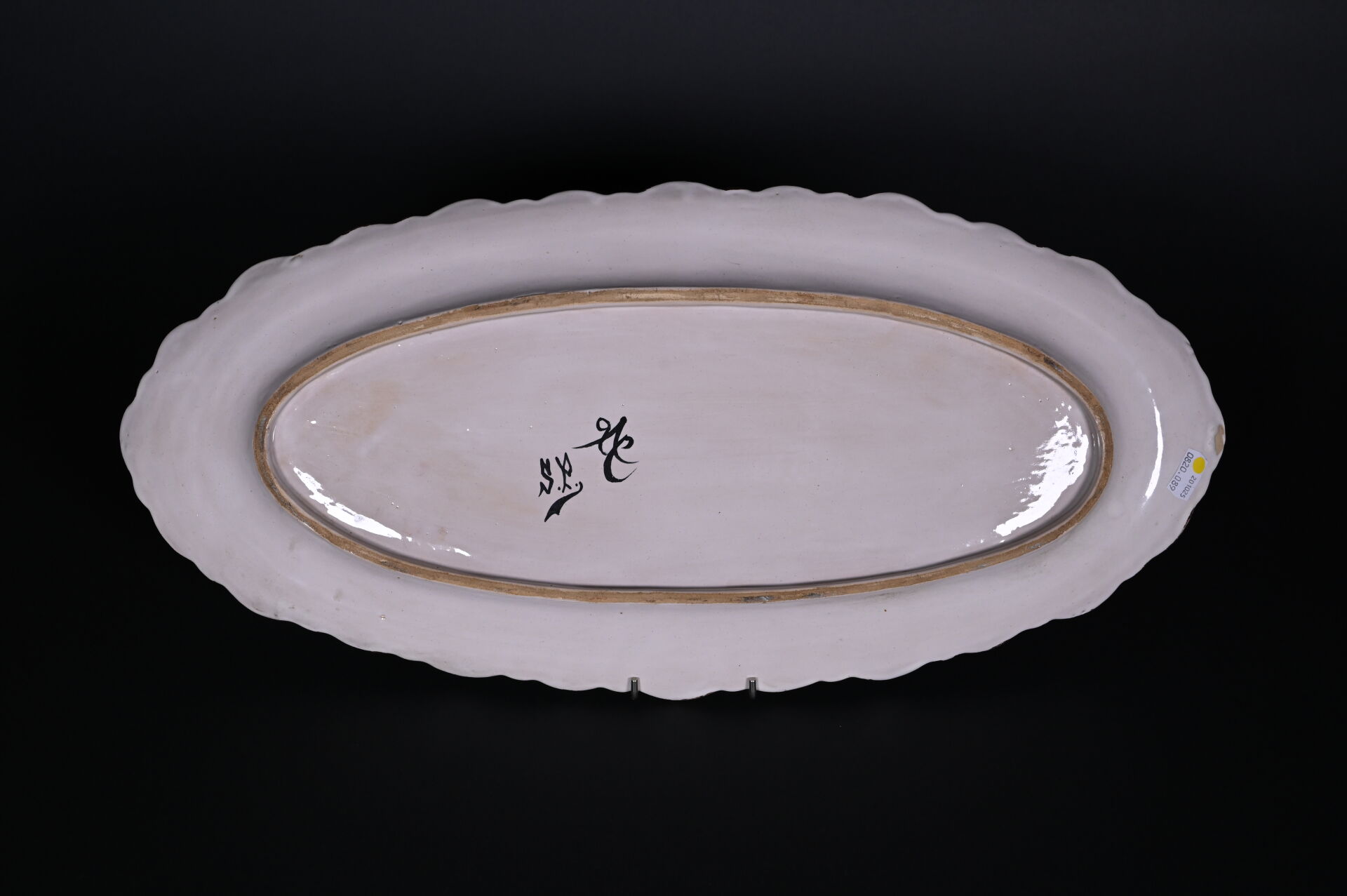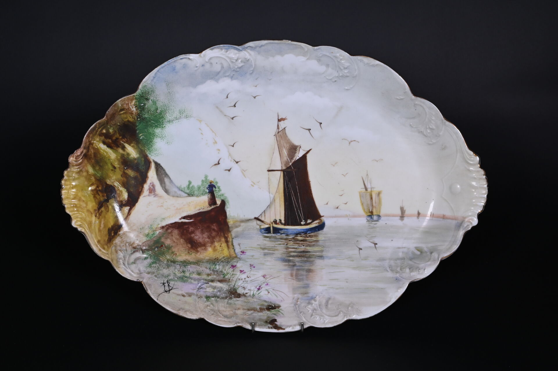 Ensemble soit un plat et un médaillon en porcelaine à décor peint d’une scène à l’antique et d’un paysage au bateau. Limoges, XXe siècle. DiM du grand plat : 51 x 35 cm. On joint un plat à poisson en faïence à décor d’un fond marin.
