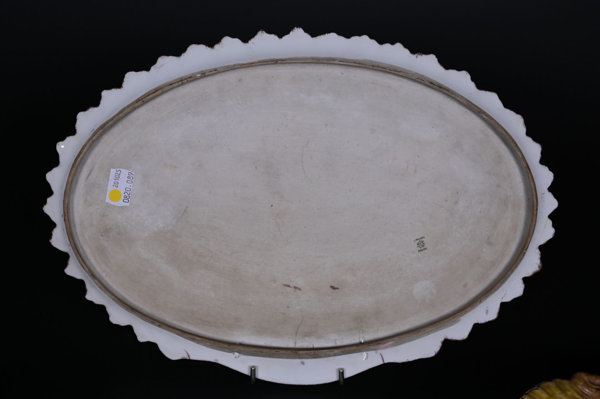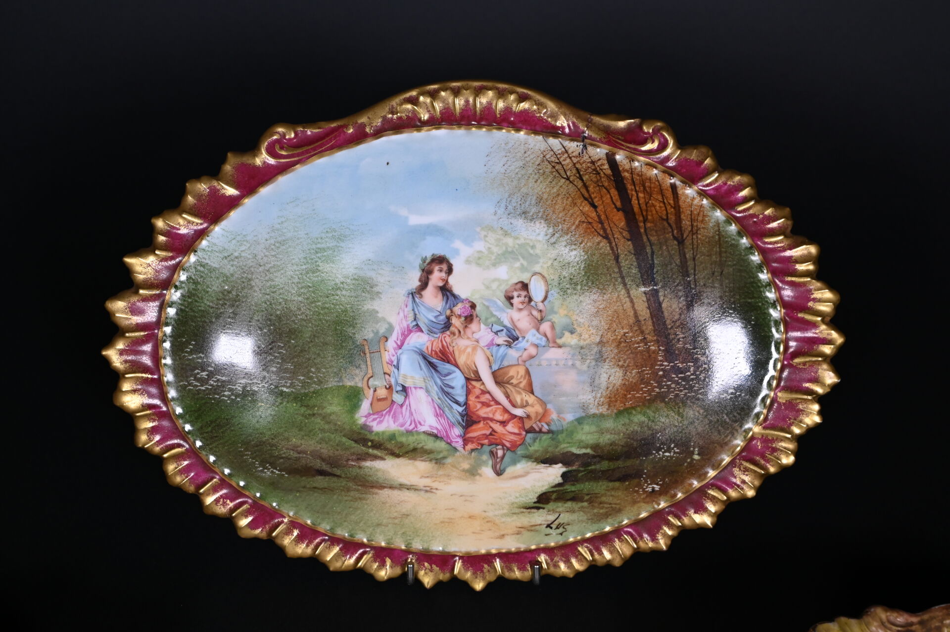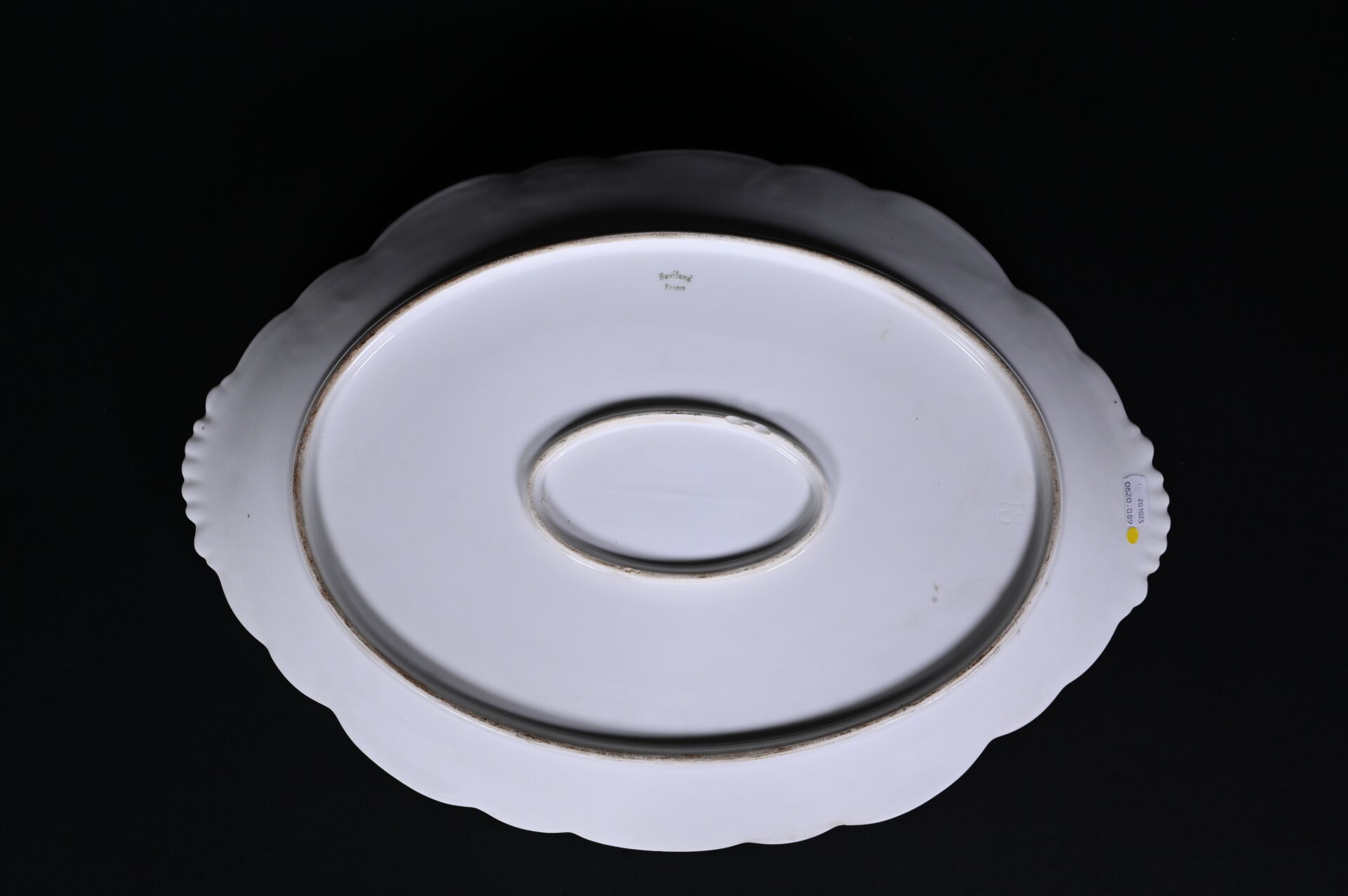 Ensemble soit un plat et un médaillon en porcelaine à décor peint d’une scène à l’antique et d’un paysage au bateau. Limoges, XXe siècle. DiM du grand plat : 51 x 35 cm. On joint un plat à poisson en faïence à décor d’un fond marin.