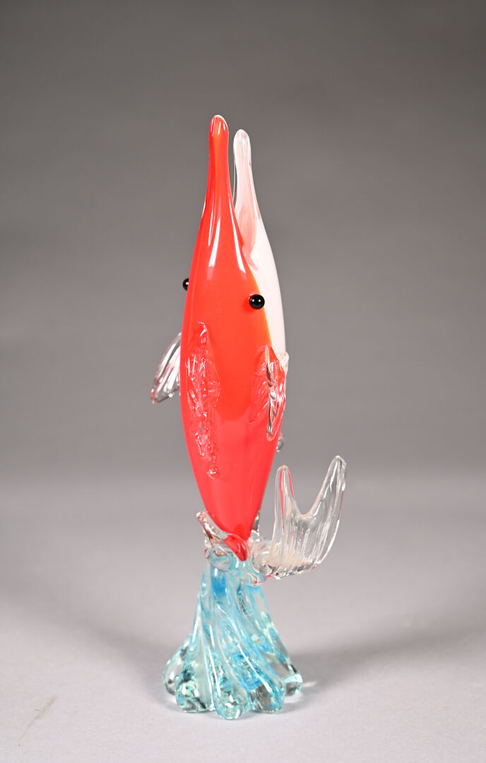 Ensemble soit un poisson en verre de Murano polychrome, un canard en verre à paillons argent. Haut. du poisson : 30,5 cm.