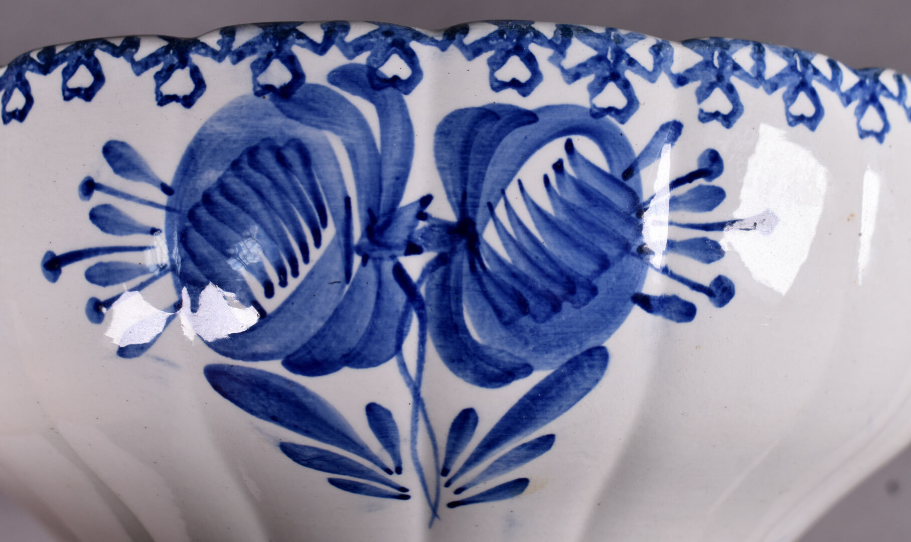 Ensemble soit un saladier en faïence de Longwy, un plat à poisson en barbotine d’époque Art Nouveau et une assiette émaillée représentant la bête du Gevaudan en polychromie sur fond noir. Etiquette au dos de 1956. Diam. assiette : 21 cm. On joint un panier.