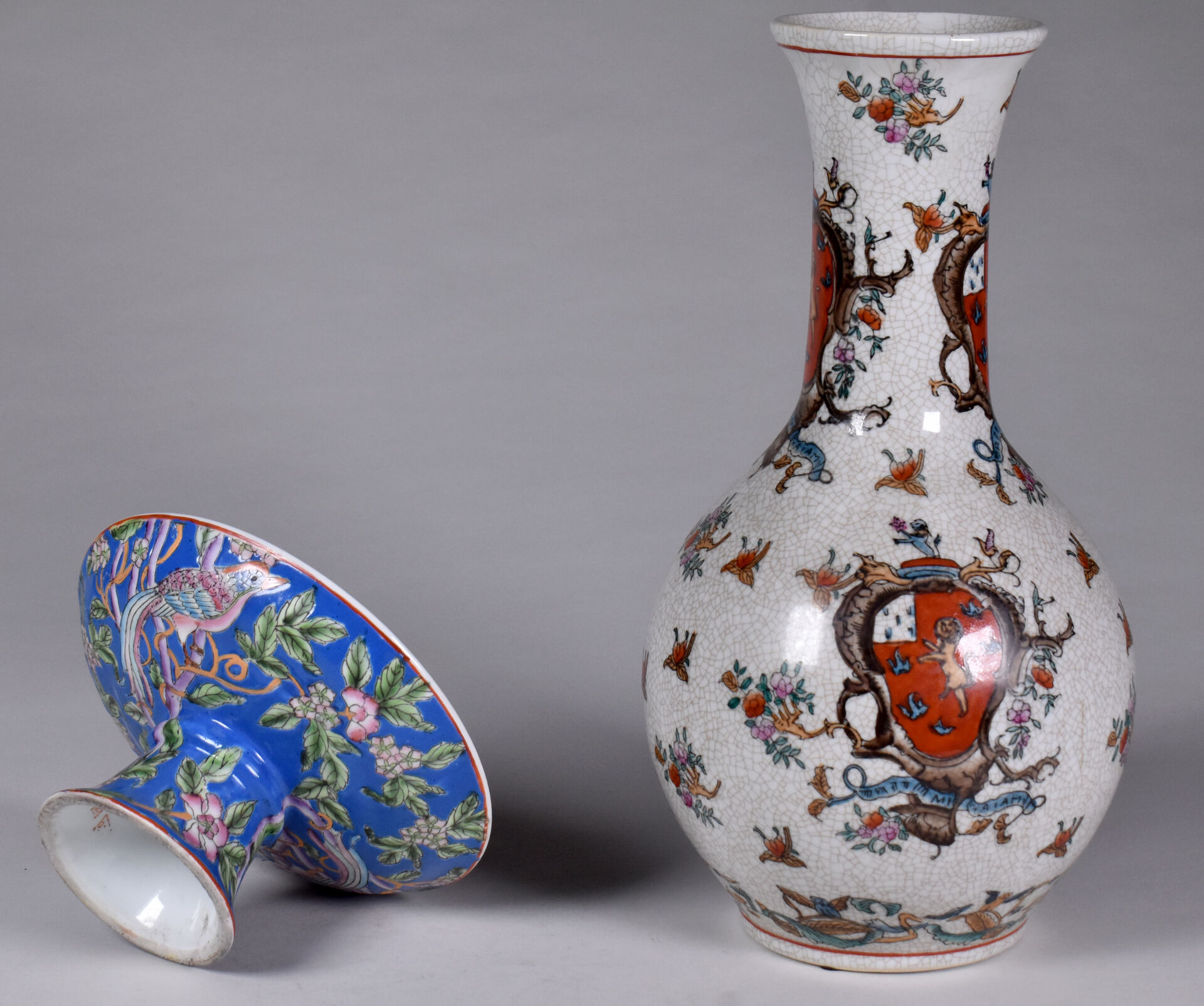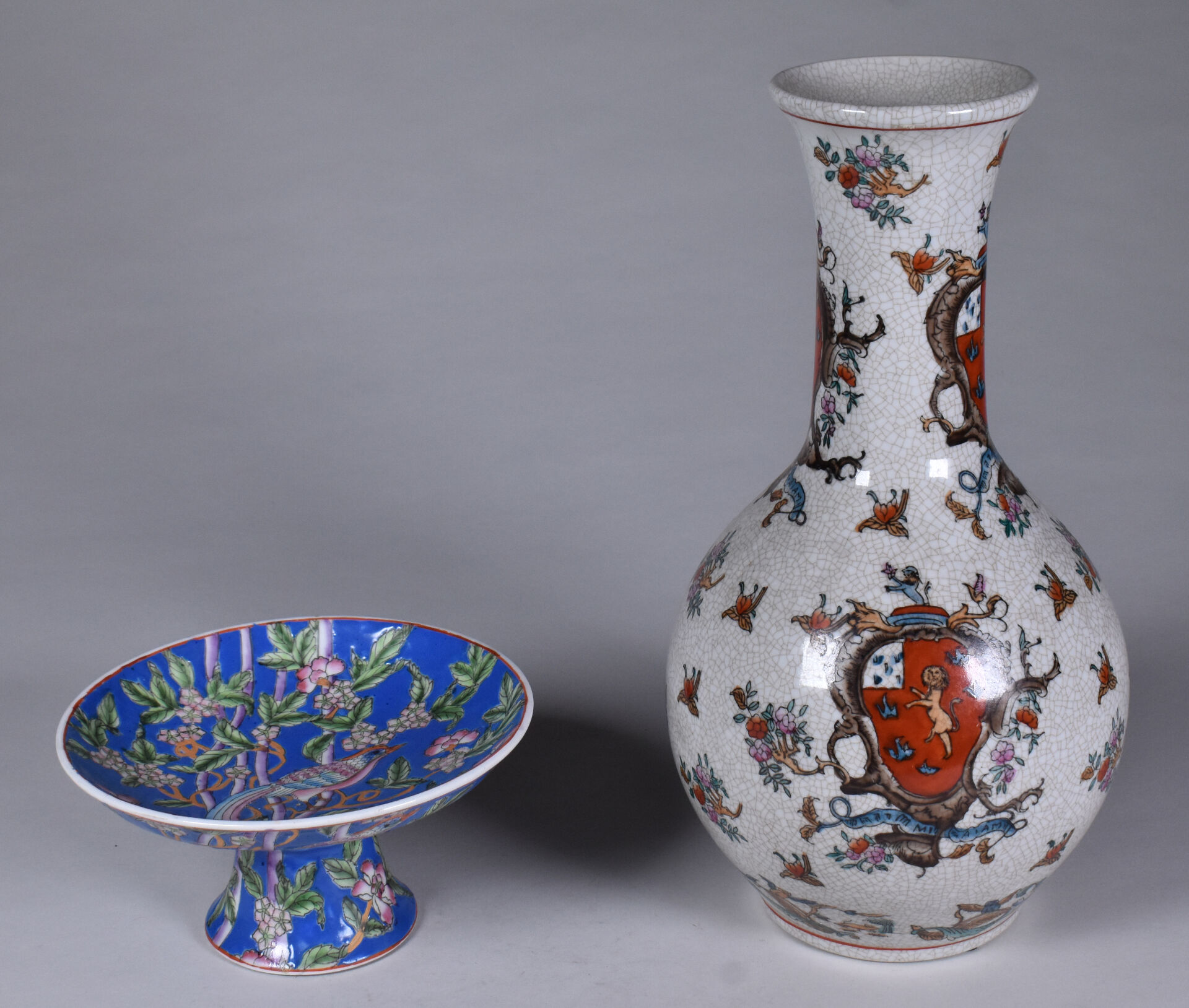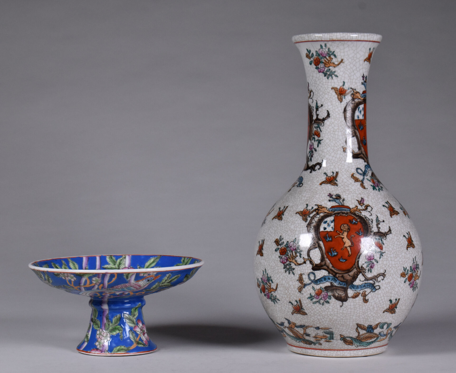 Ensemble soit un vase bulbe en faïence craquelée à décor de blason et semi de fleurs et un compotier en faïence à décor émaillé en polychromie d’oiseaux branchés. Chine ? XXe siècle. Haut. : 35 cm – Haut. : 10 cm.