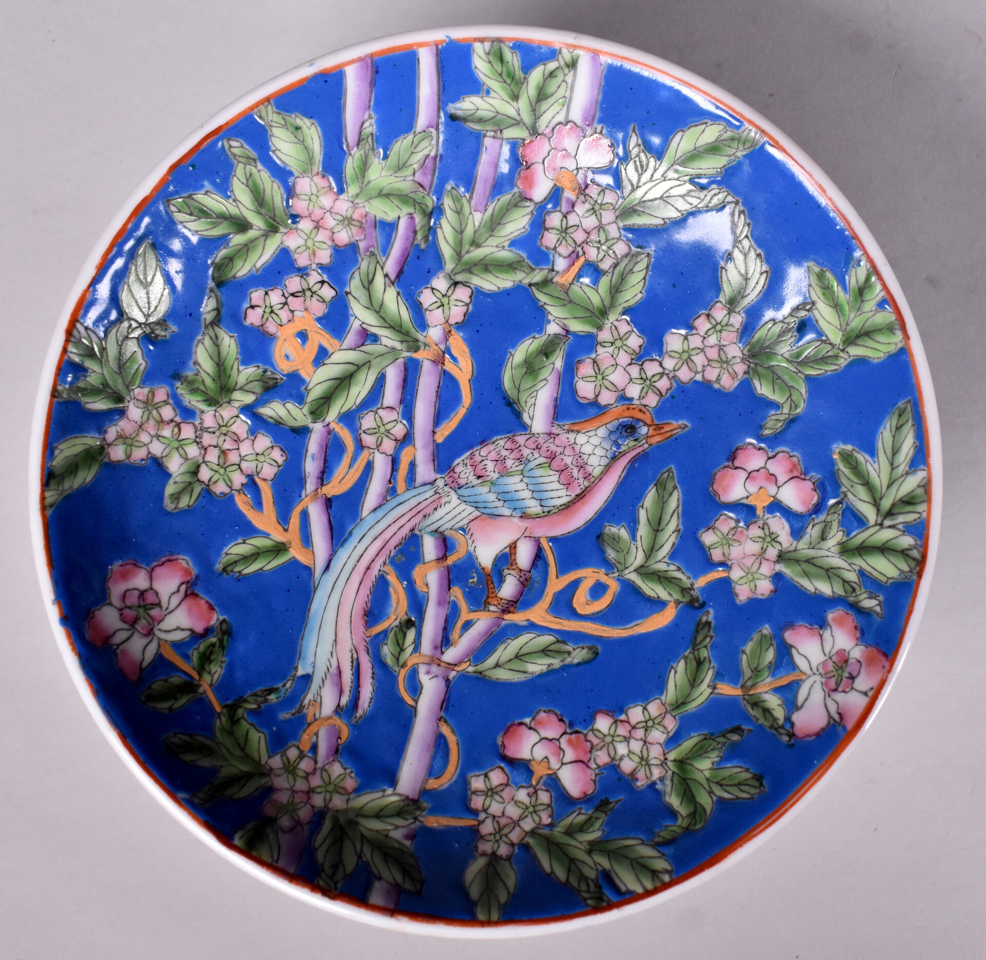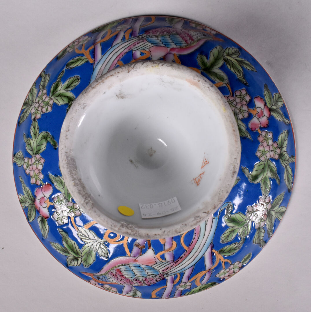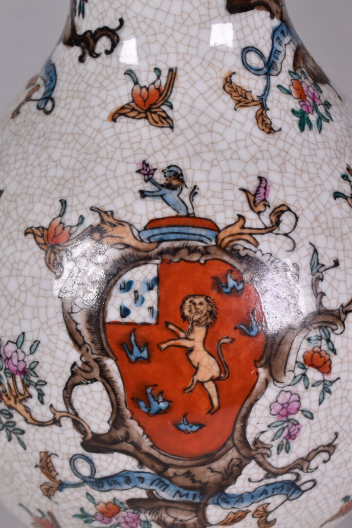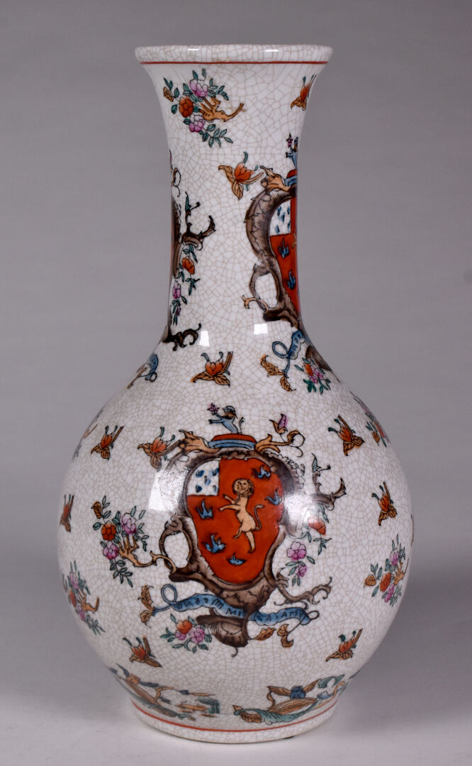 Ensemble soit un vase bulbe en faïence craquelée à décor de blason et semi de fleurs et un compotier en faïence à décor émaillé en polychromie d’oiseaux branchés. Chine ? XXe siècle. Haut. : 35 cm – Haut. : 10 cm.