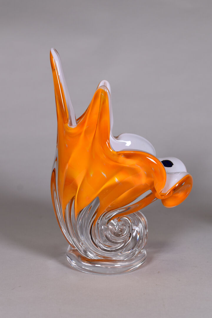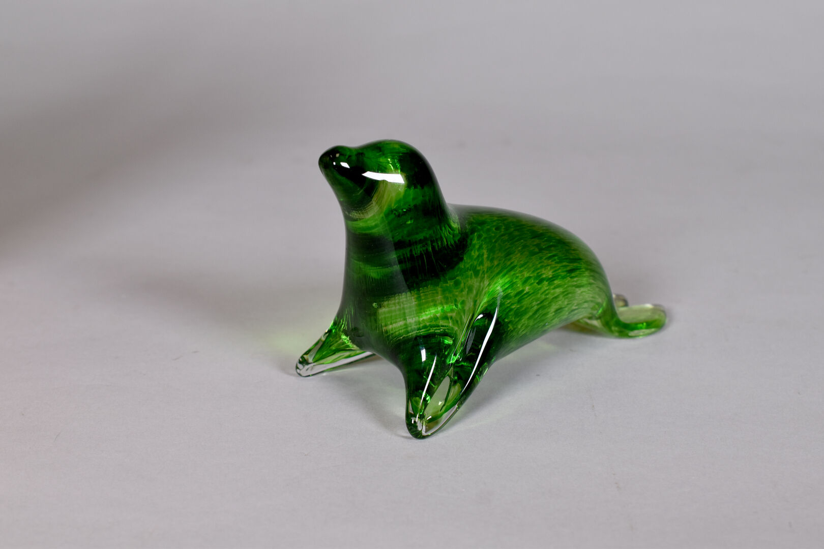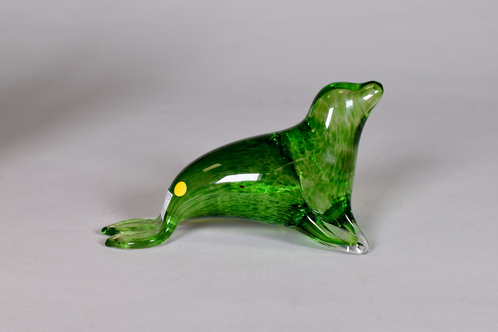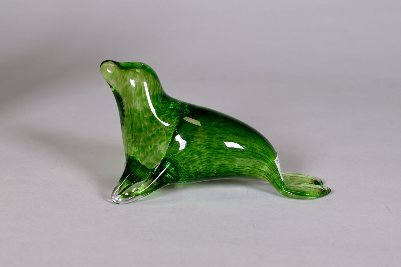 Ensemble soit un vide poche en cristal clair et orange figurant un coquillage (Bohème) et une otarie en cristal vert (Wedgewood). Haut. du vide poche. : 24 cm.