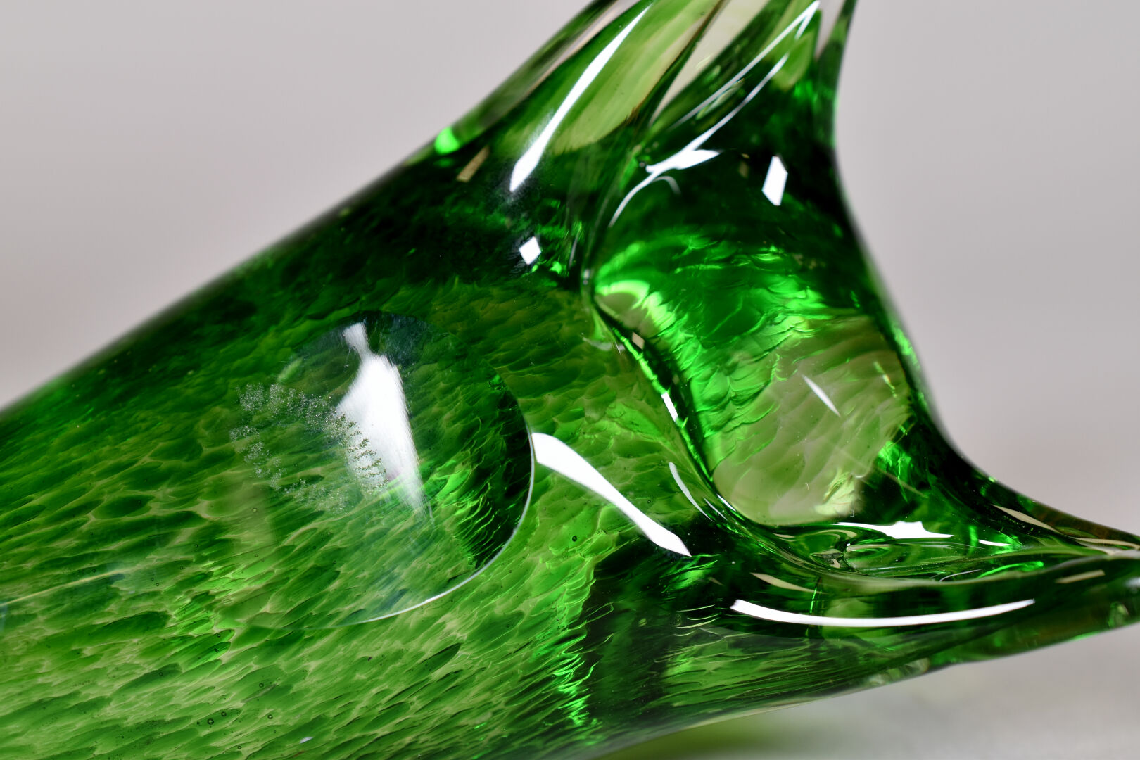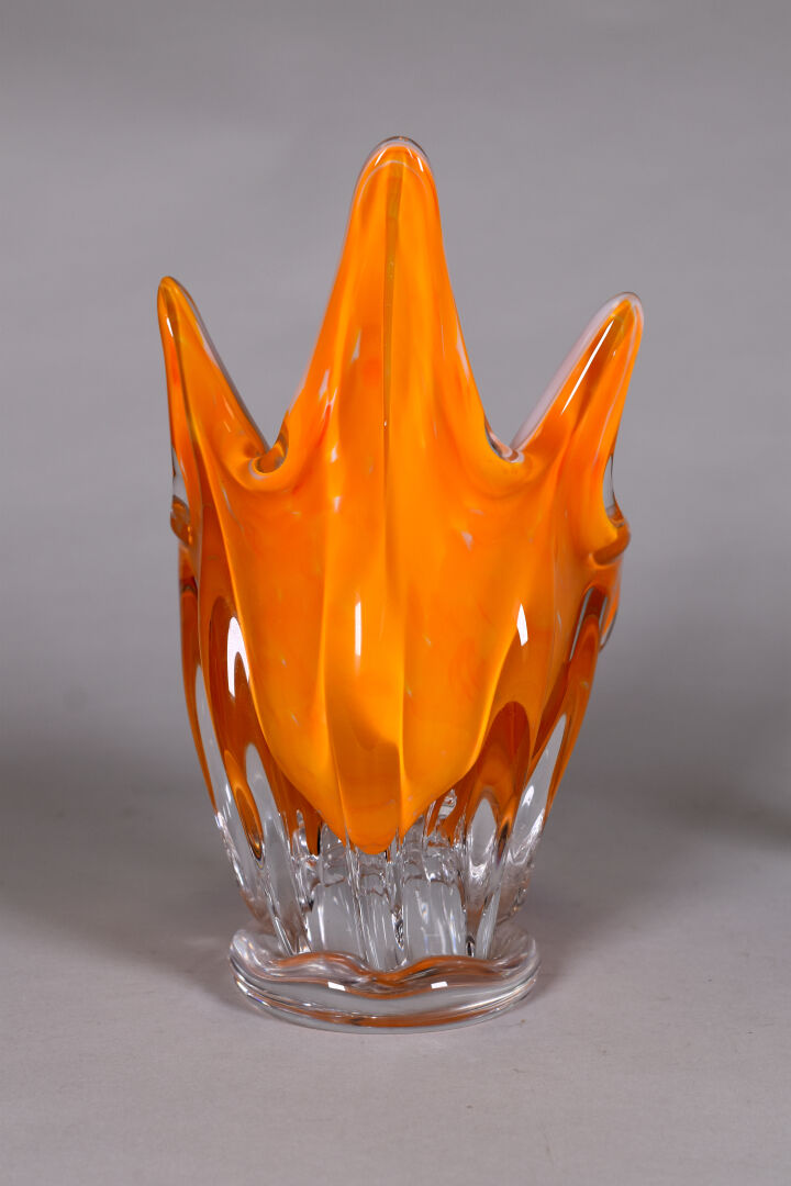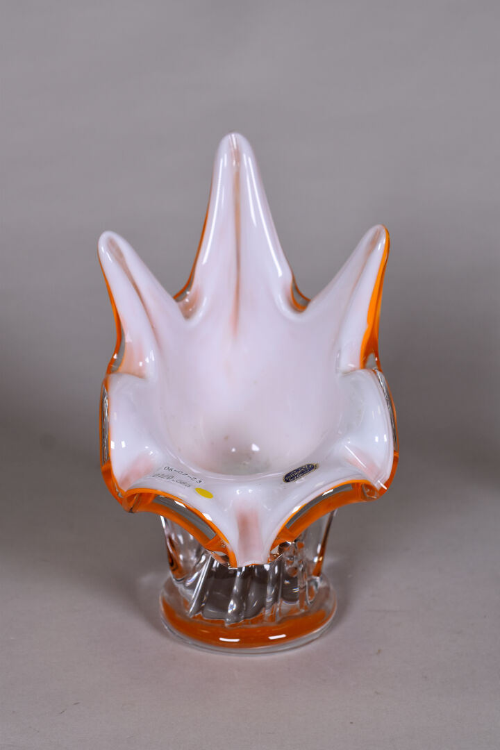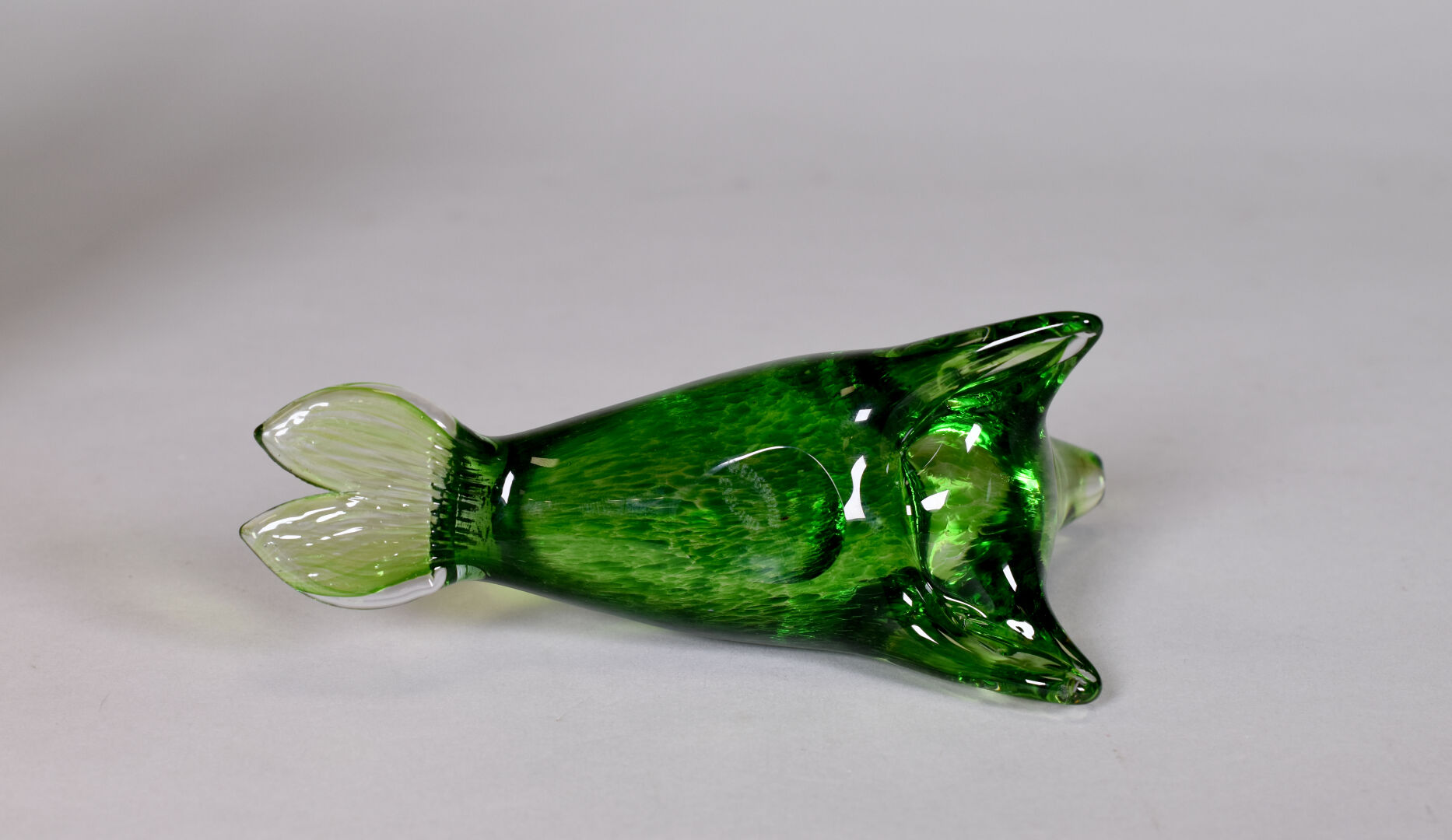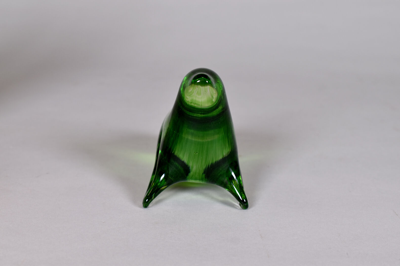 Ensemble soit un vide poche en cristal clair et orange figurant un coquillage (Bohème) et une otarie en cristal vert (Wedgewood). Haut. du vide poche. : 24 cm.
