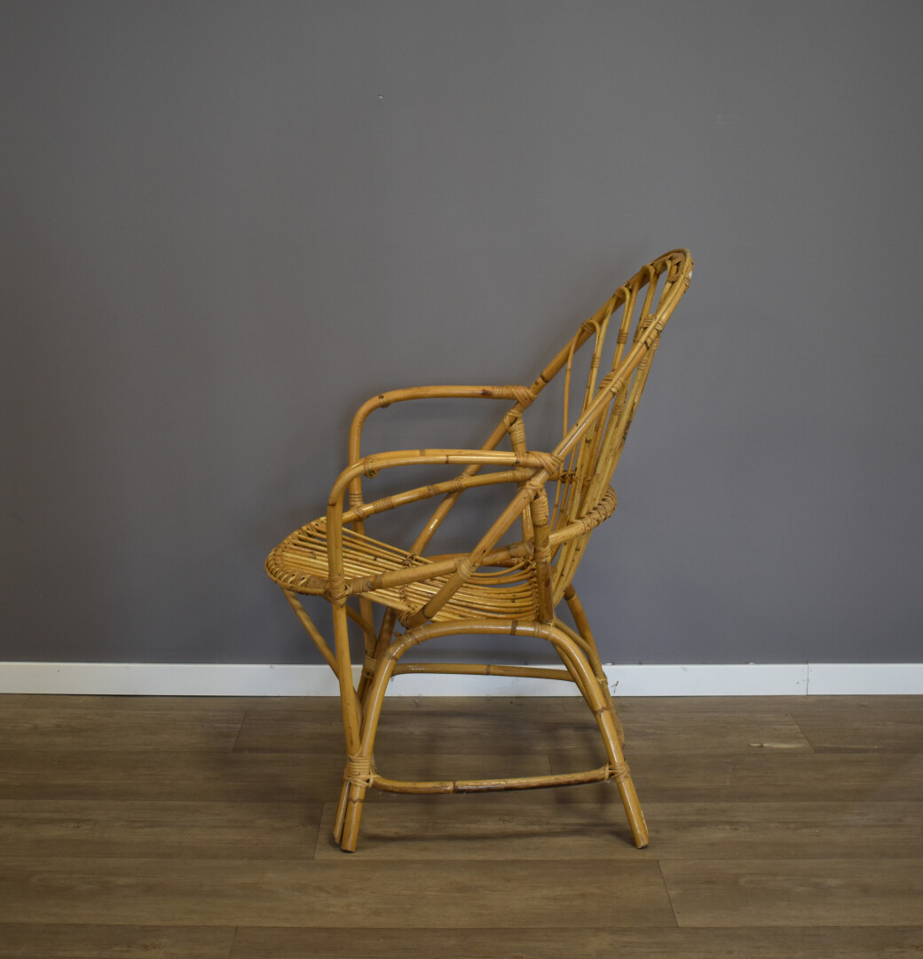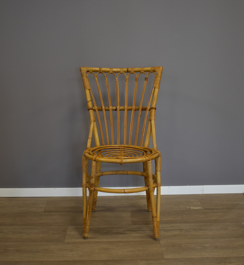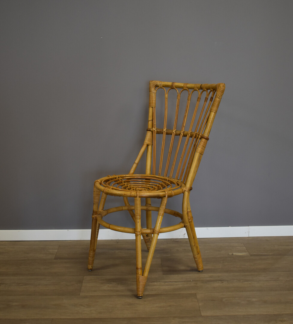 Ensemble soit une chaise et un fauteuil en rotin. Milieu du XXe siècle. Haut. chaise : 88,5 cm.