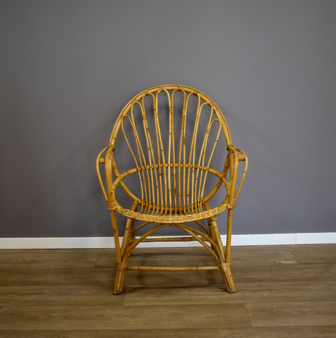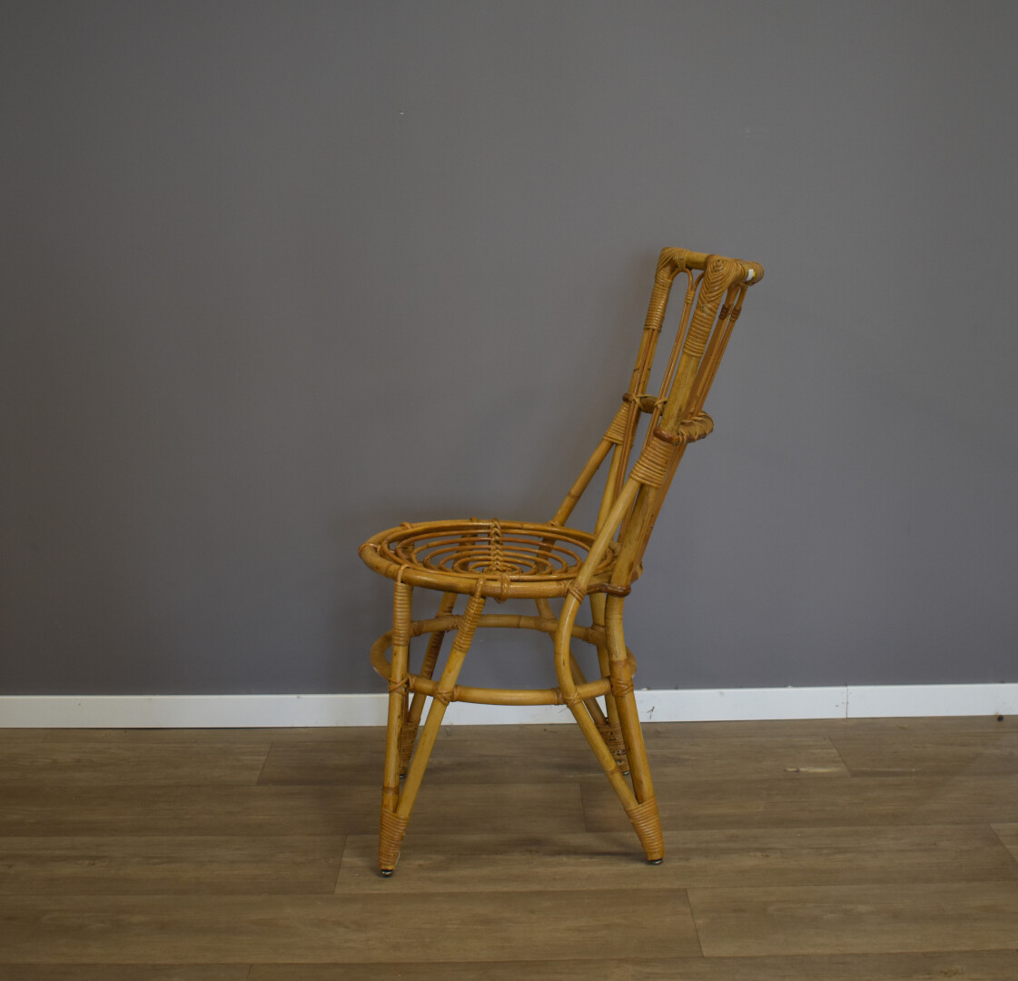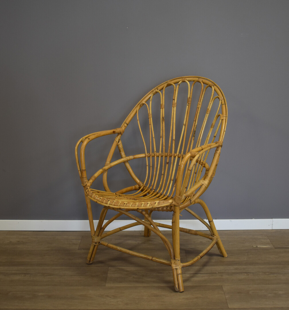 Ensemble soit une chaise et un fauteuil en rotin. Milieu du XXe siècle. Haut. chaise : 88,5 cm.