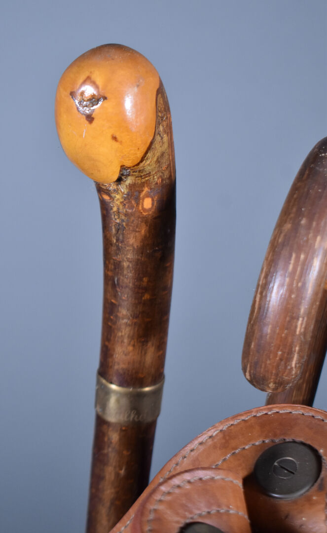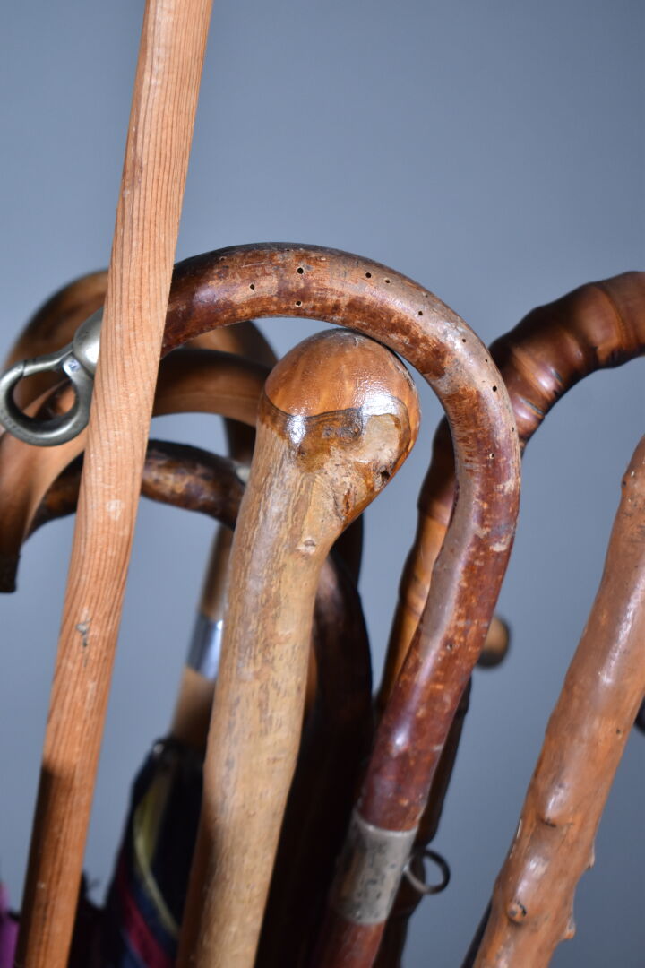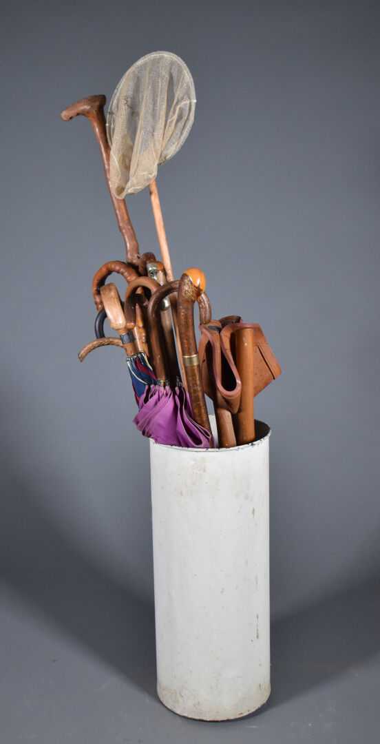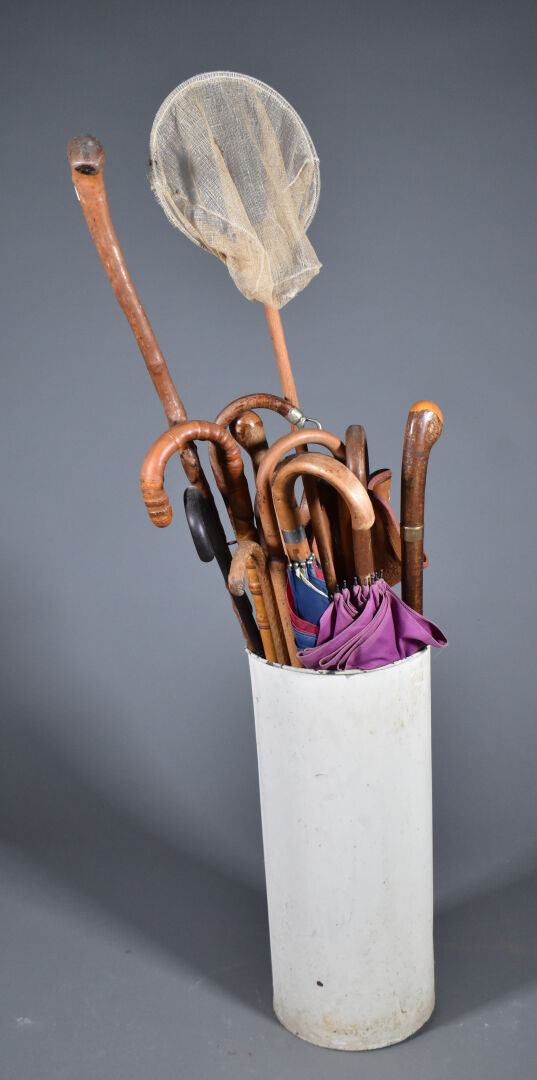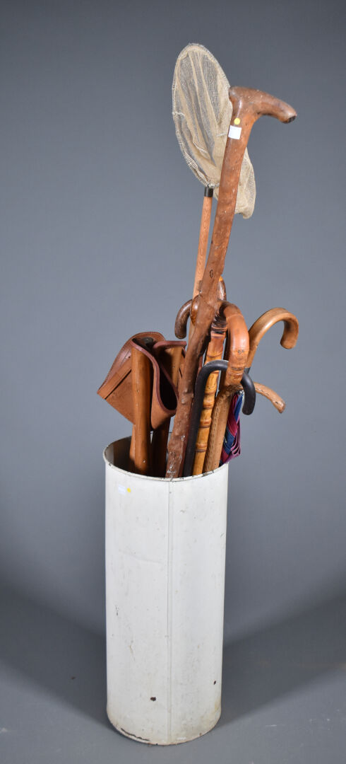 Ensemble soit une collection de cannes, parapluies, épuisette, tabouret de voyage.